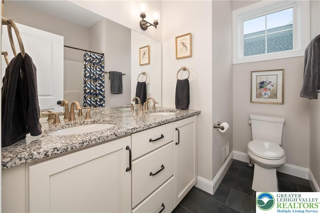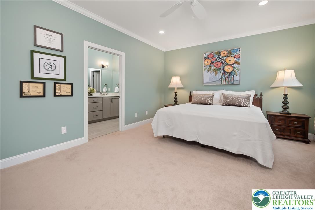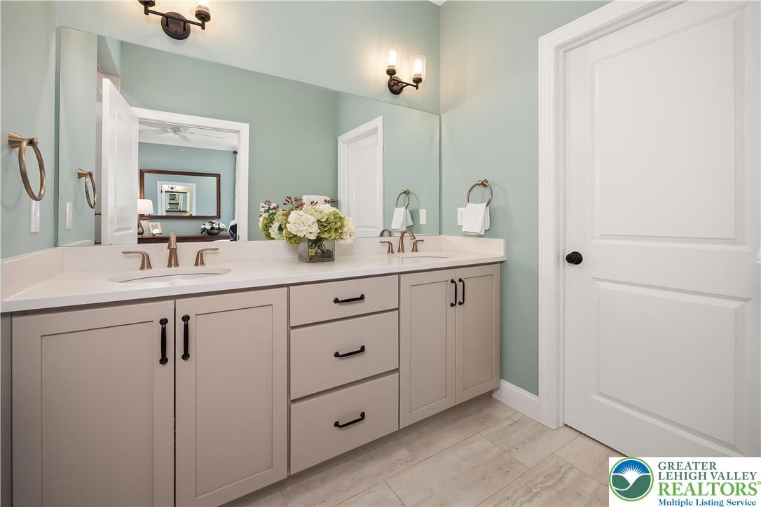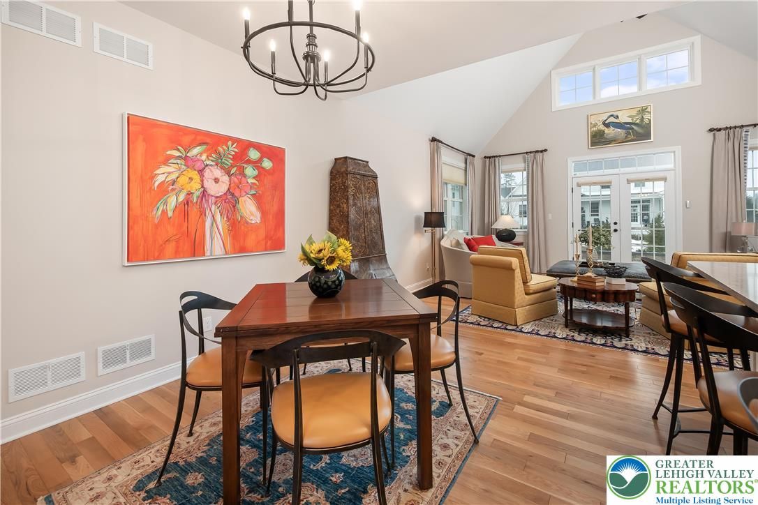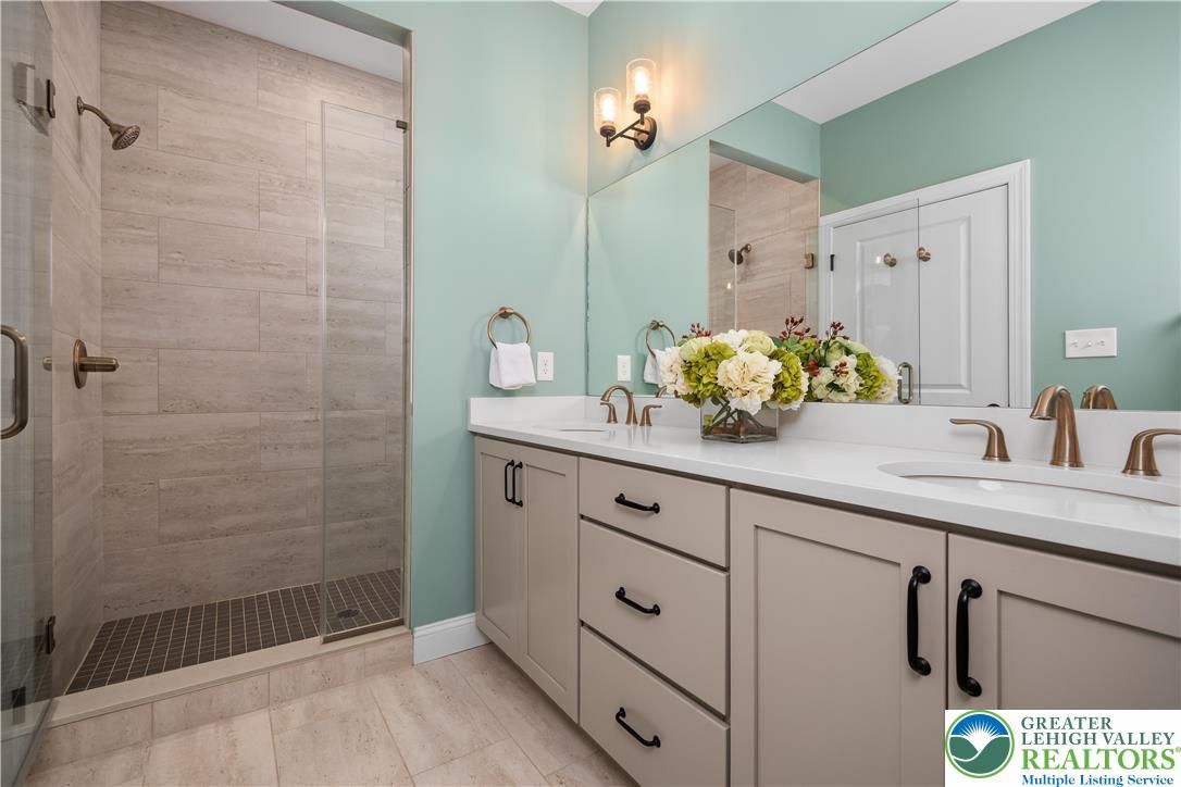 Discover the pinnacle of active adult living at THE COTTAGES AT OLD SAUCON, an exclusive gated community of just 80 homes. This stunning RANCH-STYLE residence sits perfectly in the COMPLETED PHASE 1. Featuring a timeless stone facade combined with JAMES HARDIE SIDING, this home offers a rare combination of luxury and location directly across from the prestigious Saucon Valley Country Club. Inside this meticulously maintained 3-bedroom, 2.5-bathroom home, every detail has been elevated with premium upgrades. The heart of the home is a GOURMET KITCHEN boasting elegant QUARTZ COUNTERTOPS, a large island, and high-end cabinetry. The living space flows into an EXPANDED GREAT ROOM bump-out with VAULTED CEILINGS, designed to maximize comfort and natural light. The primary suite serves as a true sanctuary, featuring a SPA-INSPIRED BATH and generous closet space. Beyond the interior, the community’s social fabric is woven with scenic walking trails and manicured common areas that foster a quiet charm. Step outside to your private oasis featuring a PREMIUM PATIO protected by a RETRACTABLE AWNING, perfect for sunset views. The 2-car garage is equally impressive with professionally finished EPOXY FLOORS. Enjoy a true maintenance-free lifestyle with a low $395/month HOA fee that covers lawn care, landscaping, and snow removal, trash & recycling. With easy access to local fine dining and upscale retail, this home is a RARE FIND in Saucon Valley’s most sought-after 55+ neighborhood.