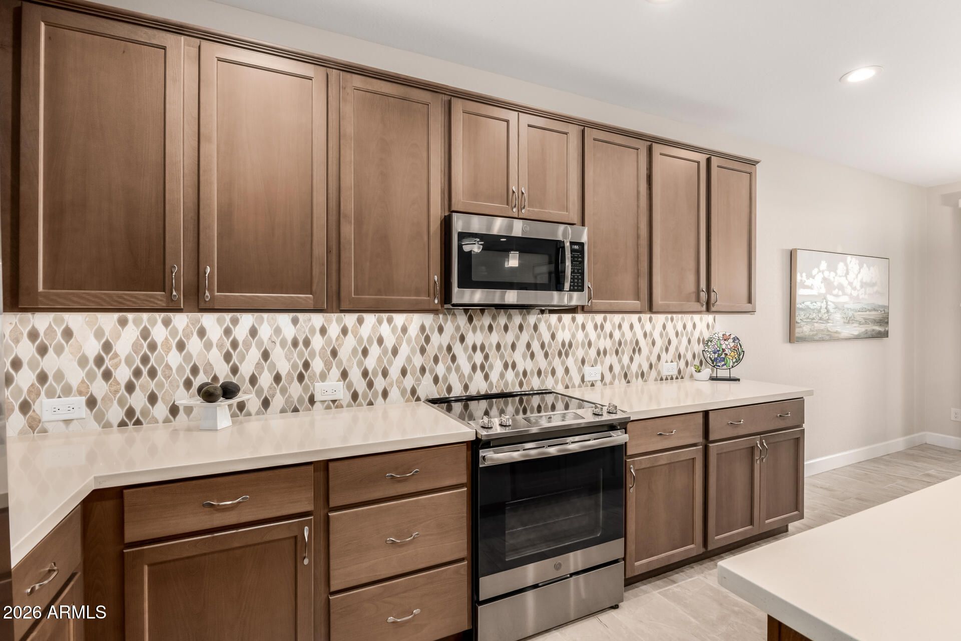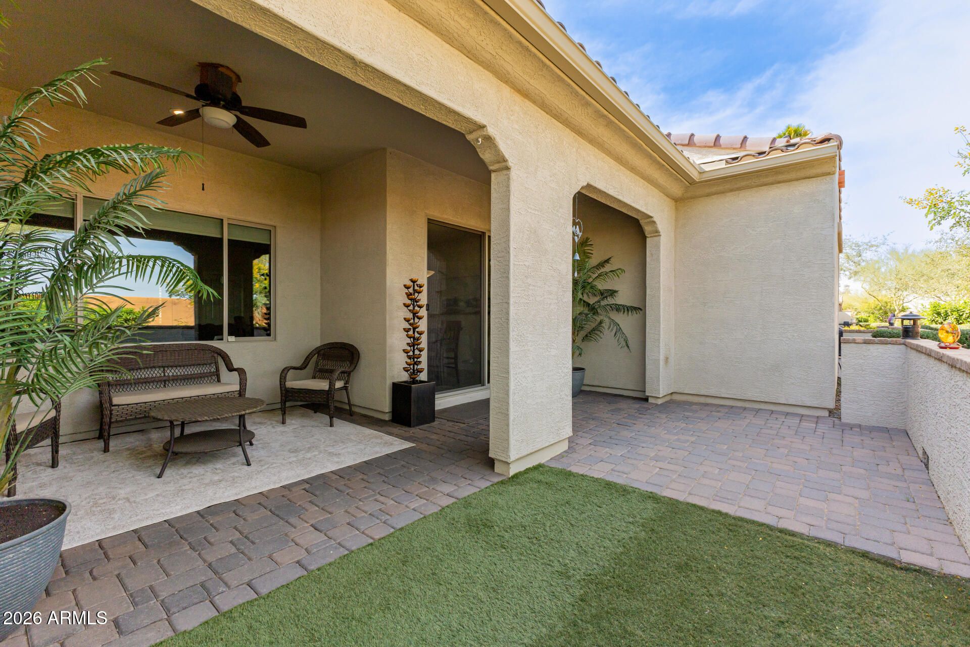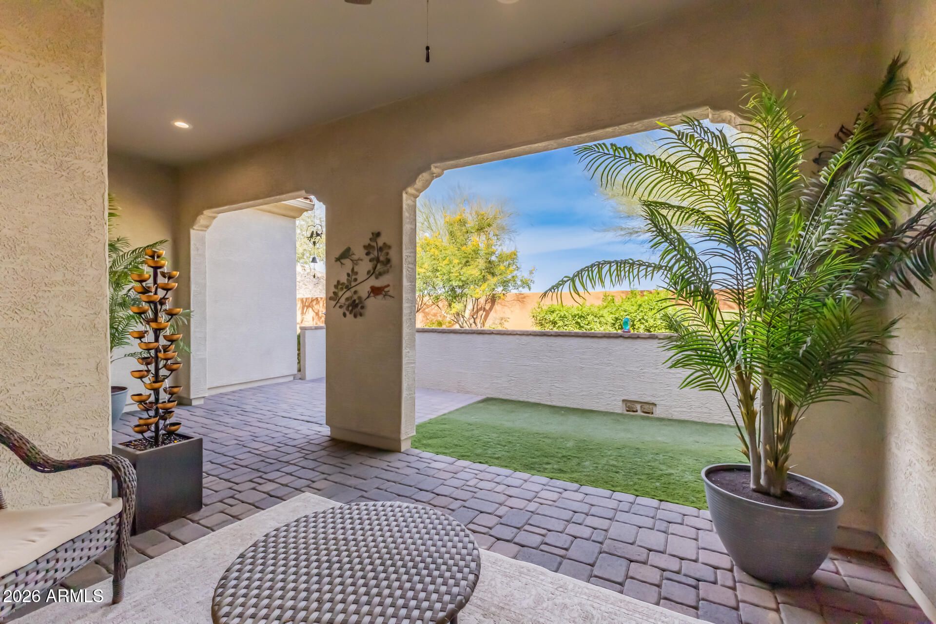 Courtyard Cholla model villa on a premium lot with mountain views and no home behind. The upgraded kitchen offers 42'' cabinets with pulls, tile backsplash, quartz counters, stainless appliances, reverse osmosis, roll-out shelves, built-in trash bin, plus under-cabinet and pendant lighting. Features include stunning tile flooring (new carpet in bedrooms), quartz vanities, tiled primary shower, water softener, and custom fans and lighting. Extended garage (19.4 x 21.11). Enjoy the covered patio and gated courtyard with pavers and synthetic turf. Ideal N/S exposure, privacy wall, and HOA-maintained exterior and landscaping. A must-see!
