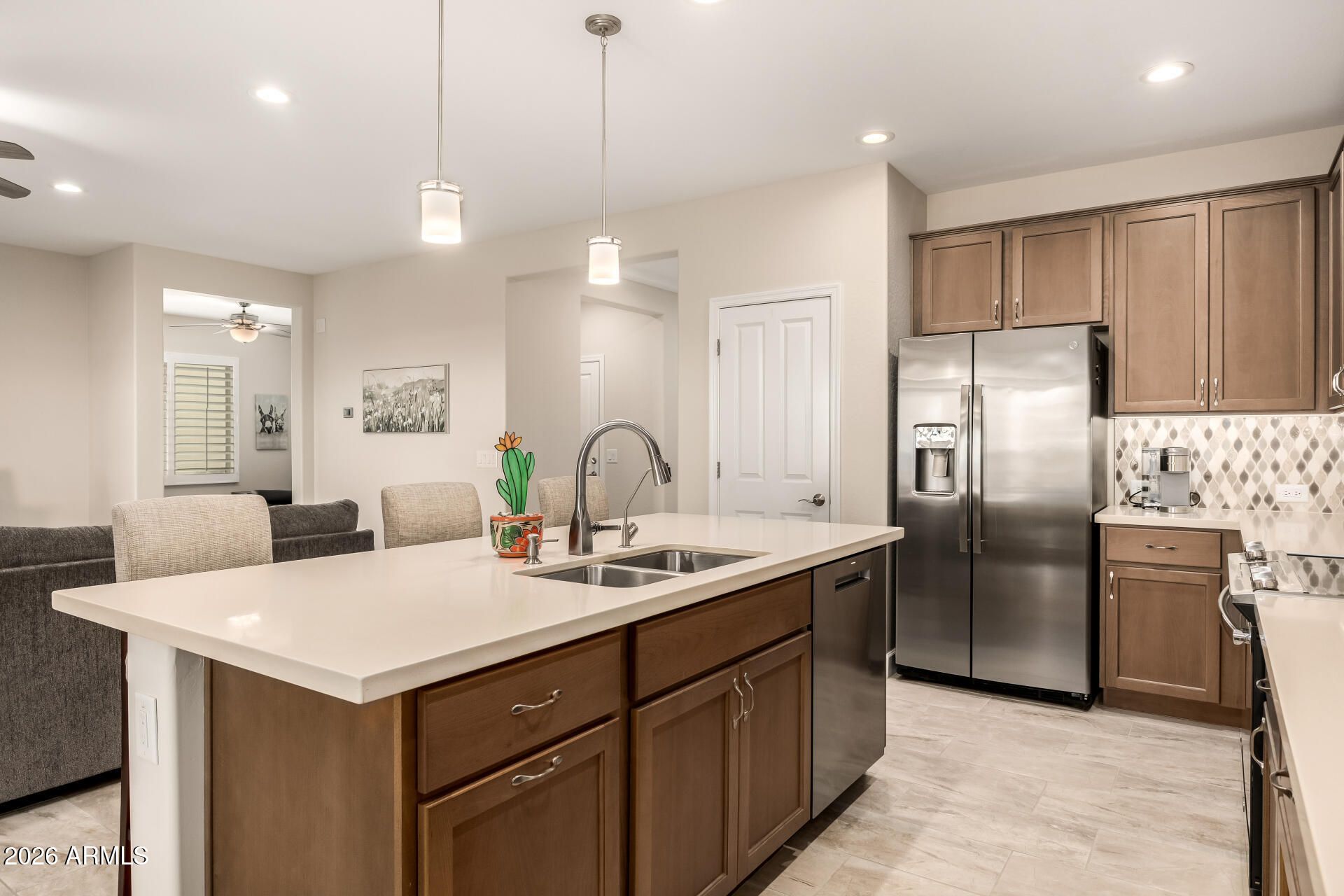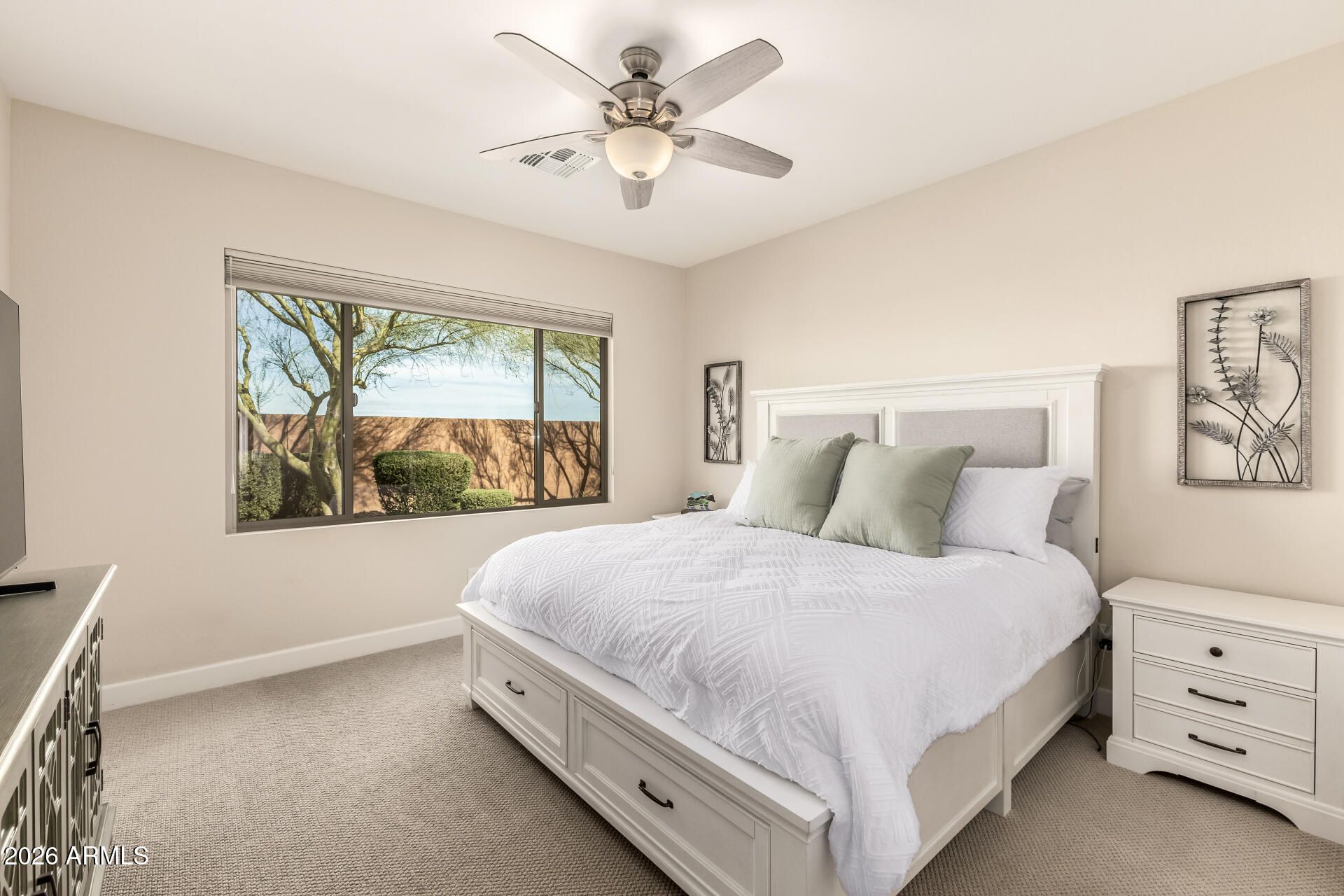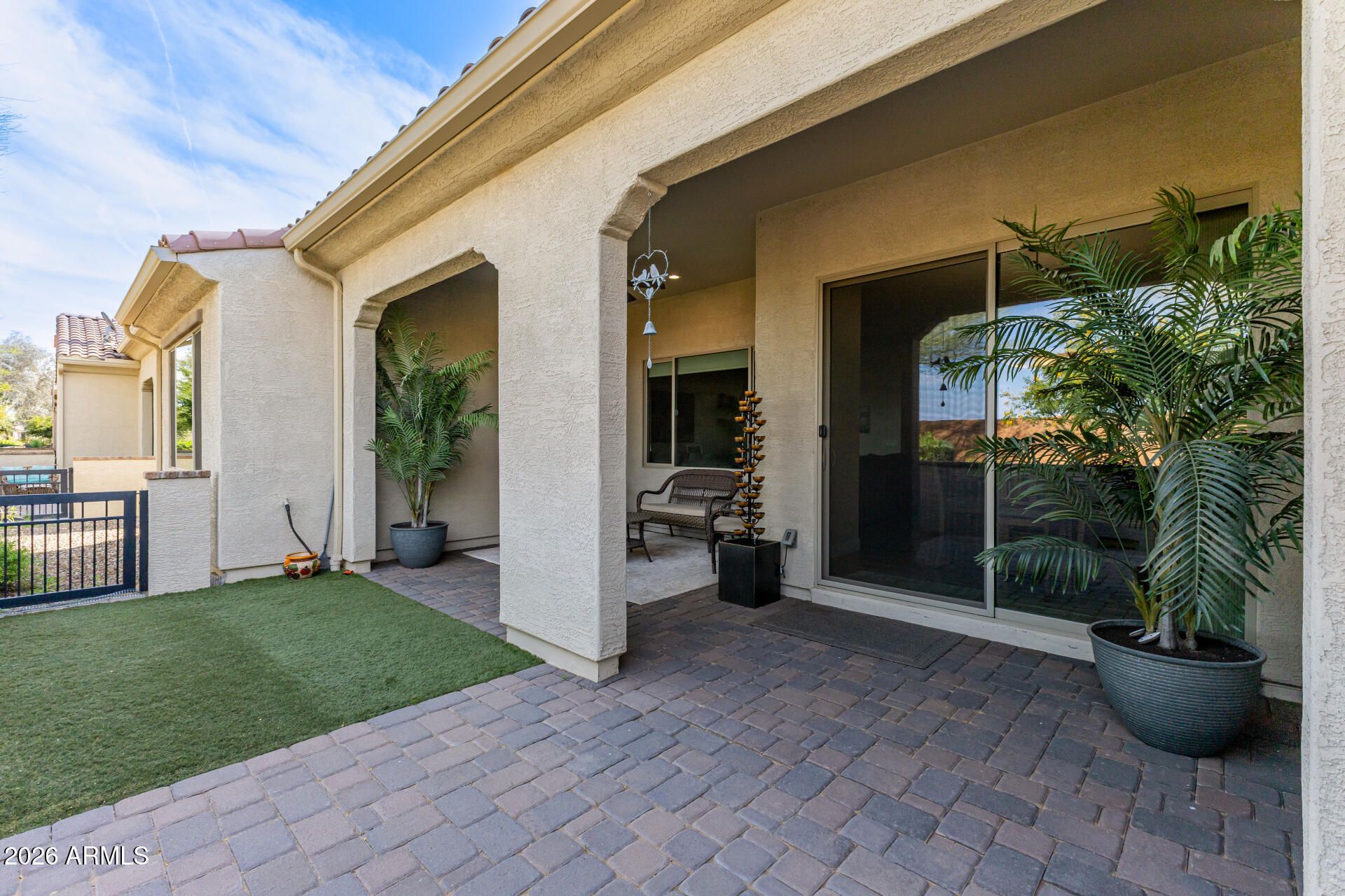 Courtyard Cholla model villa on a premium lot with mountain views and no home behind. The upgraded kitchen offers 42'' cabinets with pulls, tile backsplash, quartz counters, stainless appliances, reverse osmosis, roll-out shelves, built-in trash bin, plus under-cabinet and pendant lighting. Features include stunning tile flooring (new carpet in bedrooms), quartz vanities, tiled primary shower, water softener, and custom fans and lighting. Extended garage (19.4 x 21.11). Enjoy the covered patio and gated courtyard with pavers and synthetic turf. Ideal N/S exposure, privacy wall, and HOA-maintained exterior and landscaping. A must-see!