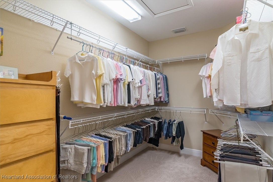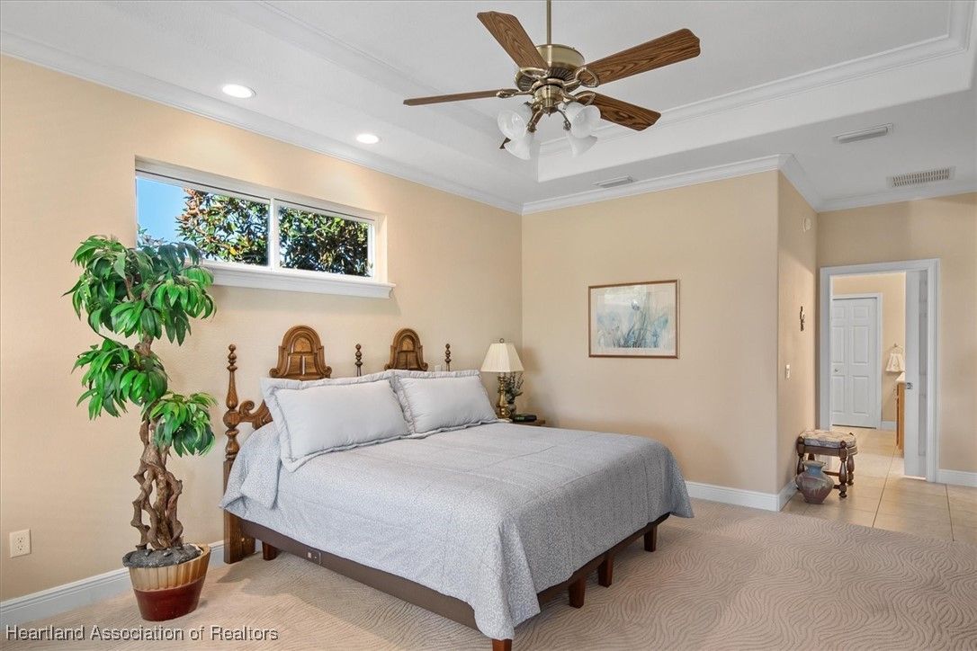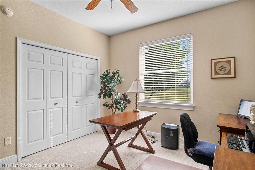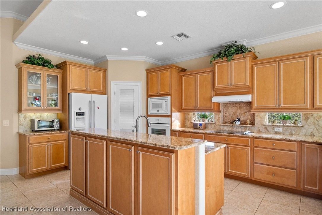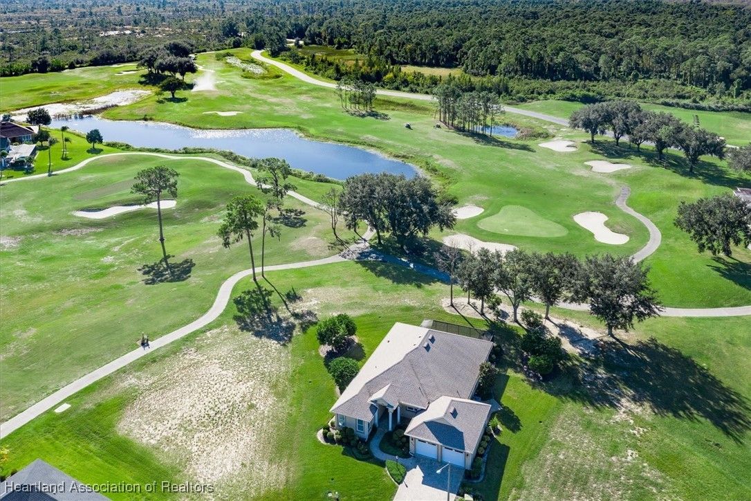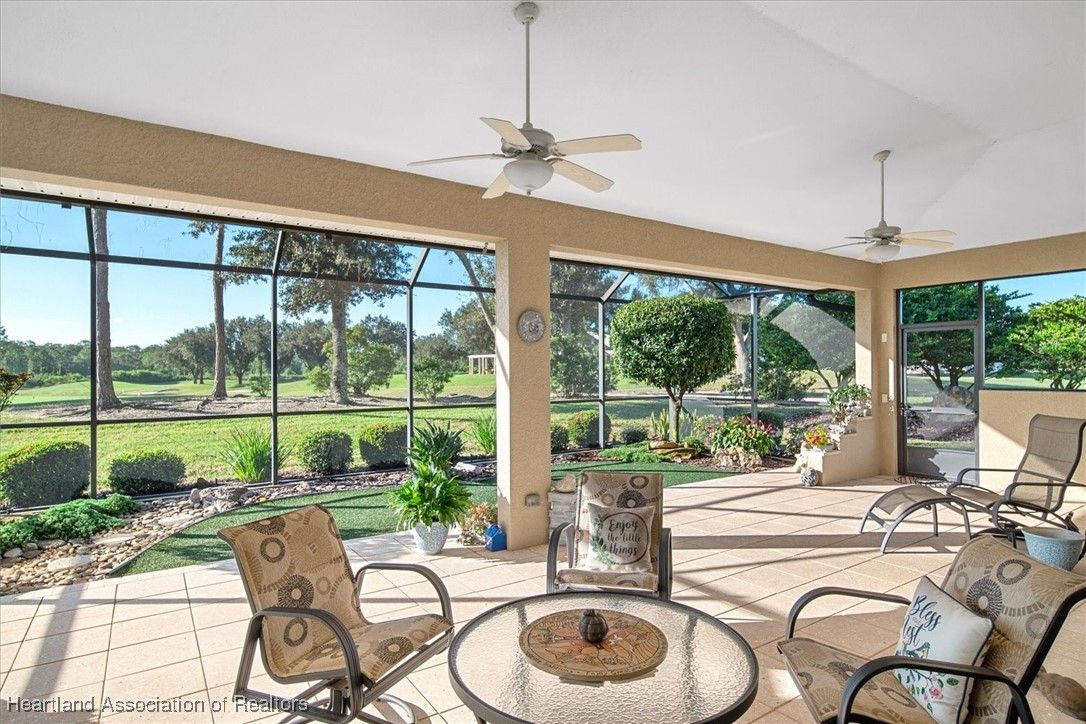LOOKING FOR AMAZING VIEWS & THE PERFECT SETTING? LOOK NO FURTHER! This custom built, one-owner home has been meticulously maintained and perfectly positioned on a premium, elevated pie-shaped lot at the end of a peaceful cul-de-sac - offering breathtaking panoramic views of the 18th hole and surrounding conservation areas of the Highlands Ridge North Course. From the moment you arrive, the pride of ownership is evident. A paver driveway, walkway, and welcoming front porch lead to a stunning leaded-glass entry door and expansive foyer that opens to a spacious great room with 12' ceilings, crown molding, 8' doors, and panoramic windows that capture sweeping golf course vistas. This home is well-appointed with upgrades & quality features including: *2023 HVAC *2022 roof, hot water tank & gutters *Oversized 2-car garage w/golf cart bay & charging station *Inboard storm room w/bonus storage above *Lush landscaping w/a private irrigation well *Oversized covered lanai + screened area w/artificial turf - ideal for putting practice or pets. The gorgeous kitchen is designed for both beauty and function, showcasing abundant wood cabinetry, granite countertops, a tiled backsplash, walk-in pantry, breakfast bar and large center island overlooking the great room. The adjacent dining area is perfectly situated beside a picture window framing the unobstructed panoramic view. The primary suite features a tray ceiling, two walk-in closets + two linen closets, dual sink vanity, a corner shower, and private water closet. The guest wing, located on the opposite side of the home for added privacy, includes a pocket door, a spacious guest bath, and two versatile rooms - one large enough to serve as a second master suite, complete with a walk-in closet and corner windows that fill the room with natural light and capture both sunrise & sunset views. A generous laundry/utility room just inside from the garage provides extra storage and convenience. Every detail has been thoughtfully designed, but what truly sets this home apart are the captivating views & serene setting. Don't miss your chance to see this exceptional home - it's a true MUST SEE!