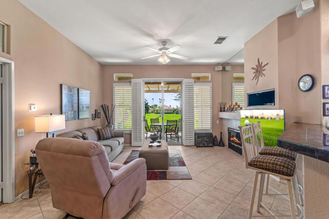 Great 2 bedroom 2 bath home located on the 13th fairway in Heritage Palms C.C. This TURNKEY FURNISHED home features a beautiful brick paver driveway and walkway to your covered front entrance, artificial turf and desert landscaping. Additional upgrades include granite kitchen counters with stainless appliances, a nook window for an additional eating area, Plantation shutters, lots of storage cabs in the laundry room and a cozy fireplace in the family room for those cool desert winter nights as well. The primary bedroom has a bay window, nice sized walk-in closet, granite counters, a large shower and convenient sliding door to your east facing covered rear patio looking out onto the beautiful fairway. Heritage Palms is a premier adult community featuring an 18 hole championship golf course, indoor and outdoor pools, pickleball and tennis courts, fitness center, grillroom, card rooms, billiards room, social clubs and more.
