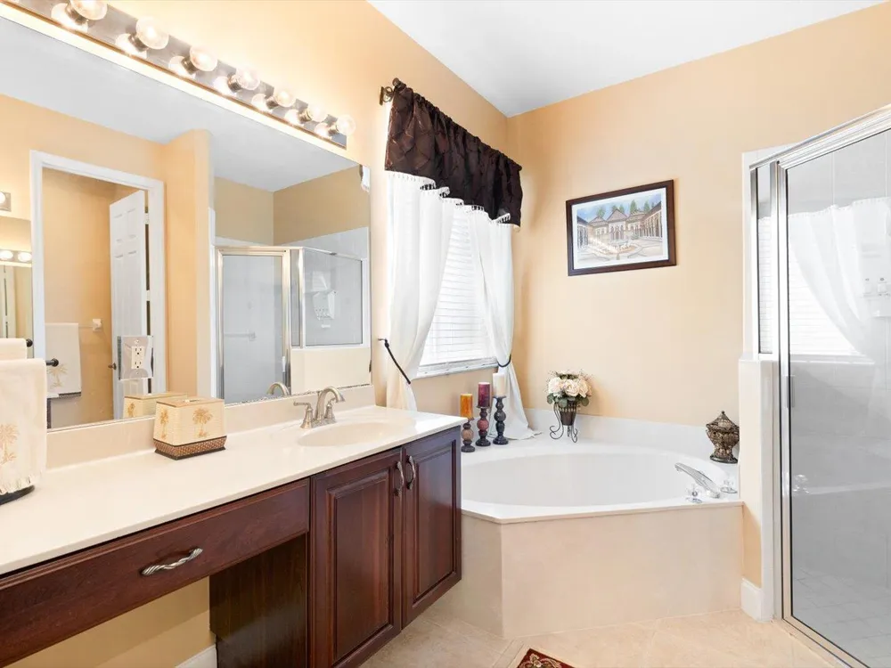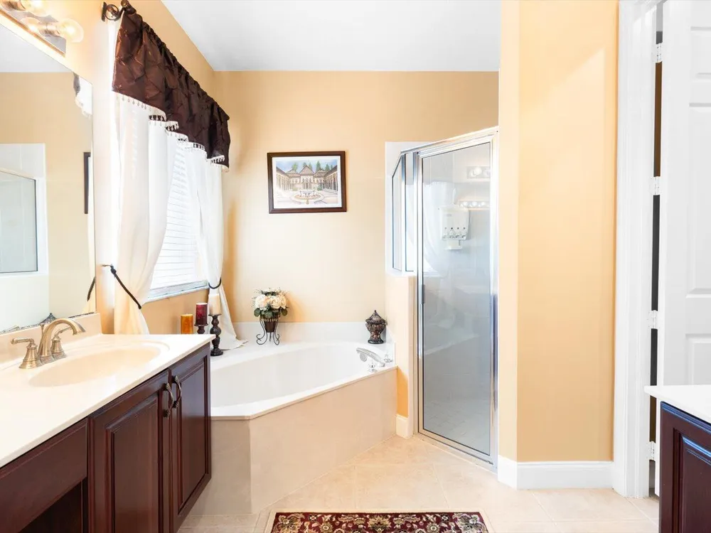 - Split Bedrooms, Garden Tub/Roman Tub, High Ceilings, Walk-In Closet(s), Home Office, Living/Dining Room, Breakfast Area, Separate Shower, Primary Downstairs, Dual Sinks, Storm Shutters