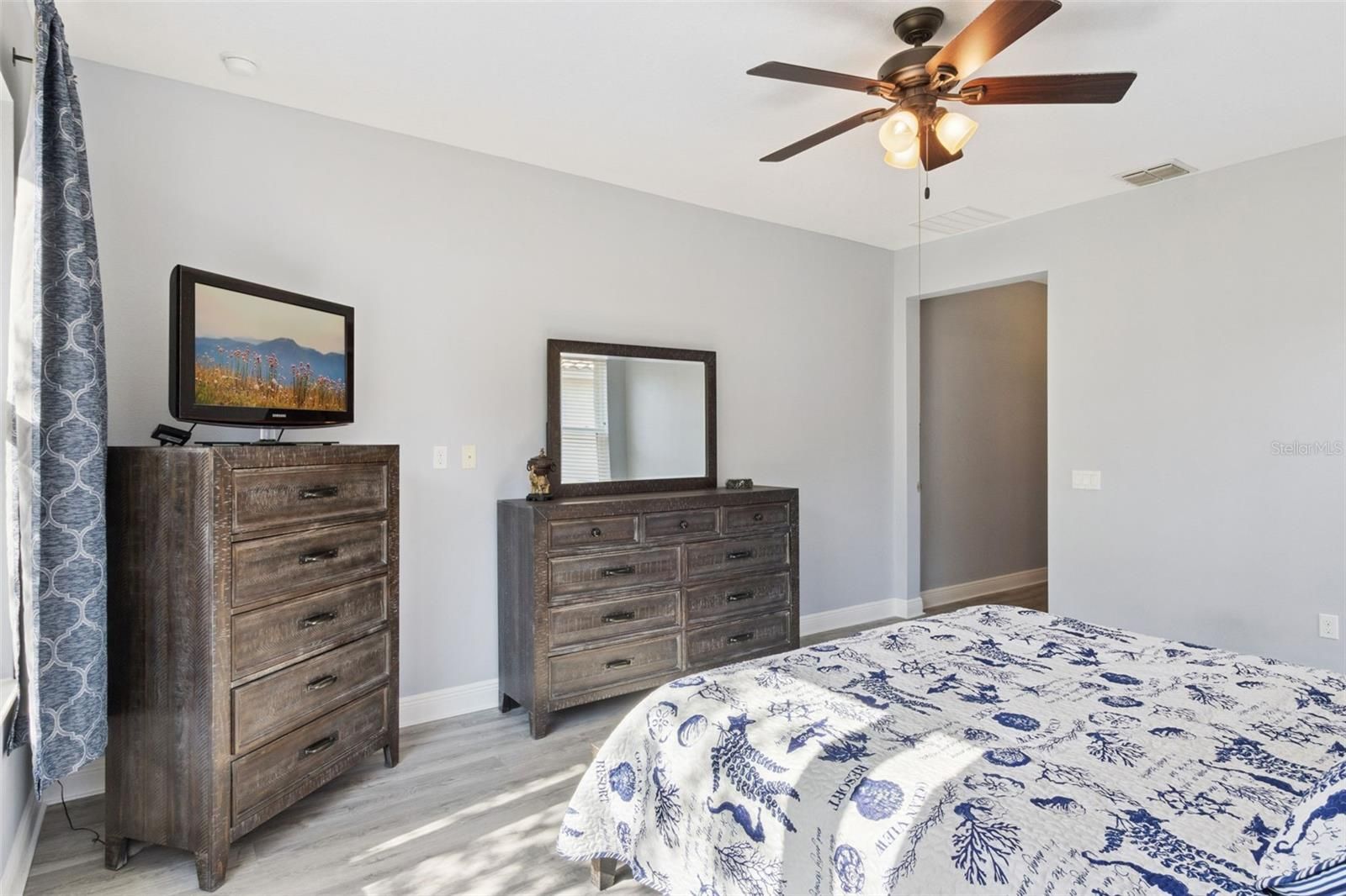 - Ceiling Fan(s), Crown Molding, Kitchen/Family Room Combo, Open Floorplan, Main Level Primary, Solid-Wood Cabinets, Stone Counters, Thermostat, Walk-In Closet(s), Window Treatments
