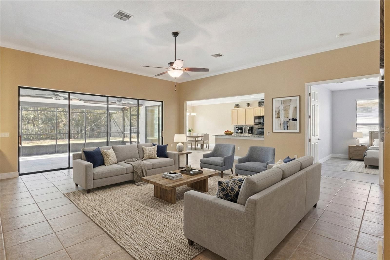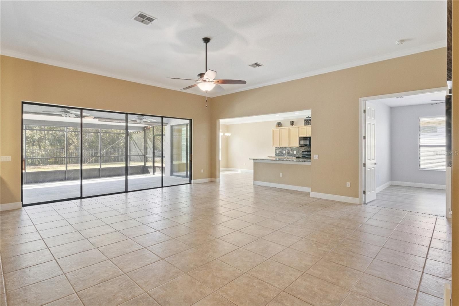 Exquisitely maintained and thoughtfully upgraded, this 2,095 sq ft residence is perfectly positioned on a premium oversized conservation homesite offering exceptional privacy and tranquil wooded views. A rare and valuable bonus the CDD bond has been fully paid off! Designed for both comfort and entertaining, this spacious open-concept floor plan features 2 bedrooms, 2.5 baths, a private study with French doors, and an oversized 2-car garage! PLUS golf cart garage. The expansive covered and screened lanai overlooks peaceful conservation, creating a seamless indoor-outdoor living experience. A fenced in yard provides a secure space for pets without obstructing the view. Inside, you’ll find no carpet tile flooring flows throughout the main living areas, while brand-new luxury vinyl plank enhances the bedrooms and study. Crown molding adds an elegant touch, and abundant natural light fills the home. The kitchen is truly the centerpiece, offering granite countertops and backsplash, extensive counter space, upgraded cabinetry with generous storage, a large pantry, and upgraded appliance package. It opens effortlessly to the great room and dining area, making it ideal for hosting gatherings or enjoying quiet evenings with scenic views. The bathrooms feature granite countertops, and the guest suite includes a private en-suite bath for added comfort and privacy. Water heater 40 gallon replaced in 2025. HVAC Lennox 3-ton replaced in 2022. Windows 8 replaced in 2021. Located within the award-winning 55+ community of Solivita, residents enjoy resort-style amenities including 14 community pools, 2 championship golf courses, 3 on-site restaurants, over 250 social clubs, a vibrant village center, and more than 4,200 acres of beautifully maintained grounds. HOA dues include lawn care, irrigation water, highspeed internet and cable service — delivering true maintenance-free living.