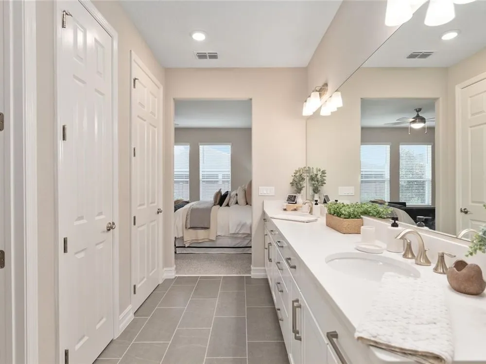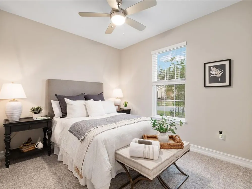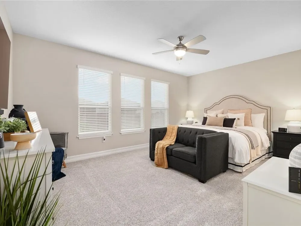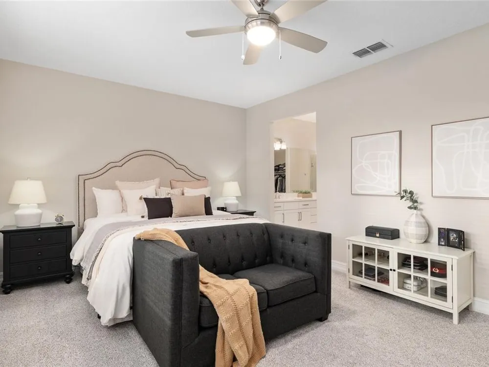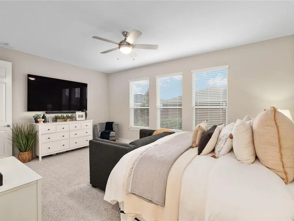 - Ceiling Fan(s), Crown Molding, High Ceilings, Kitchen/Family Room Combo, Open Floorplan, Main Level Primary, Stone Counters, Walk-In Closet(s)