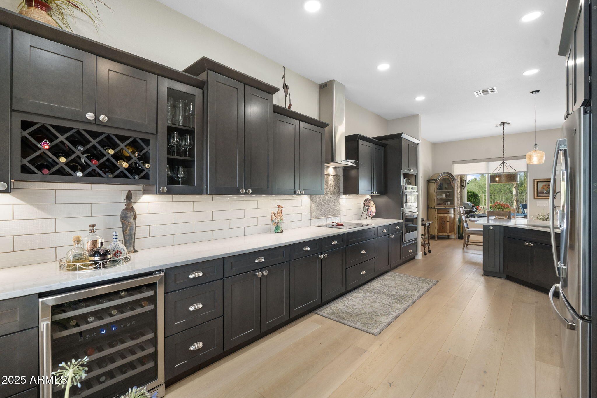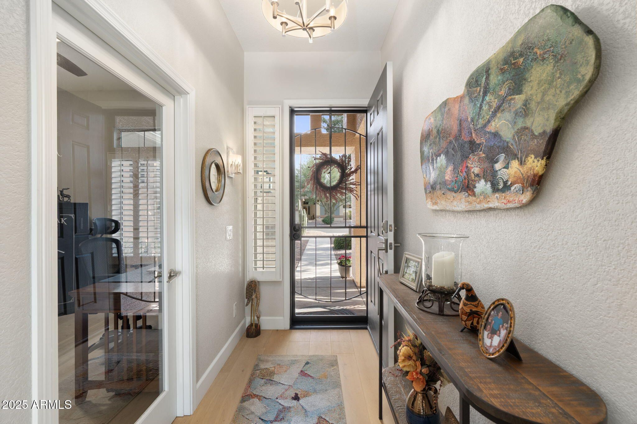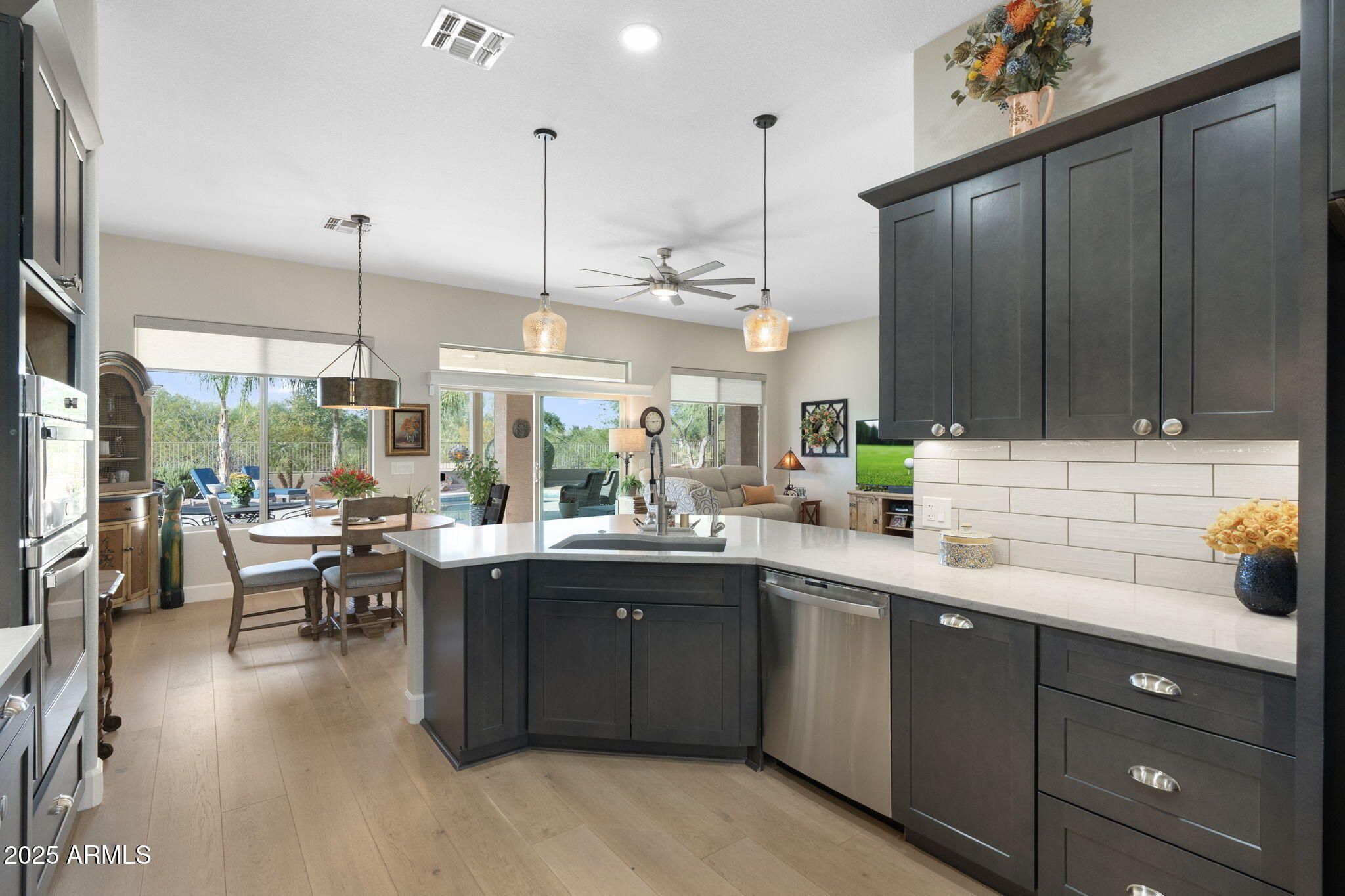 Stunning top to bottom remodel in 2022, turn-key home in sought after 55+ community. Home overlooking golf course w/ salt water pool. Engineered hardwood floors throughout. New cabinetry throughout kitchen, baths, & laundry. Kitchen has quartz counters, stainless appliances w/ induction cooktop, wall oven, microwave & wine refrigerator. Primary suite w/ private exit to backyard, double sinks, quartz counters, tile step-in shower, recessed medicine cabinets, walk-in closet with high-end organizers. 2nd bedroom has carpet. Office/den off entry. Storage room off 2nd bedroom. Laundry room w/ utility sink & cabinets. Front & backyard both with immaculate landscaping & hardscape lighting. True 3 car garage with built-ins. Roof & A/C new in 2022. Close & do nothing except move your furniture in!