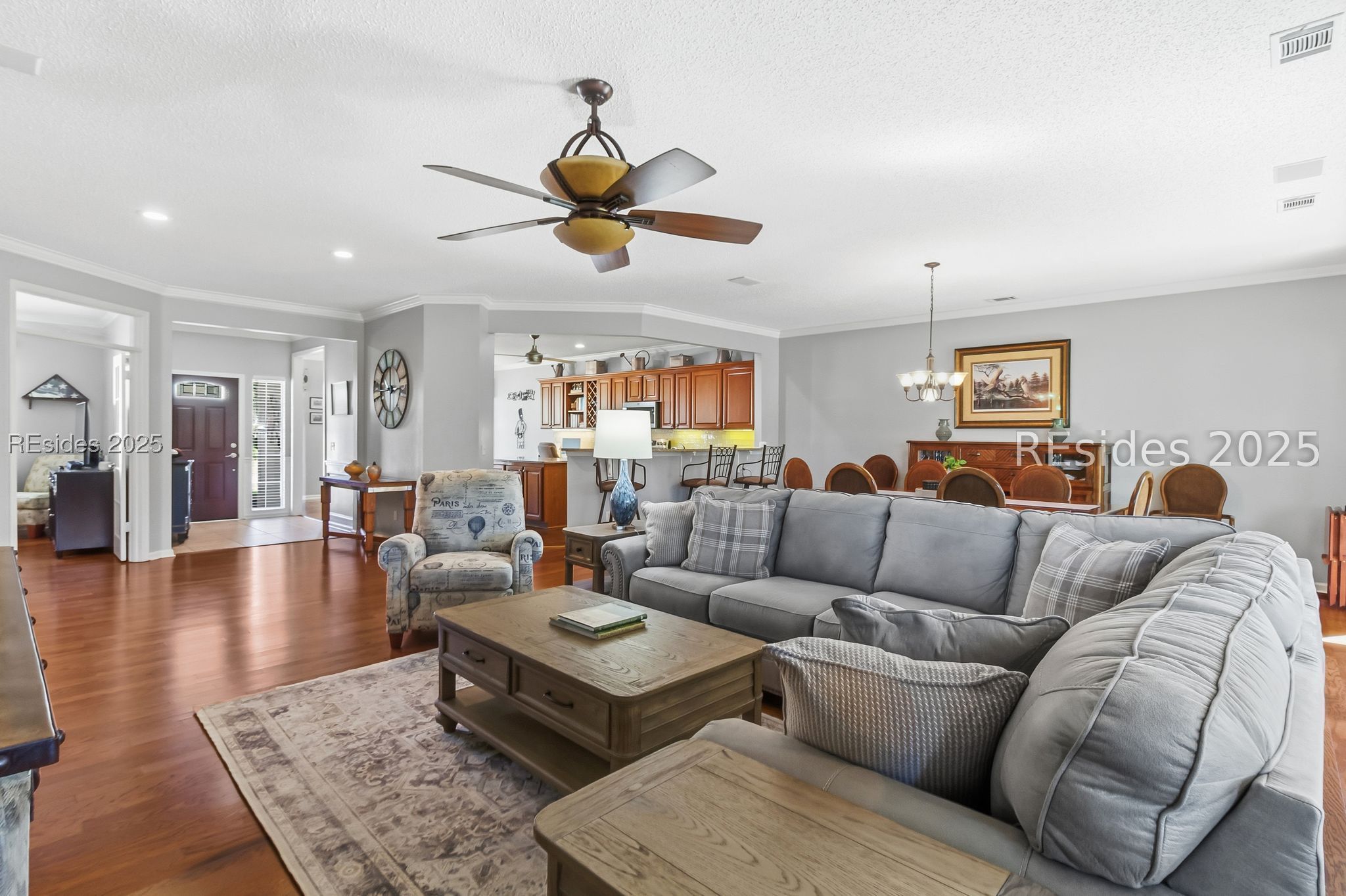 Location, Location, Location! Stunning Lilac model perfectly positioned on a .27-acre lot backing to a tranquil lagoon and the 13th green of the Hidden Cypress Golf Course. A spacious entry foyer opens to the Great Room featuring a formal dining area and relaxing living space-ideal for entertaining or quiet evenings at home. The kitchen impresses with an extended granite prep island, breakfast bar, abundant cabinetry with some lower rollouts, stainless appliances including a convection oven/air fryer, tile backsplash, under cabinetry lighting and a built-in desk area. The eat-in nook with bay window offers the perfect spot for morning coffee. A French-doored den/office provides flexibility-use it as a private workspace or extra sleeping area for guests. The extended Carolina Room invites you to unwind while taking in the sights of golfers and Lowcountry wildlife. Large slider opens to a spectacular screened lanai, perfect for indoor-outdoor living. The primary suite features an updated en-suite bath with large shower, soaking tub, dual-sink vanity, and two massive walk-in closets. A private guest bedroom and upgraded full bath ensures comfort for visitors. Laundry Room with washer/dryer, laundry tub and cabinets. Additional highlights include a 4' extended garage with epoxy flooring, pull-down attic stairs, and overhead storage. Notable upgrades: double crown molding, ceiling fans, newer windows and exterior doors, solar tube, TechShield, and more. Most furniture is available-move right in and start enjoying life in this award-winning active adult community offering over $100 million in resort-style amenities!