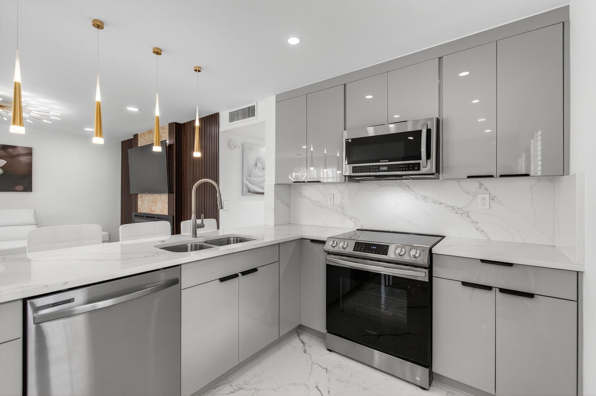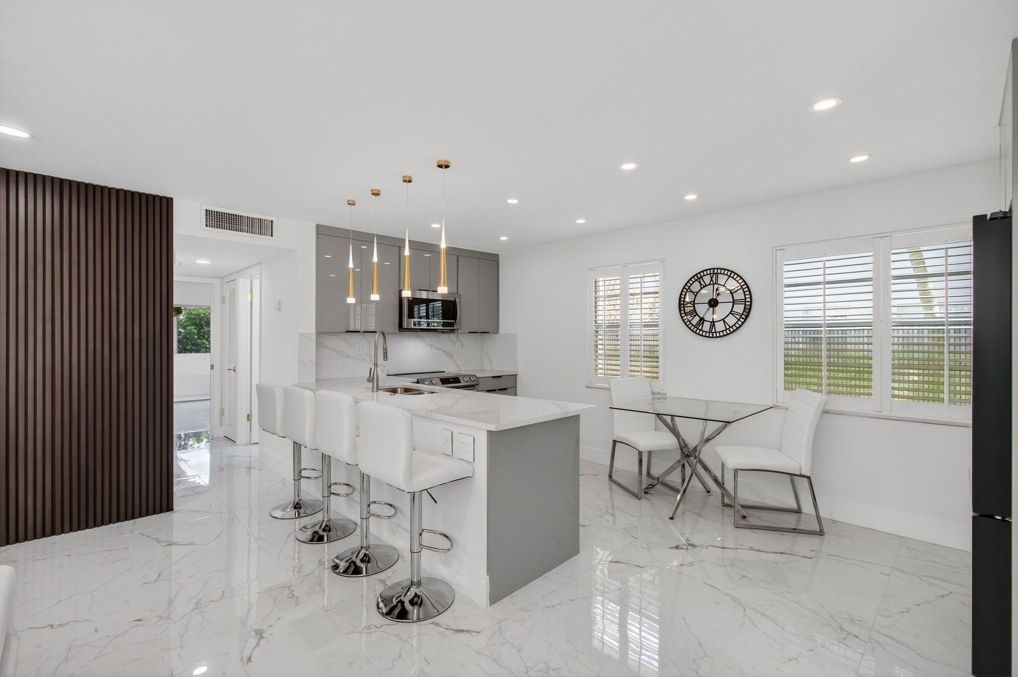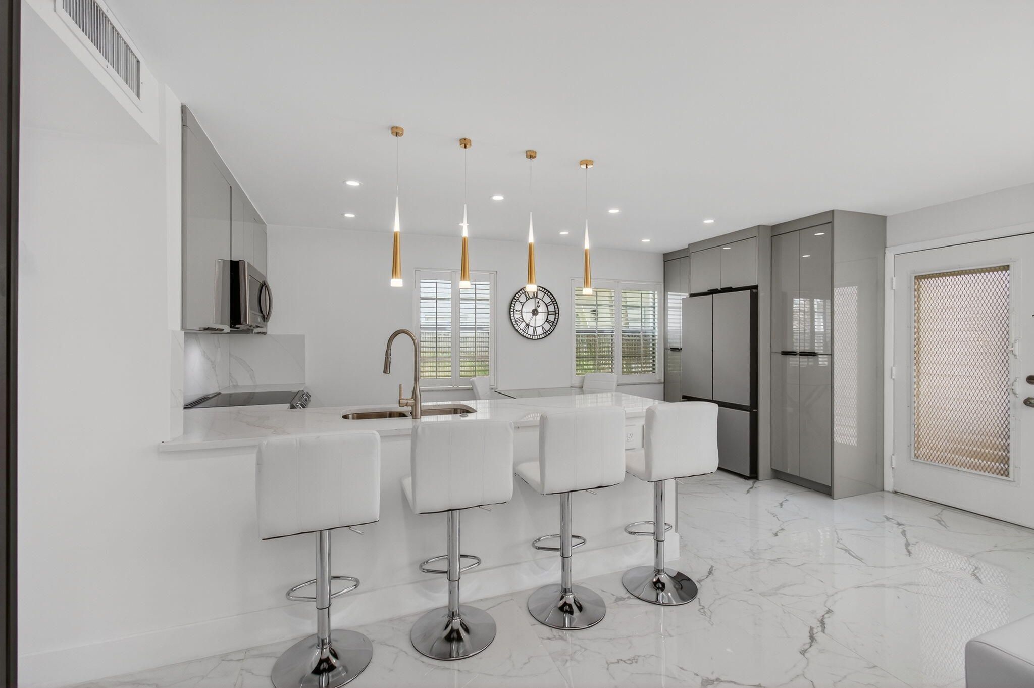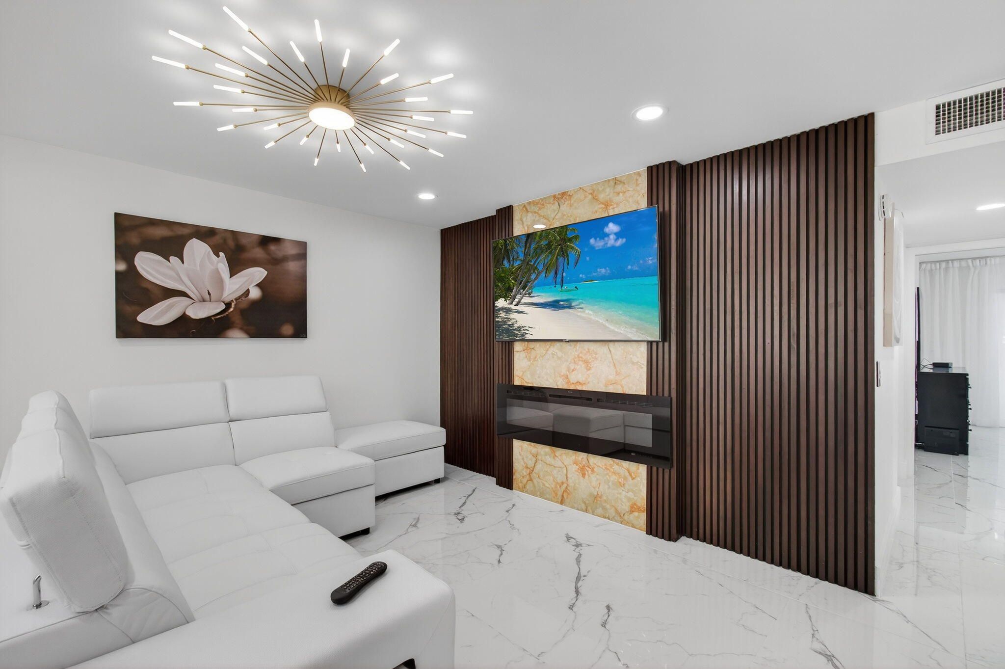 Prepare to be impressed--this 1st-floor 2 bed, 2 bath Kings Point condo showcases one of the most stunning top-to-bottom designer renovations in the community, offering pure modern luxury. The open-concept layout features tile floors throughout, a gourmet kitchen with quartz counters, large counter peninsula, stainless steel appliances, and elegant lighting. The living room boasts a custom accent wall with fireplace and mounted TV, while spa-inspired baths and spacious bedrooms create comfort and style. A new washer & dryer add everyday convenience, and the enclosed patio with tranquil garden view is the perfect spot to relax. Kings Point offers resort-style living with golf, pools, tennis, pickleball, fitness, clubhouse, theater, dining, and more--just minutes from downtown Delray Beach.