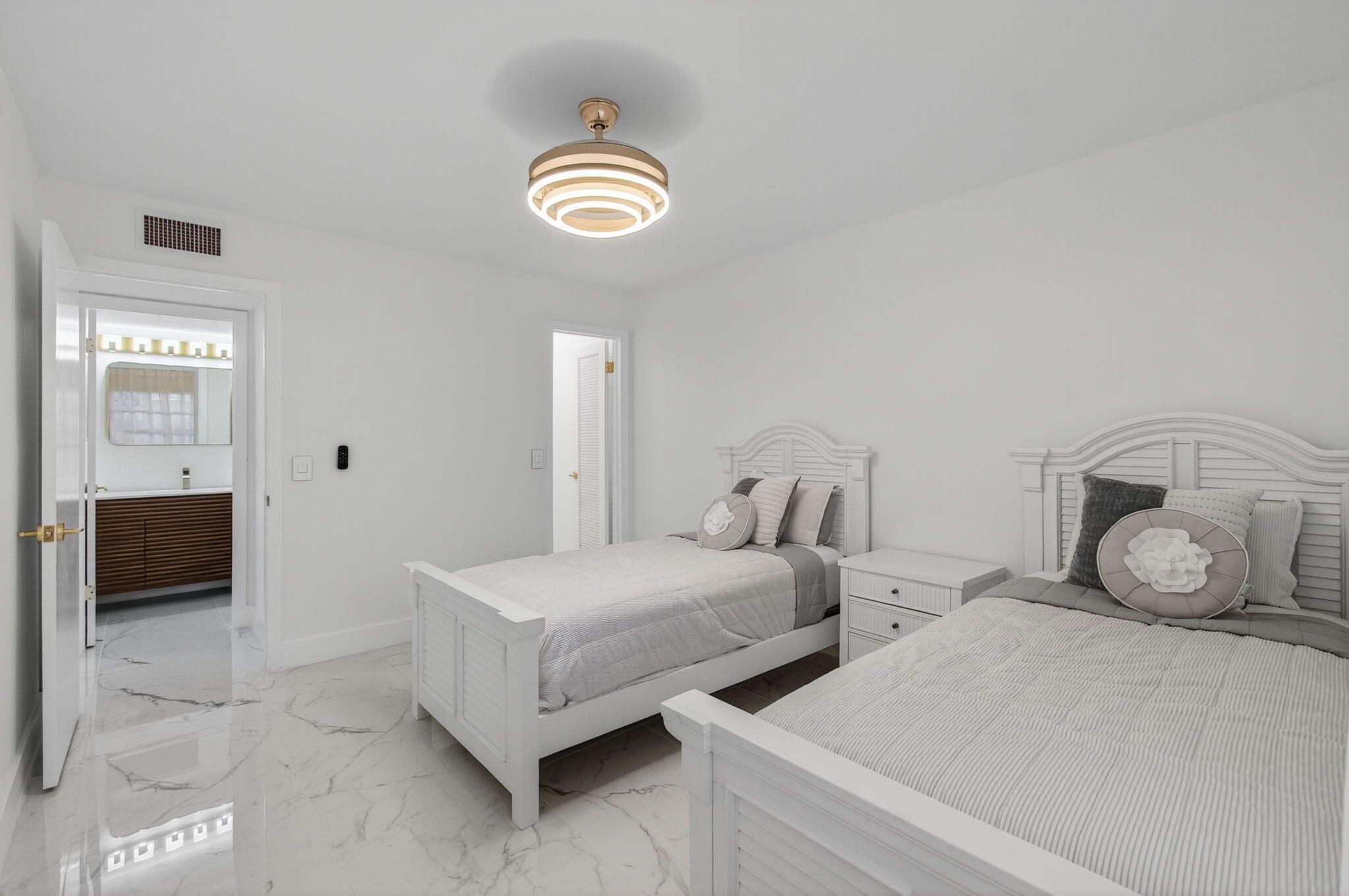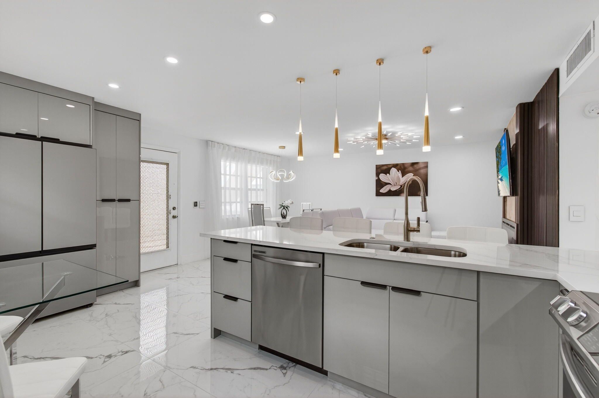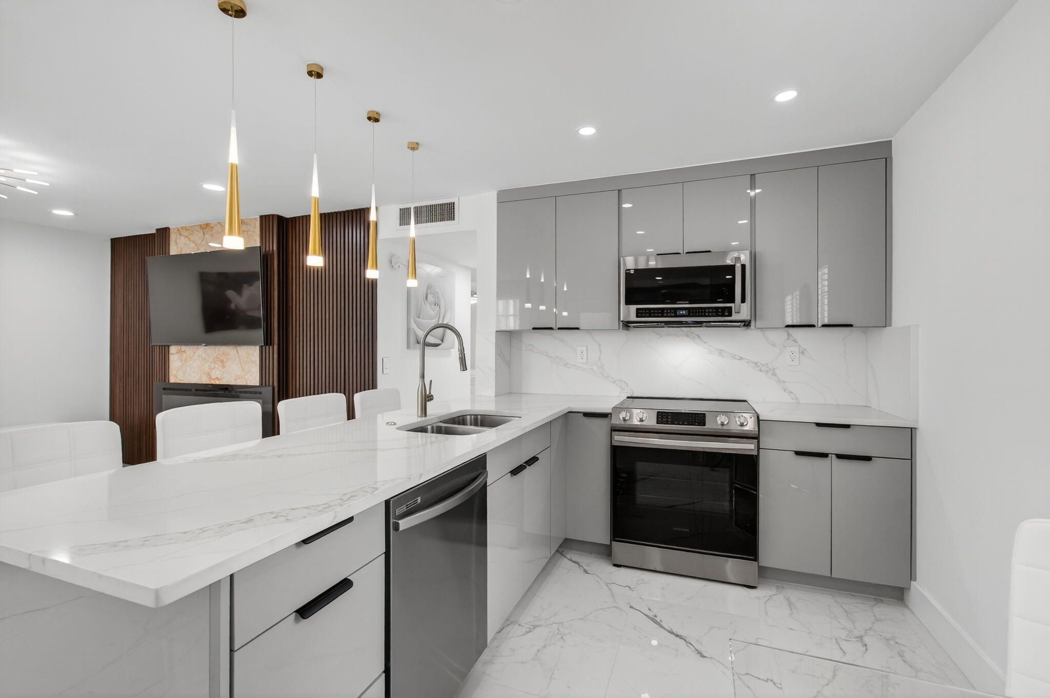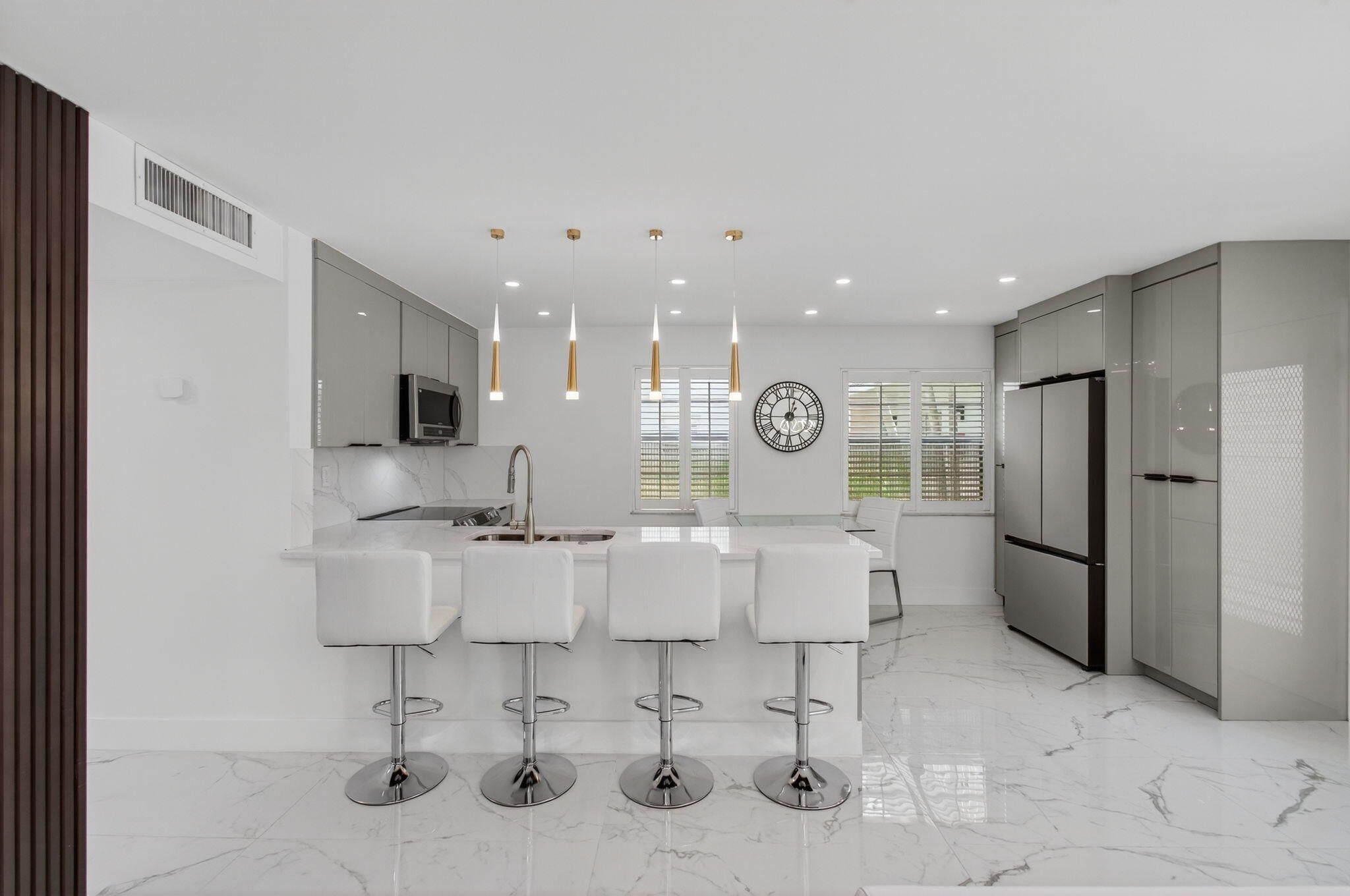 Prepare to be impressed--this 1st-floor 2 bed, 2 bath Kings Point condo showcases one of the most stunning top-to-bottom designer renovations in the community, offering pure modern luxury. The open-concept layout features tile floors throughout, a gourmet kitchen with quartz counters, large counter peninsula, stainless steel appliances, and elegant lighting. The living room boasts a custom accent wall with fireplace and mounted TV, while spa-inspired baths and spacious bedrooms create comfort and style. A new washer & dryer add everyday convenience, and the enclosed patio with tranquil garden view is the perfect spot to relax. Kings Point offers resort-style living with golf, pools, tennis, pickleball, fitness, clubhouse, theater, dining, and more--just minutes from downtown Delray Beach.