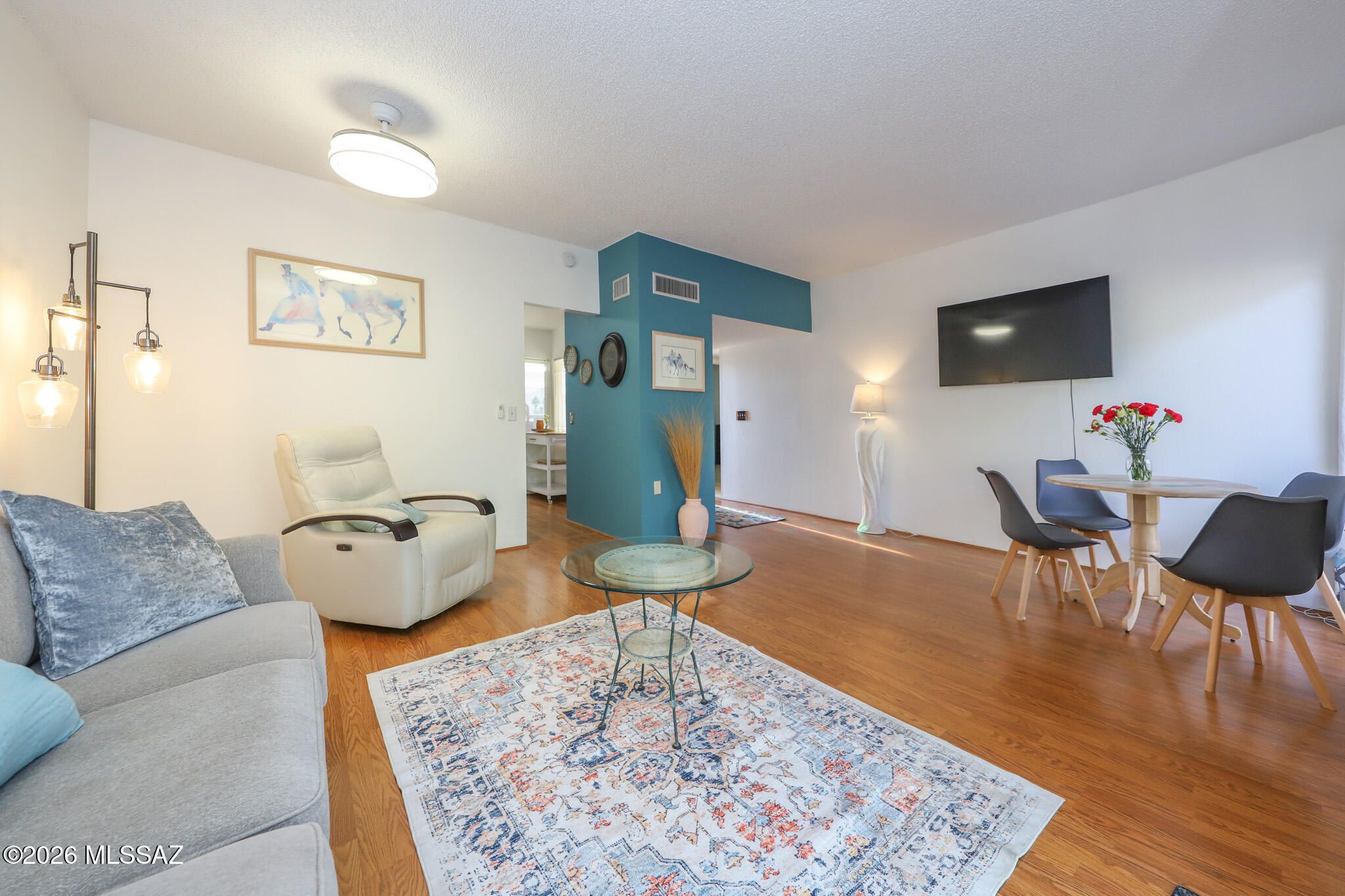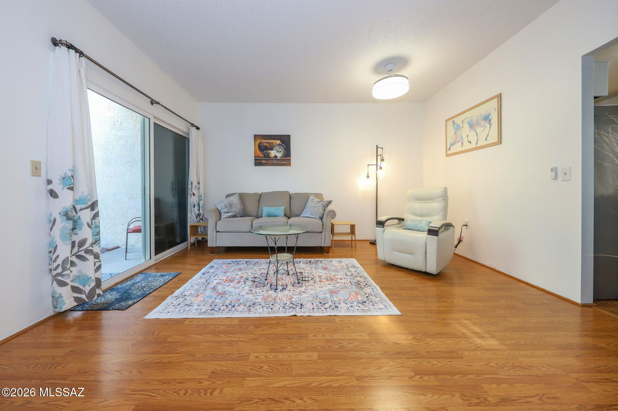 Fantastic view! Enjoy a cup of coffee gazing at the majestic Santa Rita Mountains! A rare find with a fantastic price! Beautifully updated 2-bedroom, 1-bath townhome. The perfect winter getaway or lovely full-time residence. Amazing, private, green backyard and mountain-view front patio. Professionally landscaped. Everything has been updated in the past couple of years, including new paint, new appliances, new windows, and professionally installed solar screens. Tastefully decorated with modern furniture and art (included in sale- see your realtor for details). Located in a desirable community of the Villages with no GVR (optional) saving you thousands $$$. The HOA includes a large, heated pool, spa, community club house, library, art cove and more. Walking distance to shopping and only