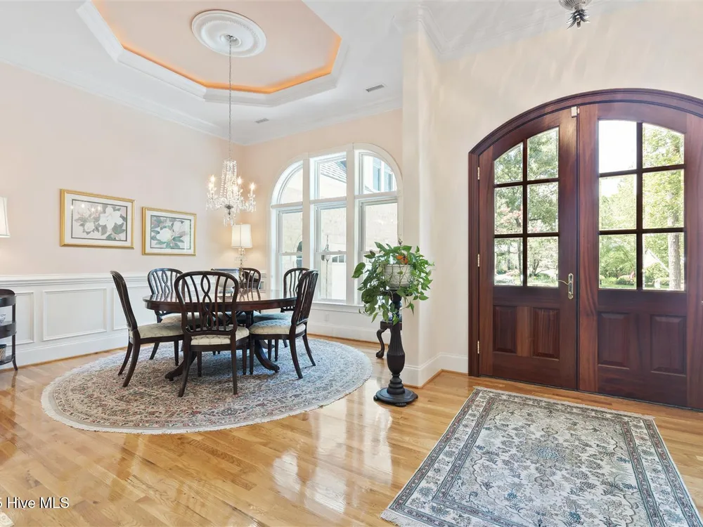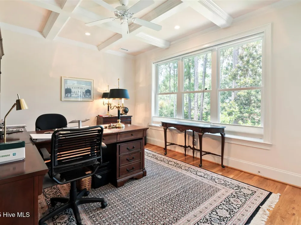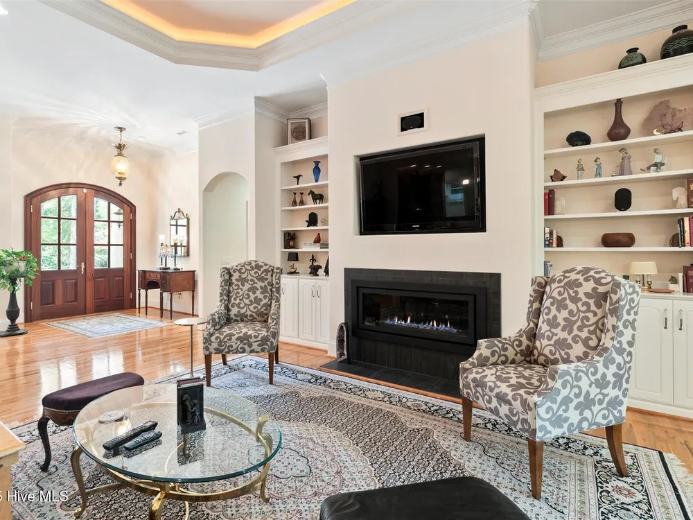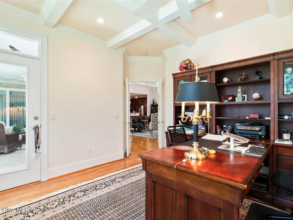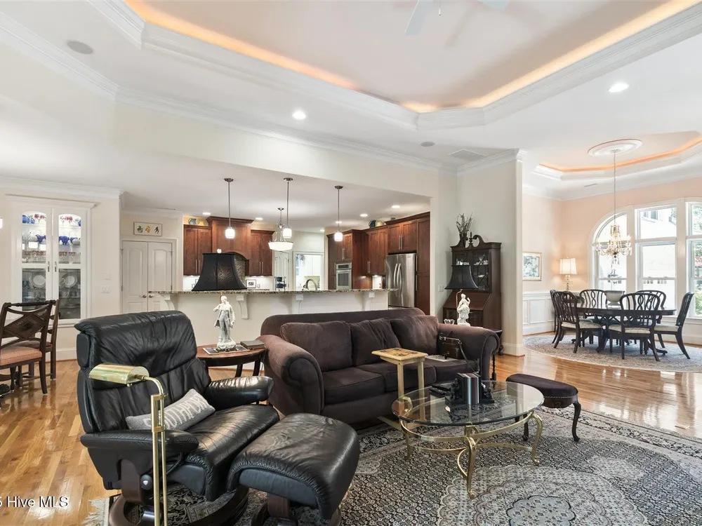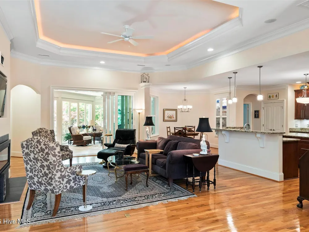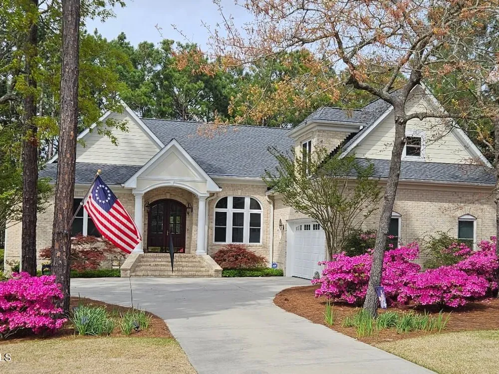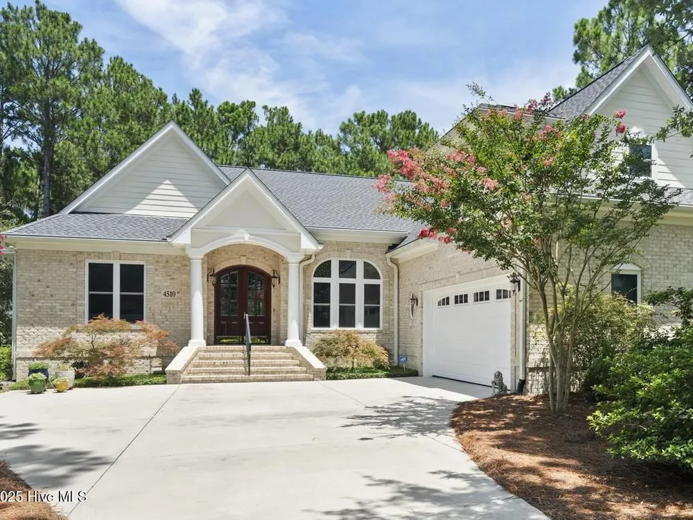 Enter through the gorgeous front door and discover elegance at its best! Gleaming Hardwood floors, a popular Open Floor Plan and large Sunlit rooms in over 4,000 square feet. The formal Dining room with a large beautiful window, wainscoting, trey ceiling with accent lighting opens to a spacious Great room. A very attractive Linear Gas Fireplace surrounded by built-ins and another trey ceiling with accent lighting makes this the perfect entertainment space. The Kitchen seamlessly blends functionality and style. Stainless steel appliances, two pantries, pull-out drawers, Thermador gas cooktop, KitchenAid double ovens, granite countertops and Food Prep Island are a chef's dream. You will love the Breakfast area with a beautiful built-in Display cabinet. The Carolina Room with telescoping glass doors opens to a large space that is inviting, light-filled and comfortable with backyard Nature views. Wet bar with beverage cooler and ice maker add to easy living! The Owners Suite is serene and spacious with a large closet. The spa-like Bath is generous with a heated floor, two vanities, granite countertops and a large tile shower. A large Laundry is conveniently located outside the Owners Suite. The split floor plan has two Guest Bedrooms and a full Bath affording privacy for you and your guests. A home Office and Powder room are also located on the main level. The outdoor Patio is located off the Carolina Room. Upstairs is a Flex Space with a full Bath and walk-in Closet that can be used as an additional bedroom or whatever you prefer. Garage is oversized and includes a conditioned storage room. A new Roof was installed in 2024. Please see upgrade list in Documents. Welcome Home to Coastal North Carolina!