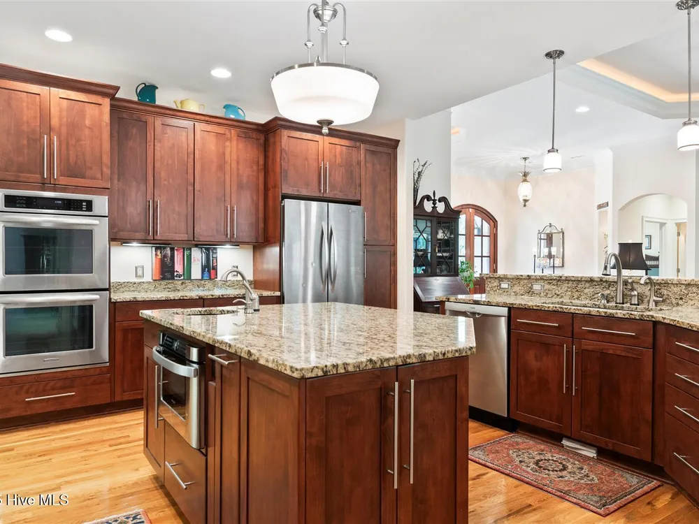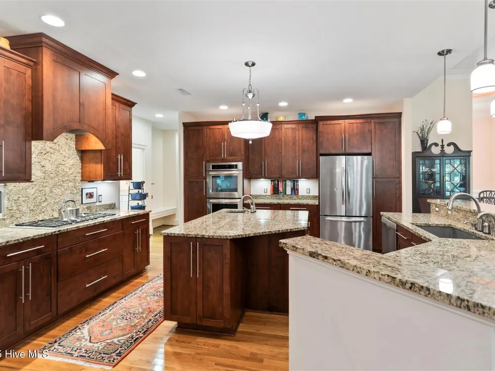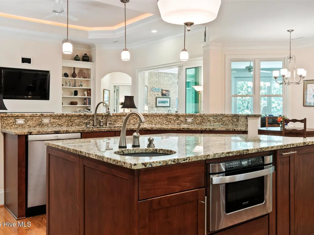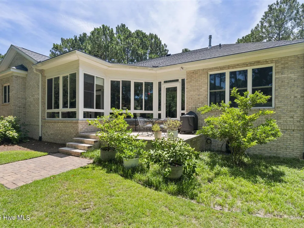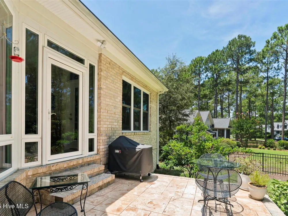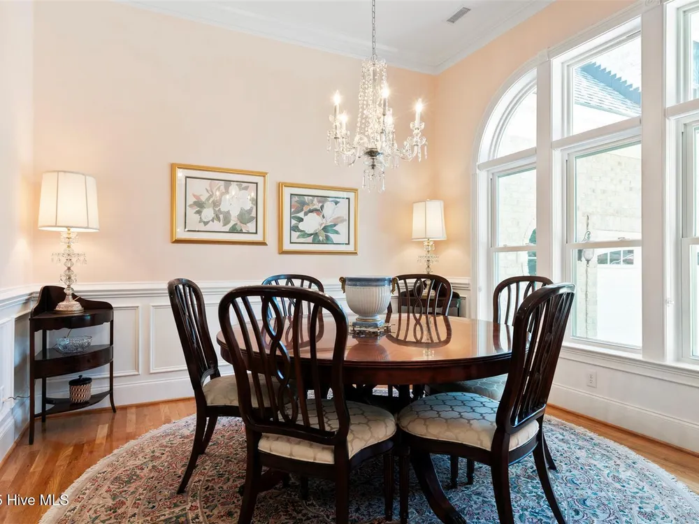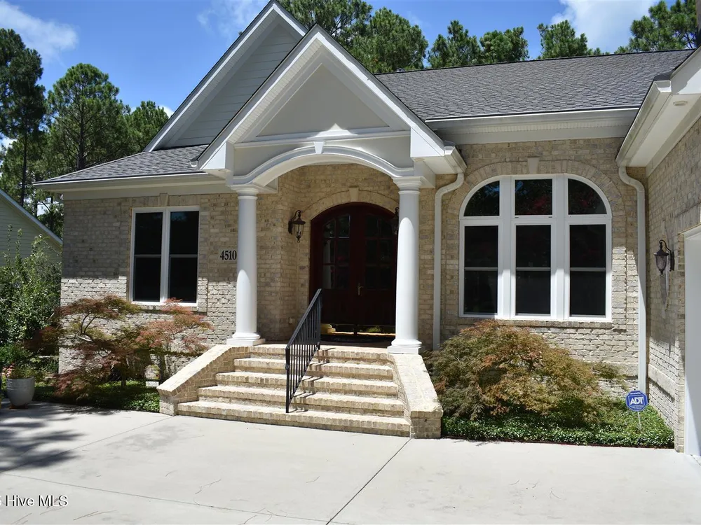 Enter through the gorgeous front door and discover elegance at its best! Gleaming Hardwood floors, a popular Open Floor Plan and large Sunlit rooms in over 4,000 square feet. The formal Dining room with a large beautiful window, wainscoting, trey ceiling with accent lighting opens to a spacious Great room. A very attractive Linear Gas Fireplace surrounded by built-ins and another trey ceiling with accent lighting makes this the perfect entertainment space. The Kitchen seamlessly blends functionality and style. Stainless steel appliances, two pantries, pull-out drawers, Thermador gas cooktop, KitchenAid double ovens, granite countertops and Food Prep Island are a chef's dream. You will love the Breakfast area with a beautiful built-in Display cabinet. The Carolina Room with telescoping glass doors opens to a large space that is inviting, light-filled and comfortable with backyard Nature views. Wet bar with beverage cooler and ice maker add to easy living! The Owners Suite is serene and spacious with a large closet. The spa-like Bath is generous with a heated floor, two vanities, granite countertops and a large tile shower. A large Laundry is conveniently located outside the Owners Suite. The split floor plan has two Guest Bedrooms and a full Bath affording privacy for you and your guests. A home Office and Powder room are also located on the main level. The outdoor Patio is located off the Carolina Room. Upstairs is a Flex Space with a full Bath and walk-in Closet that can be used as an additional bedroom or whatever you prefer. Garage is oversized and includes a conditioned storage room. A new Roof was installed in 2024. Please see upgrade list in Documents. Welcome Home to Coastal North Carolina!