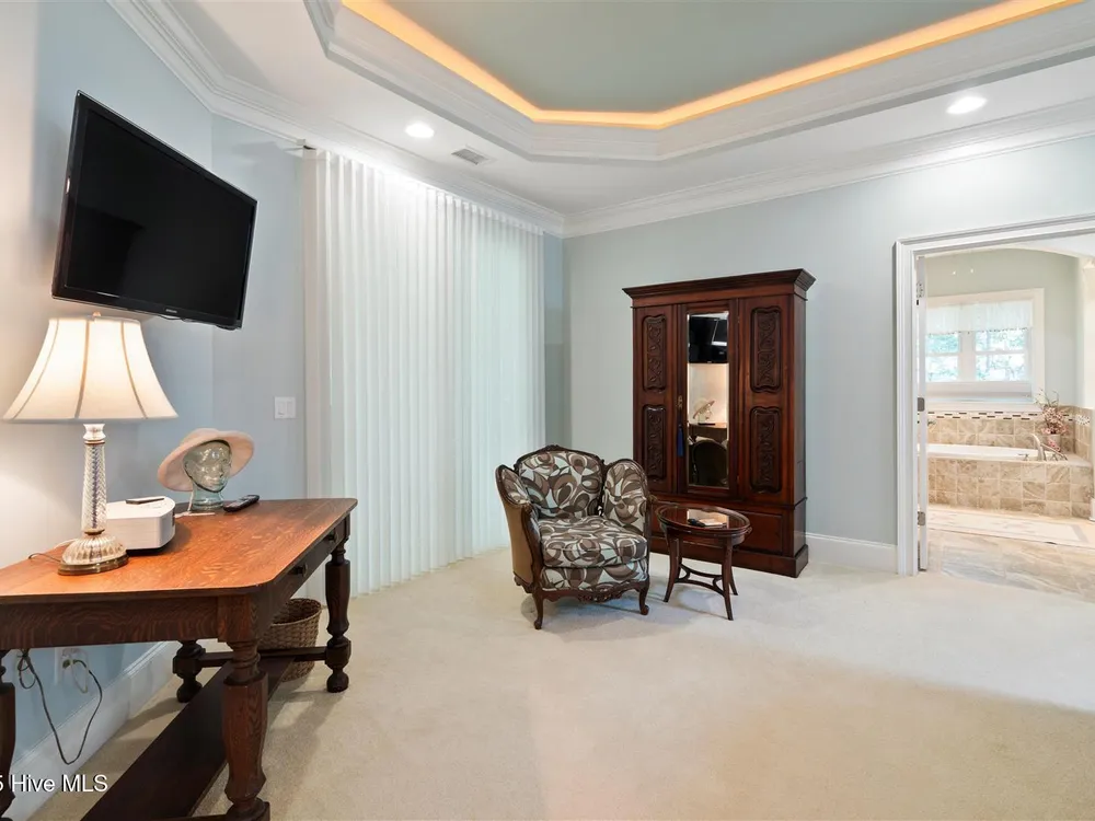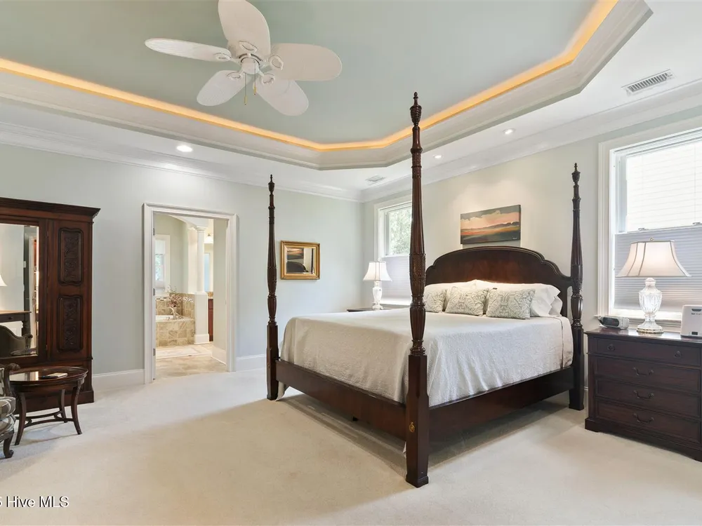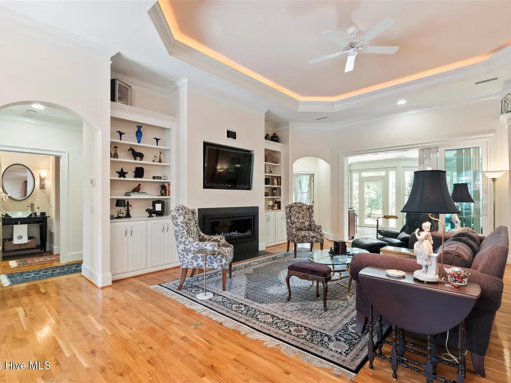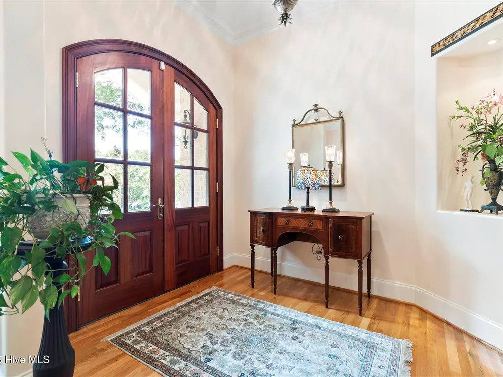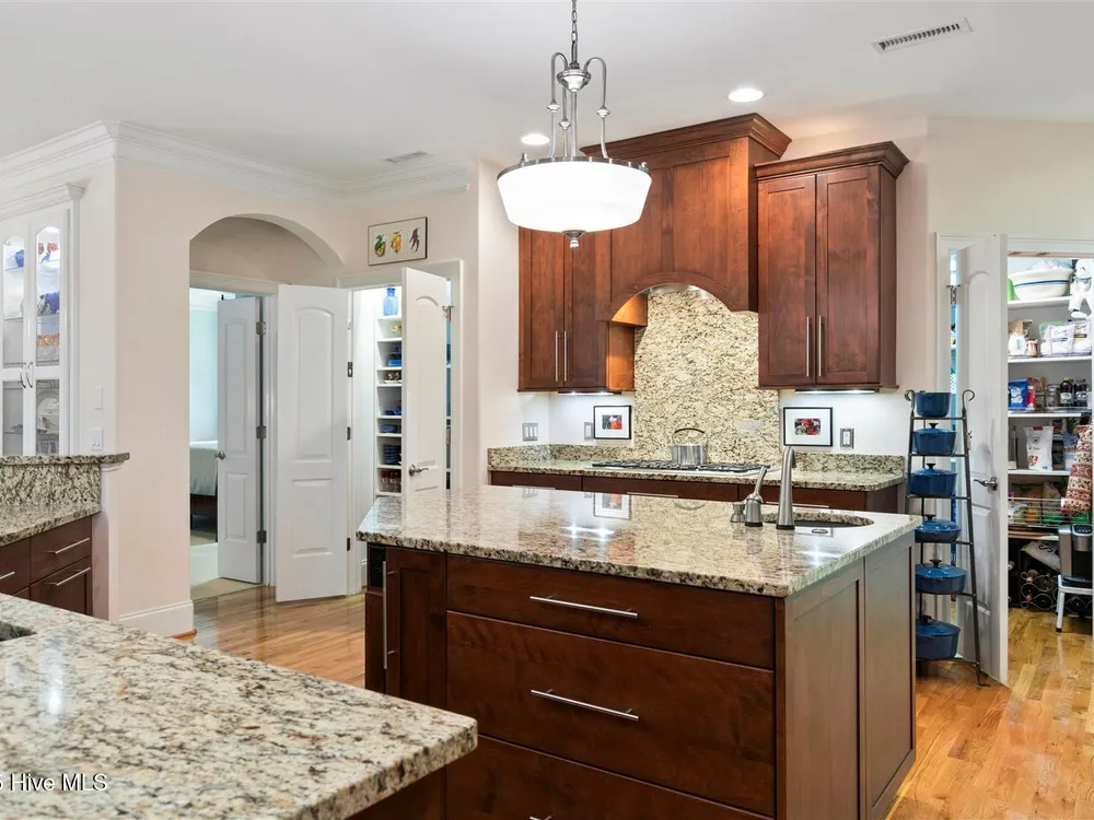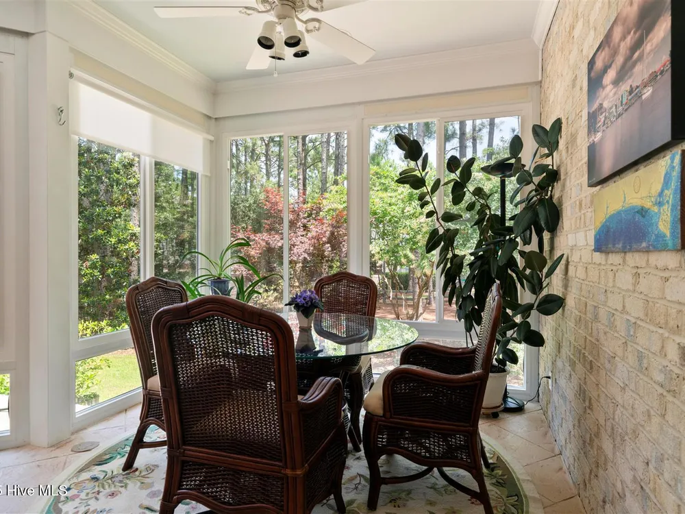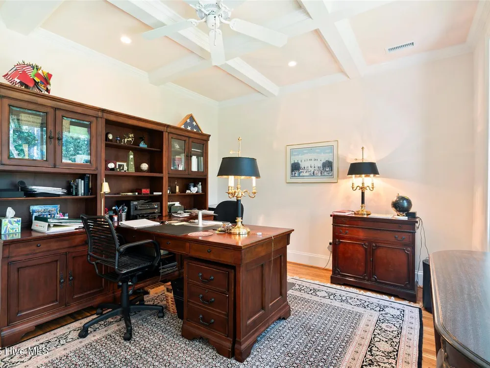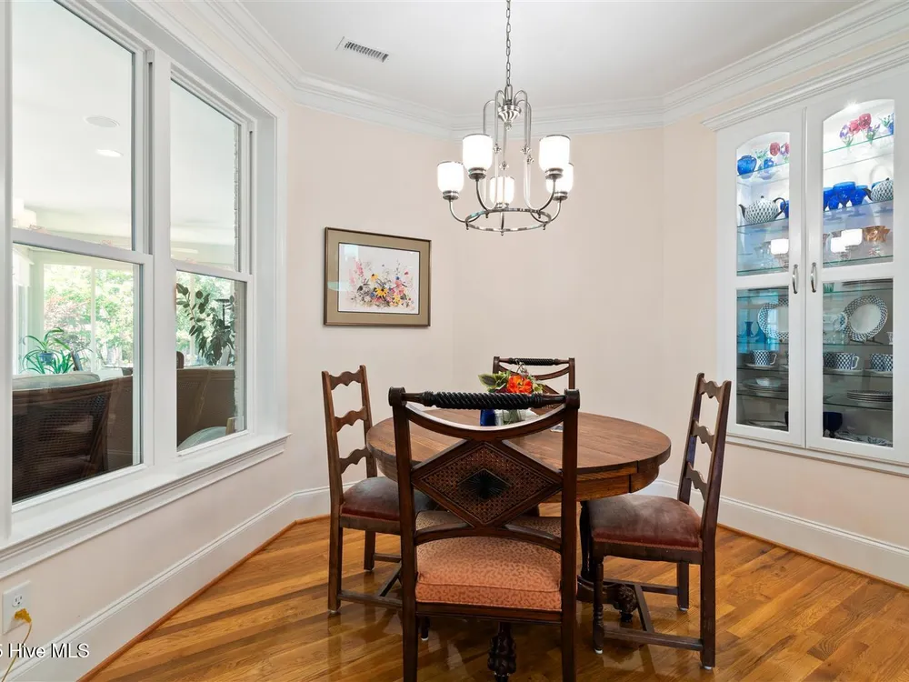 Enter through the gorgeous front door and discover elegance at its best! Gleaming Hardwood floors, a popular Open Floor Plan and large Sunlit rooms in over 4,000 square feet. The formal Dining room with a large beautiful window, wainscoting, trey ceiling with accent lighting opens to a spacious Great room. A very attractive Linear Gas Fireplace surrounded by built-ins and another trey ceiling with accent lighting makes this the perfect entertainment space. The Kitchen seamlessly blends functionality and style. Stainless steel appliances, two pantries, pull-out drawers, Thermador gas cooktop, KitchenAid double ovens, granite countertops and Food Prep Island are a chef's dream. You will love the Breakfast area with a beautiful built-in Display cabinet. The Carolina Room with telescoping glass doors opens to a large space that is inviting, light-filled and comfortable with backyard Nature views. Wet bar with beverage cooler and ice maker add to easy living! The Owners Suite is serene and spacious with a large closet. The spa-like Bath is generous with a heated floor, two vanities, granite countertops and a large tile shower. A large Laundry is conveniently located outside the Owners Suite. The split floor plan has two Guest Bedrooms and a full Bath affording privacy for you and your guests. A home Office and Powder room are also located on the main level. The outdoor Patio is located off the Carolina Room. Upstairs is a Flex Space with a full Bath and walk-in Closet that can be used as an additional bedroom or whatever you prefer. Garage is oversized and includes a conditioned storage room. A new Roof was installed in 2024. Please see upgrade list in Documents. Welcome Home to Coastal North Carolina!