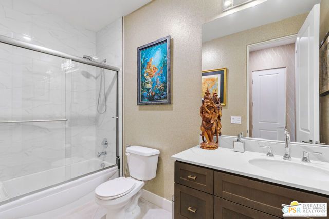 Welcome to this beautifully upgraded residence in the highly sought-after 55+ Villa Portofino community. This meticulously maintained 2,249 sq ft home occupies a premier location within the community, offering privacy and breathtaking south mountain views. The spacious floor plan includes 2 bedrooms, a den, a Casita and 3 bathrooms. The heart of the home is a spectacular great room that seamlessly integrates the living, dining, and kitchen areas, all under soaring 10-foot ceilings. The chef's kitchen boasts custom cabinets, stainless steel appliances, a large prep island, quartz countertops, and is extremely spacious with pull-out inserts. The great room opens to a covered south-facing patio through sliding glass doors. The den/office, located off the main hallway, provides a flexible space with custom built-in cabinets for a home office or could be closed in for an additional bedroom. The primary suite offers a luxurious retreat with a spa-like ensuite bath with dual vanities, large walk-in shower, and walk-in closet. One additional bedroom shares a well-appointed hall bath, while the attached Casita has an ensuite bath and private entrance. Additional features include custom wall coverings, custom window treatments and shutters, sconces, full laundry room, double car-attached garage with storage, and cost-saving solar panels. HOA dues provide access to the community clubhouse offering movie nights, a heated pool/spa, recreation/fitness facilities, Bistro Restaurant, Banquet Room, Billard Room, Card Room, Bocce Ball Court and Golf-Par3.
