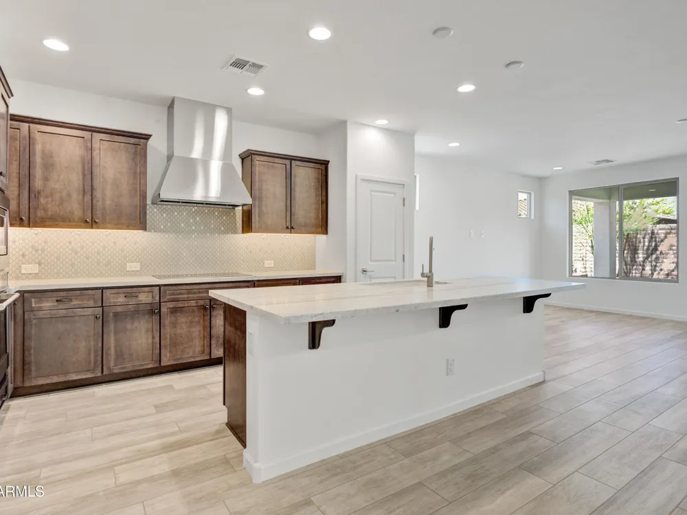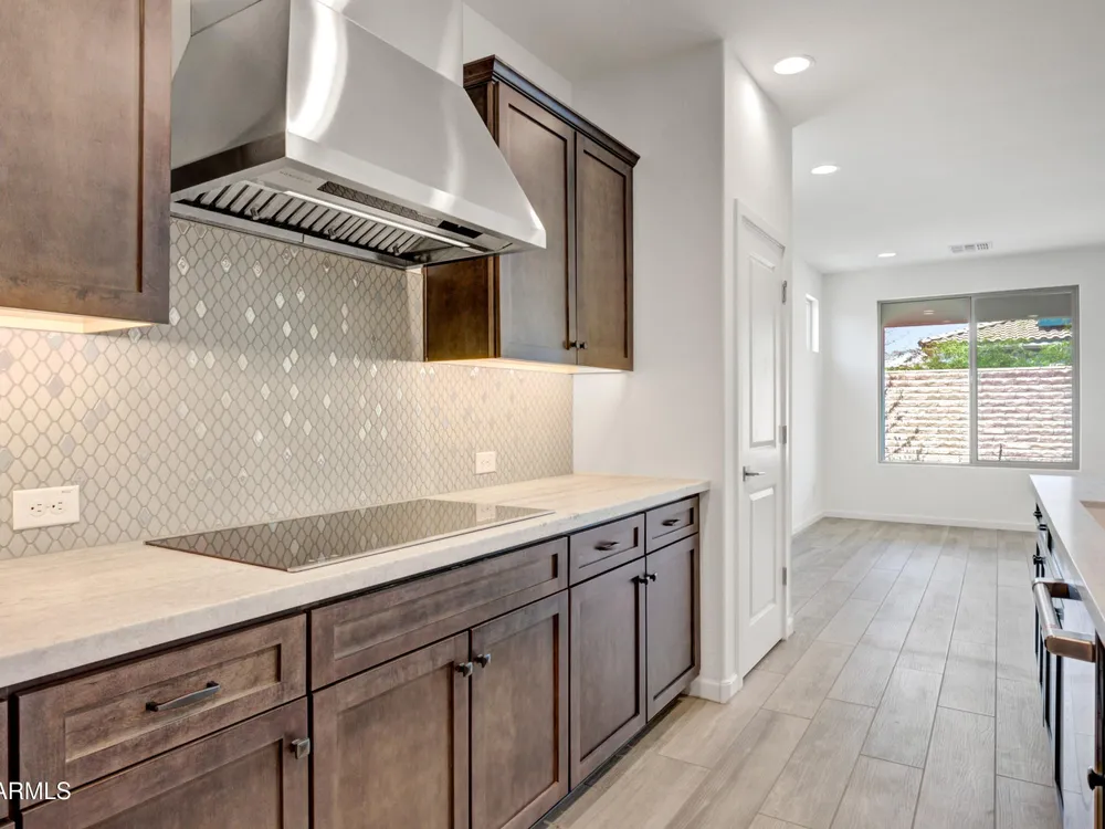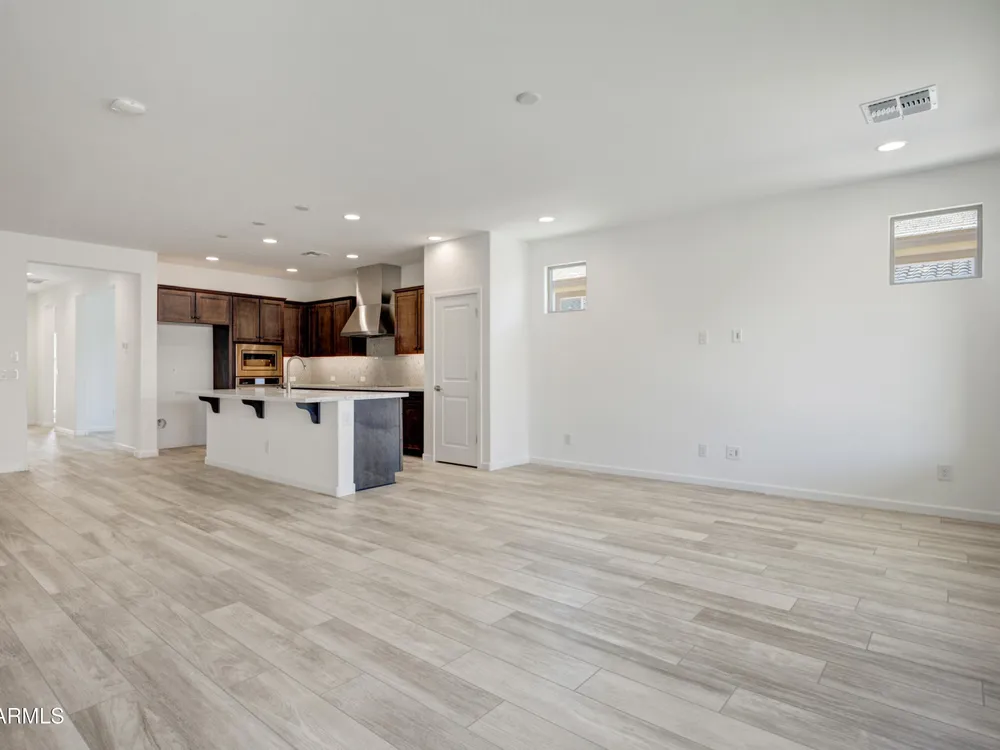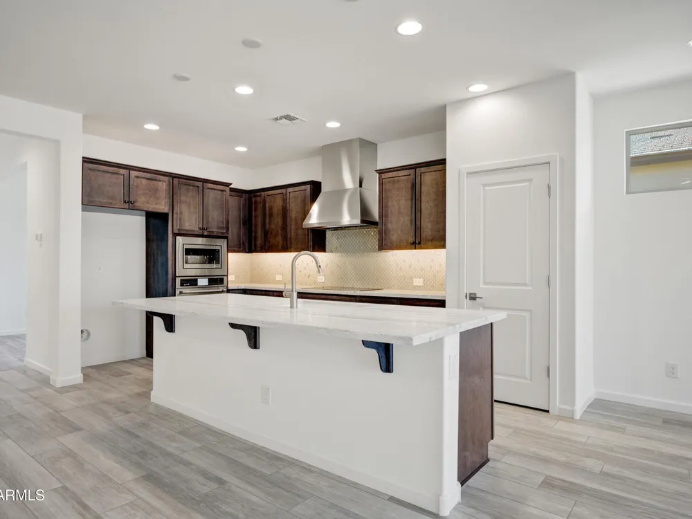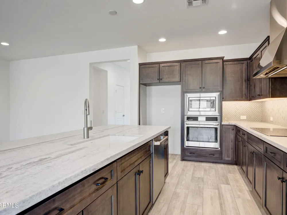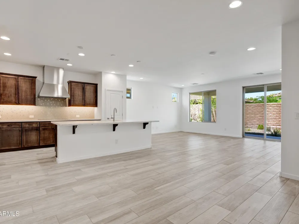 Shea-built Flourish plan in the Freedom Collection at Wickenburg Ranch. 1,811 sq ft, 3 bed, 2 bath, 2-car garage w/4' extension. 9' ceilings, upgraded flooring, Eclipse-stained cabinets w/soft-close drawers, Fantasy White granite, built-in Café appliances, LED under-cab lighting & pendant lights. Primary bath w/Shea shower, heavy glass enclosure, tile surround & brushed nickel fixtures. Extended patio, Smart TV wall sleeves, custom landscape, garage service door, & utility sink rough-in. Enjoy access to clubhouse, golf, dining, resort pool & more. This Shea-built Flourish floor plan in the Freedom Collection offers 1,811 sq ft of thoughtfully upgraded living in Wickenburg Ranch. With 3 bedrooms, 2 baths, and a 2-car garage with a 4' extension, this home features 9' ceilings and a flexible layout designed for entertaining and everyday ease. Enjoy Nantucket maple cabinetry in Eclipse stain with soft-close drawers, full overlay design, and under-cabinet LED lighting. The kitchen shines with Fantasy White satin granite counters, a built-in GE Café stainless appliance package, custom backsplash, and pendant lighting. The primary bath features a heavy glass Shea shower, brushed nickel fixtures, and ceramic tile throughout. Additional upgrades include luxury flooring, an extended covered patio, Smart TV wall sleeves, custom landscaping, utility sink rough-in, and premium exterior finishes.