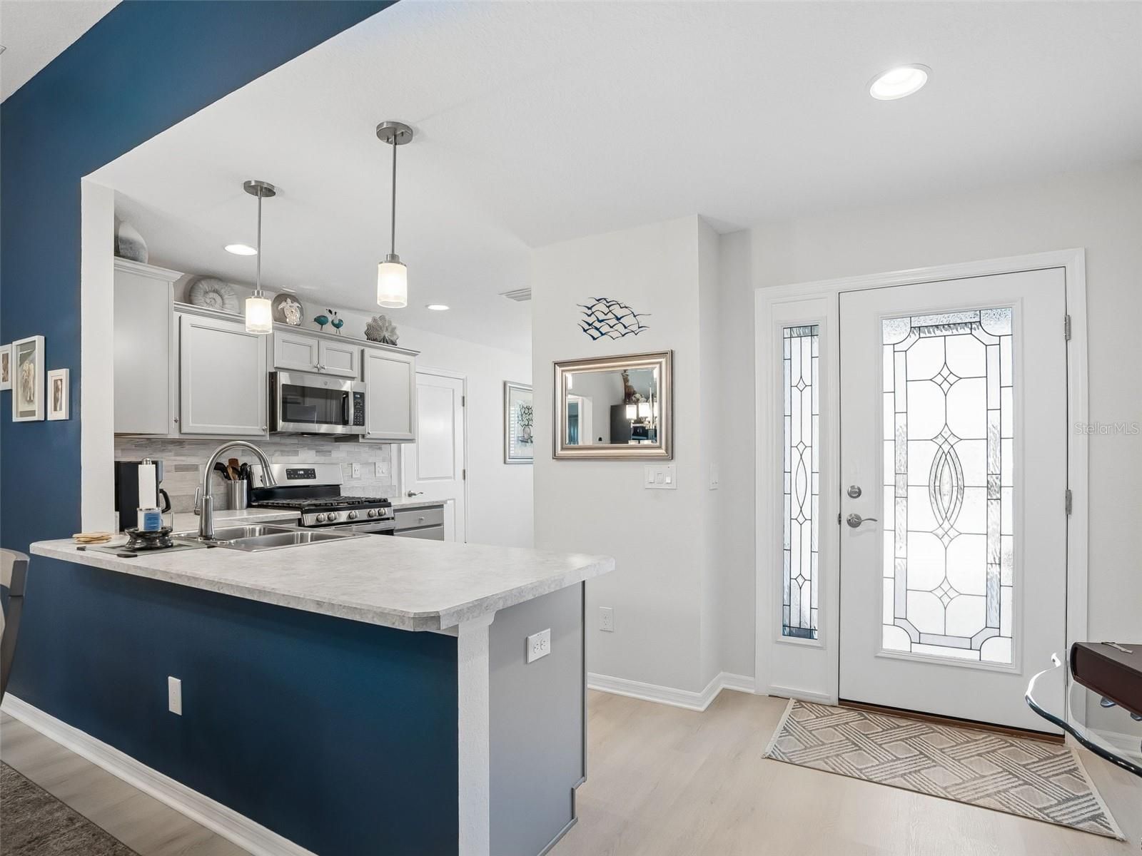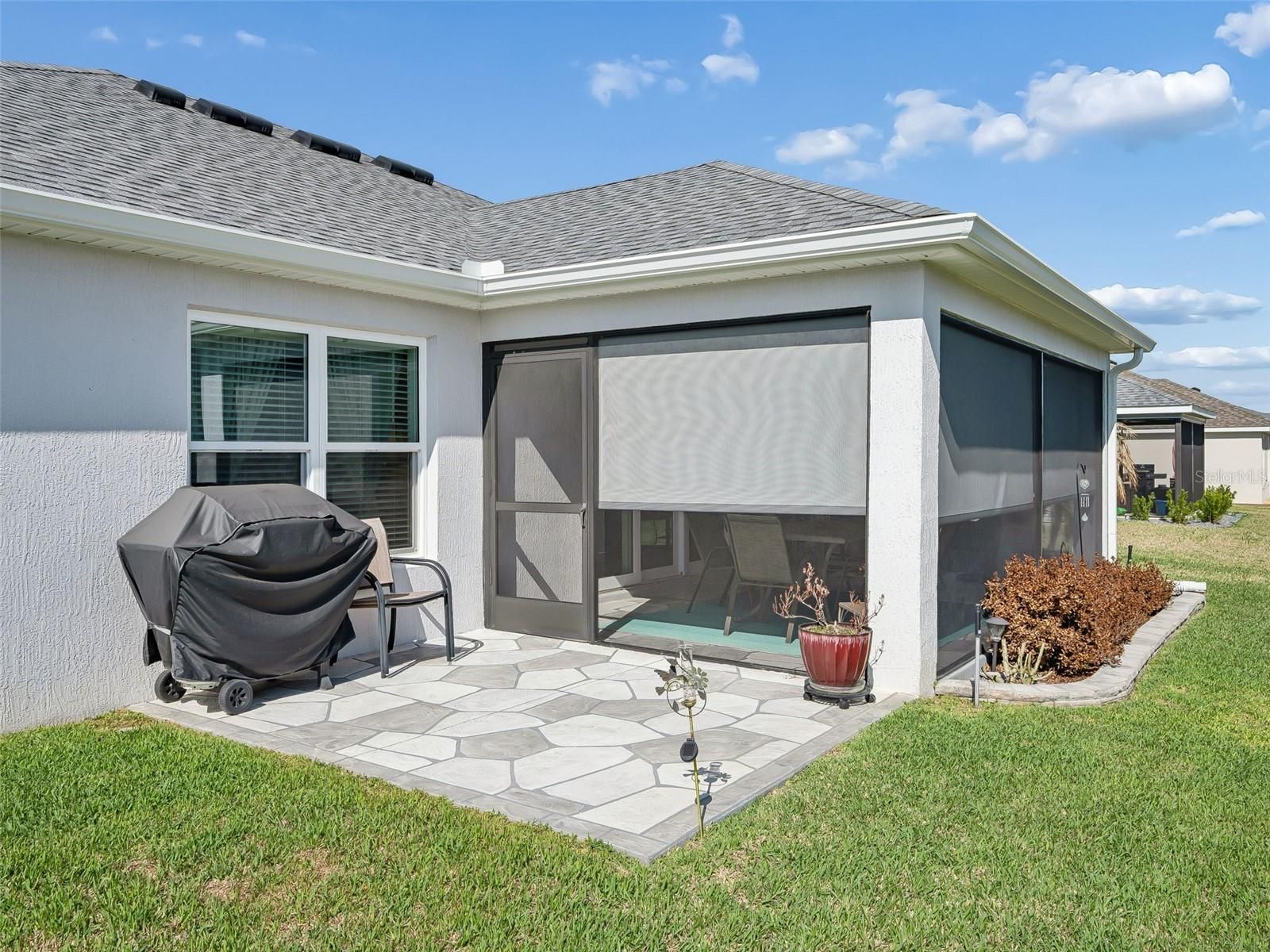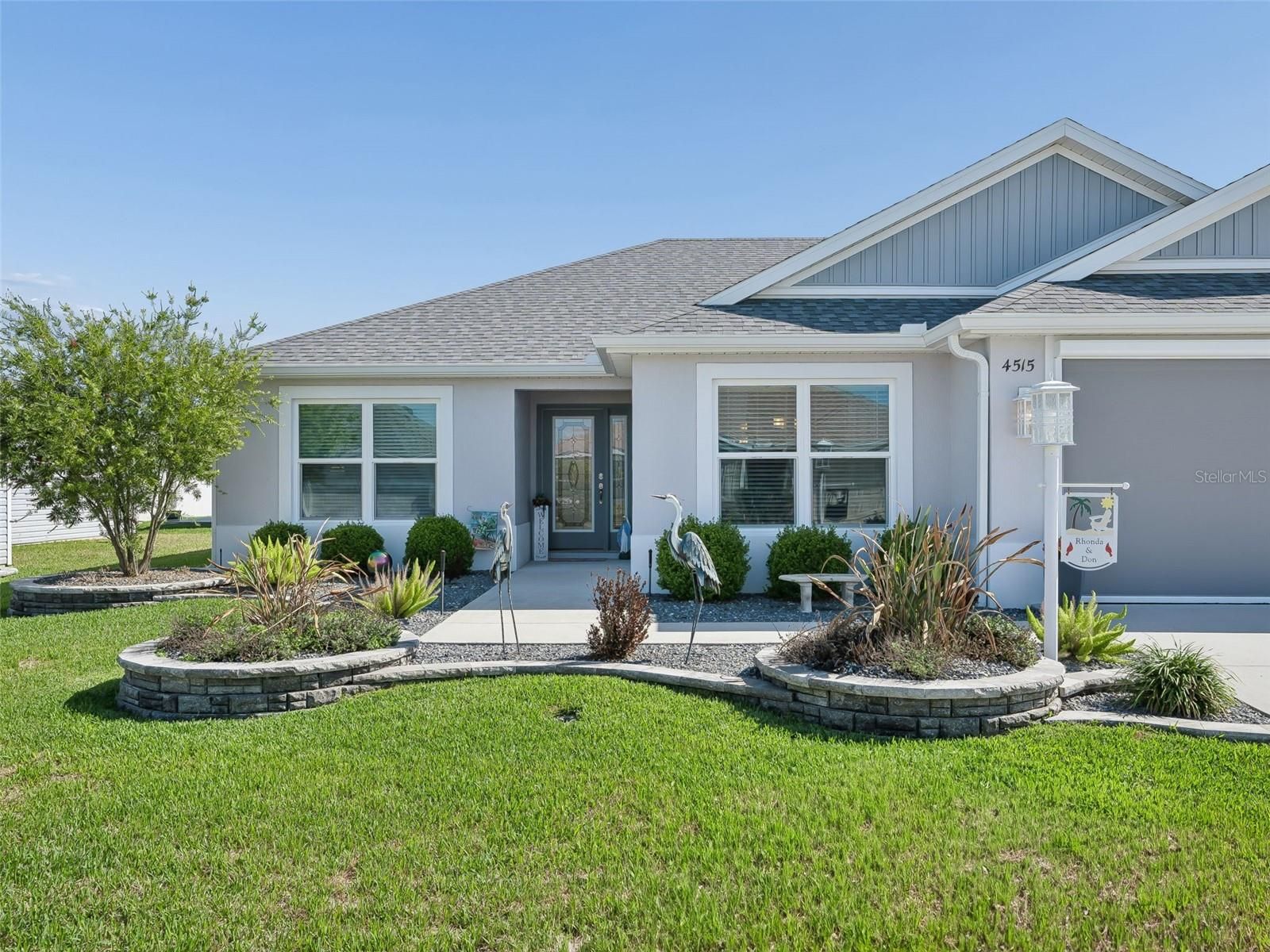Immaculate Jasmine Designer - Shows Like New! Located in the desirable Village of Del Luna, this beautifully maintained 3-bedroom, 2-bath concrete block and stucco Jasmine Designer offers exceptional curb appeal and thoughtful upgrades throughout. Situated on an offset homesite with elevated rock landscaping beds, the property presents a pristine exterior along with a 2-car garage plus an extended golf cart garage, complete with insulated garage doors and an automatic garage screen. A leaded glass front entry welcomes you into the foyer, opening to a bright open-concept floor plan featuring a stylish combination of luxury vinyl flooring in the main living areas and carpet in the bedrooms. The split-bedroom layout provides privacy while the kitchen overlooks the spacious great room, creating an ideal setting for entertaining and everyday living. The kitchen is well appointed with light gray cabinetry, pendant lighting, a breakfast nook, beveled-edge luxury laminate countertops, tiled backsplash, stainless steel appliance package with gas range, and a pantry. The great room features quadruple glass sliding doors that open to a screened lanai offering a pleasant view between two homes. The lanai is enhanced with beautiful stamped concrete flooring, and just beyond is a grilling patio finished with flagstone, perfect for outdoor dining and relaxation. The master suite boasts high ceilings, a spacious walk-in closet, and a linen closet, along with an elegant en-suite bath featuring dual sinks, beveled-edge luxury laminate countertops, and a stunning walk-in Roman shower. The guest wing can be closed off with a pocket door for privacy and includes two guest bedrooms and a full bath with a beautifully tiled tub/shower combination. The front bedroom features a tray ceiling, adding architectural interest. Conveniently located just off the master suite, the laundry room offers extra cabinetry and a large storage closet. Additional upgrades include: • Painted and Sealed Garage Flooring with Vented Attic Access and Ceiling Fan • 5-inch Gutters Surrounding Home • Tankless Hot Water Heater • Whole-House Nova Water Filtration System • Privacy Shades on Lanai and Window Treatments Throughout • Full Irrigation System • Architectural Shingles and Double-Pane Windows. Ideally located near shopping, recreation, and amenities, this meticulously maintained home shows like new and is truly move-in ready. GOLF CART and some FURNISHINGS available separately.