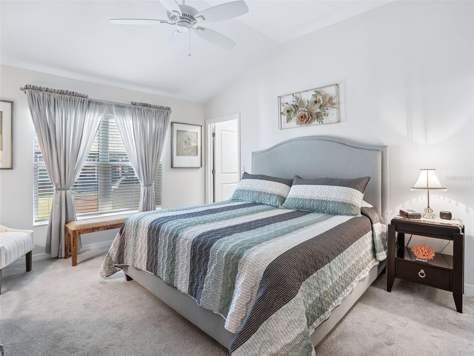 - Ceiling Fan(s), Eat-in Kitchen, High Ceilings, Open Floorplan, Main Level Primary, Split Bedrooms, Thermostat, Vaulted Ceiling(s), Walk-In Closet(s), Window Treatments
