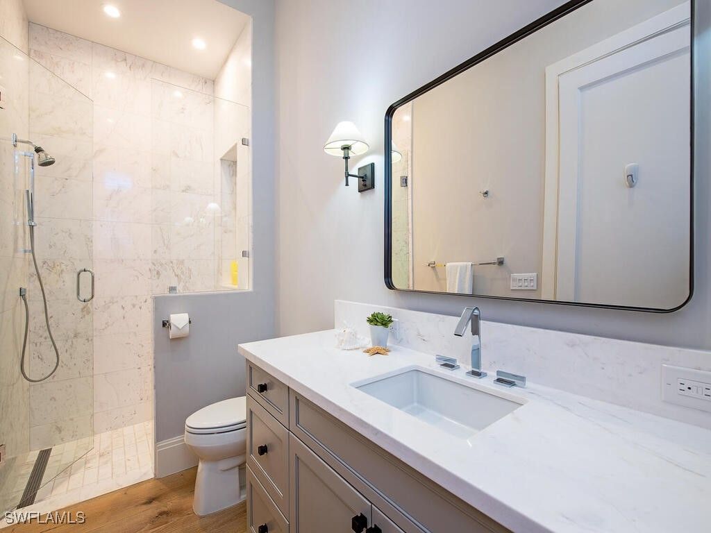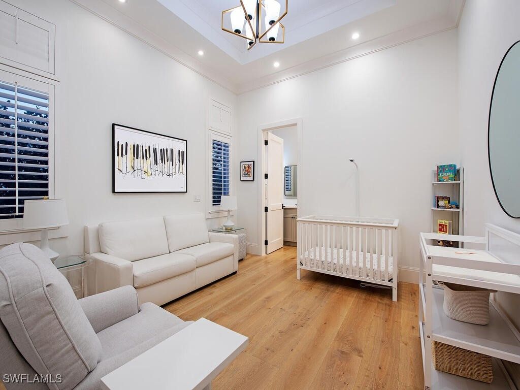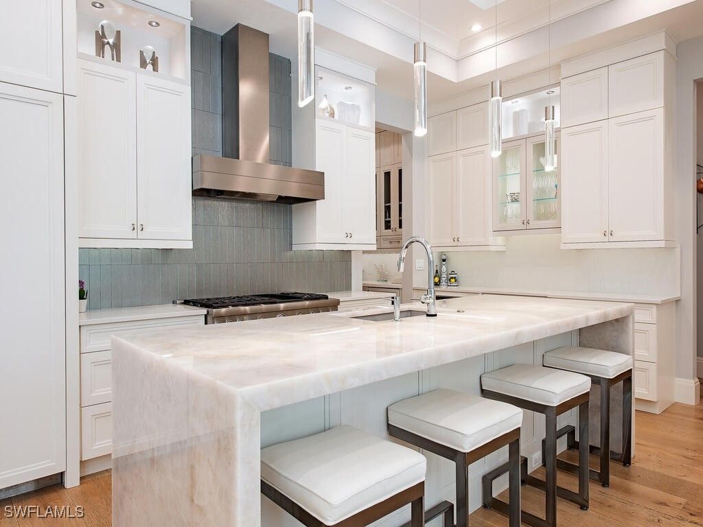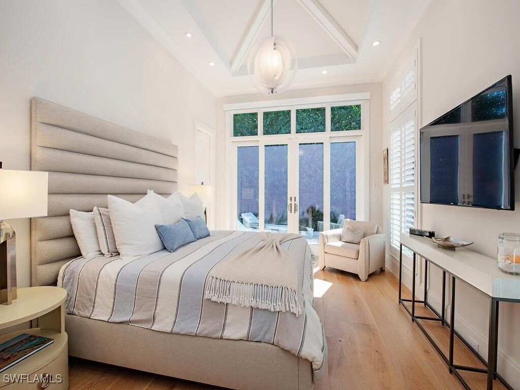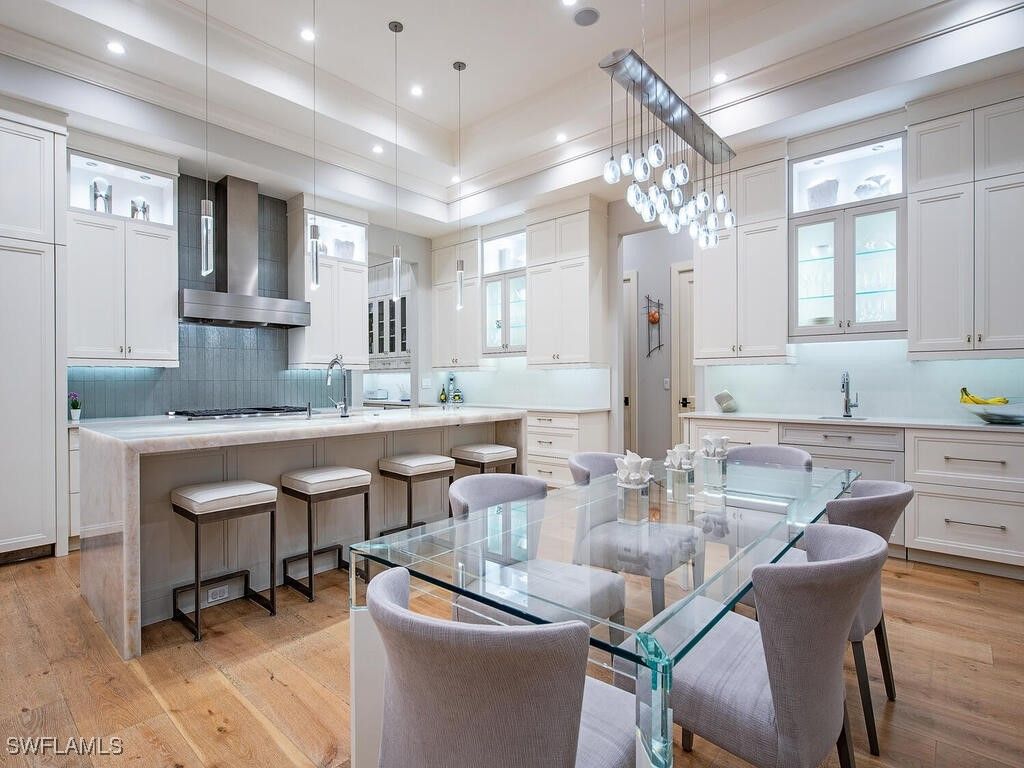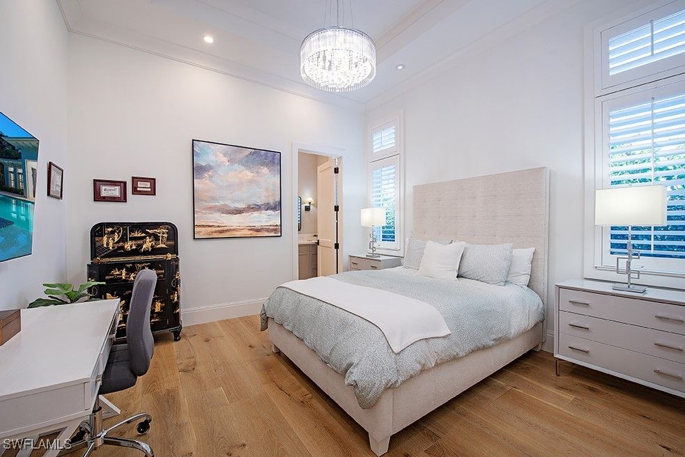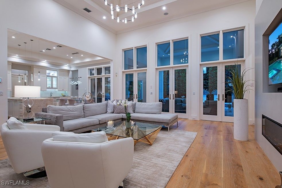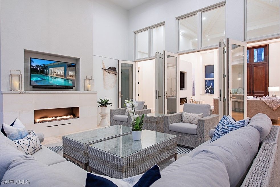 Located west of Crayton Rd. with preferred southern exposure for sun on the pool and within walking distance to the Moorings Private Beach as well as the Moorings Country Club. This home was professionally designed and furnished by Koastal Design Group in a contemporary beach style, both casual and comfortable and perfect for the Naples lifestyle. Boasting 5 en-suite bedrooms 6 bathrooms all on one floor with a large, covered lanai that spills out onto the expansive pool deck. A wonderful gourmets kitchen featuring a gas cooktop, 2 dishwashers, 2 wine coolers, refrigerated drawers, and a butler’s pantry, breakfast room and a large island perfect for socializing. The home automation system has been recently updated featuring Control4, internet boosters, and built-in speakers stationed throughout the home. A double front door entry leads to a living area with high vaulted ceilings and pocketing glass sliders filling the space with natural light. The covered lanai has a summer kitchen, fireplace, as well as automated roll down screens and storm shutters and spills out to the saltwater heated pool and spa. Inspired details throughout in keeping with a coastal feel include wide plank white oak floors, beadboard ceiling treatments, soft stone countertops, and large windows throughout giving sight lines to the lush tropical landscaping that surrounds the property. Other nice features include a built-in work office space located off of the kitchen, a spacious laundry with large windows providing an abundance of natural light, buried propane tank, updated security system, a guest suit with private pool access, and fenced back yard. A large circular driveway leads to a split 3 car garage. Anderson impact windows and a high elevation make this offering a special property.