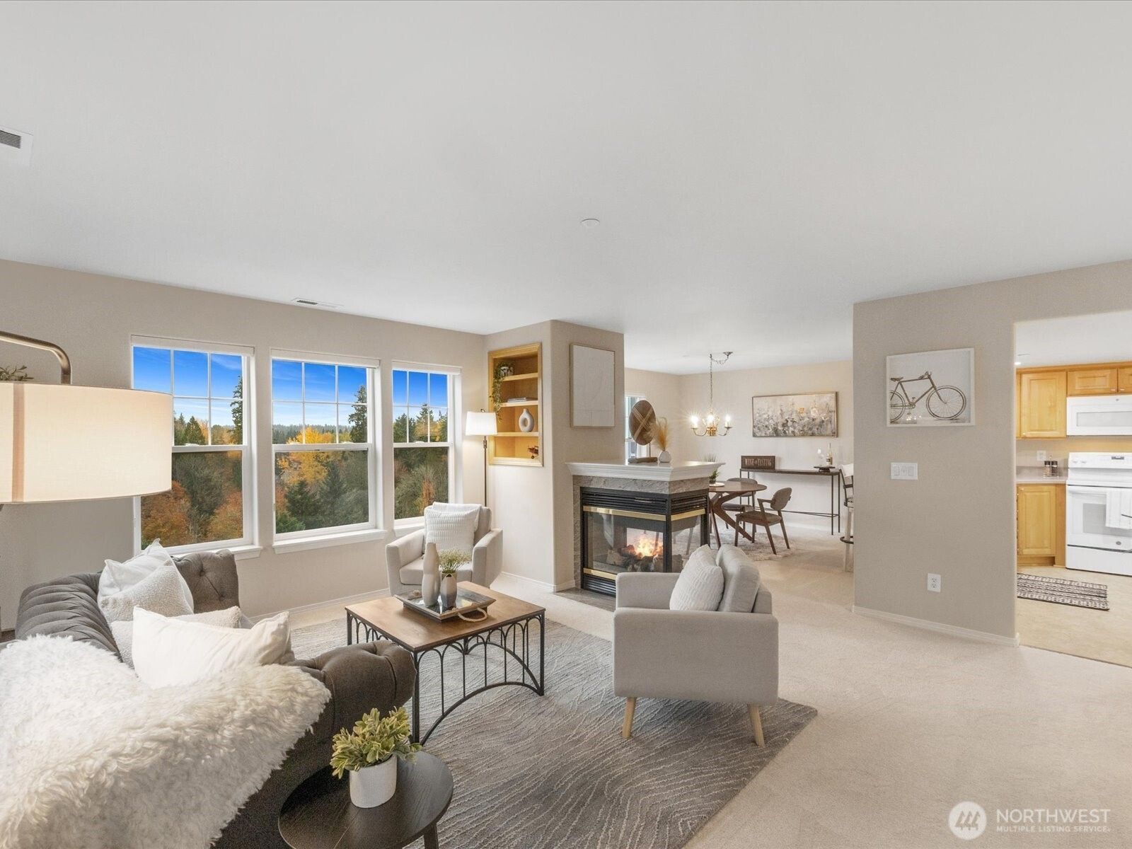 Stunning Cascade and Valley views from this light-filled, one-level condo in the friendly 55+ community of Providence Point! The beautiful open floor plan feels spacious & inviting with a cozy gas fireplace, fresh paint, new carpet, & huge windows that fill the home with sunshine. Primary bedroom w/en-suite bath, tons of closet space, second bed w/ a custom-built Murphy bed ideal for guests. Rare, fully permitted bonus room off the private one car garage offers a great flexible space for hobbies, office space, crafts, or additional storage. Enjoy AC in the summer & views from your private patio. Forest Village is known as the most desirable neighborhood in the complex, w/walking trails, well-run HOA & wonderful amenities. Not one to miss!!