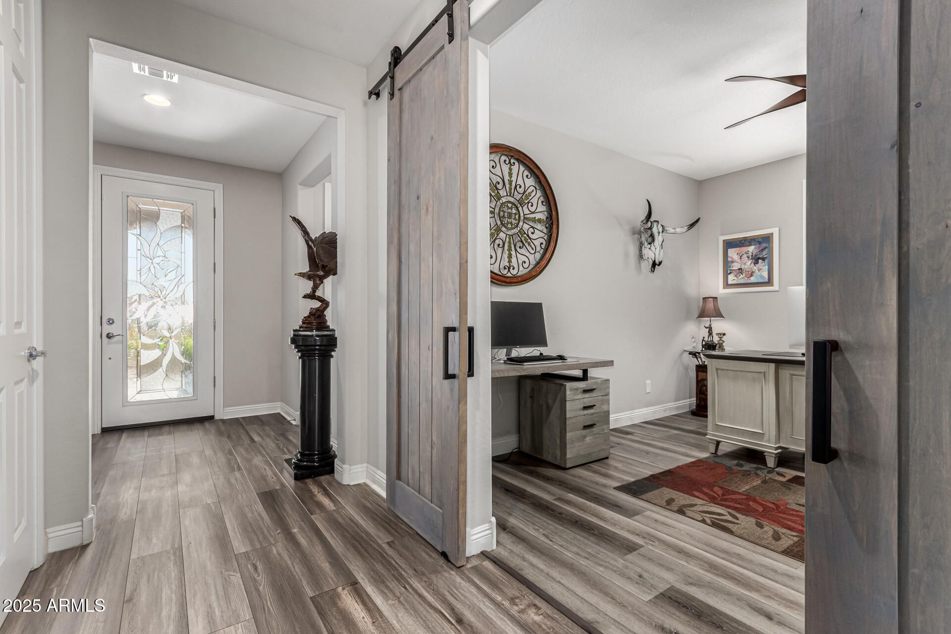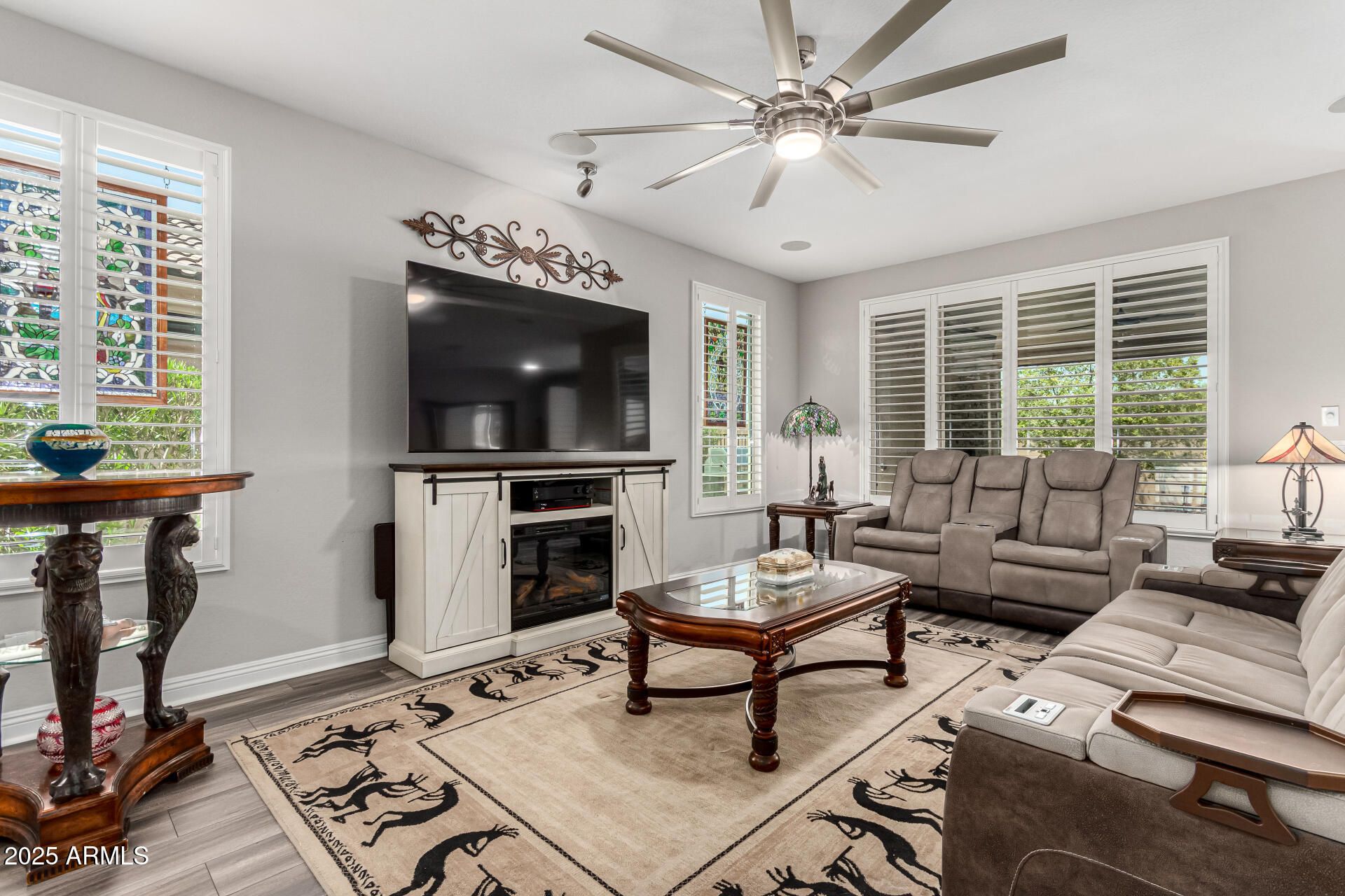 LOOKING FOR AN ACTIVE LIFESTYLE? This amazing Preserve is loaded w/UPGRADES! Gorgeous leaded glass entry sets the stage. Impressive 8' doors, 5'' base, Plantation Shutters, luxury vinyl floors thru-out, Chef Lux Kitchen w/pull-outs, soft close drawers, pots & pans drawers, quartz counters, stainless appliances, gas cooktop. Spacious Great Room w/ wet bar overlooking the covered patio w/ gas f/p, ext. travertine patio, lush landscape, turf, fully fenced & electronic sun shades create additional space for entertaining. Primary offers bay window, patio door, tiled walk-in shower & oversized closet. Den creates space for work/guests w/ barn door closure. Laundry w/cabinets/counters/ sink..2 car gar. w/epoxy floors, service door, workbench, SPLIT UNIT, cabinets + GOLF CART garage, SOLAR $AVING$