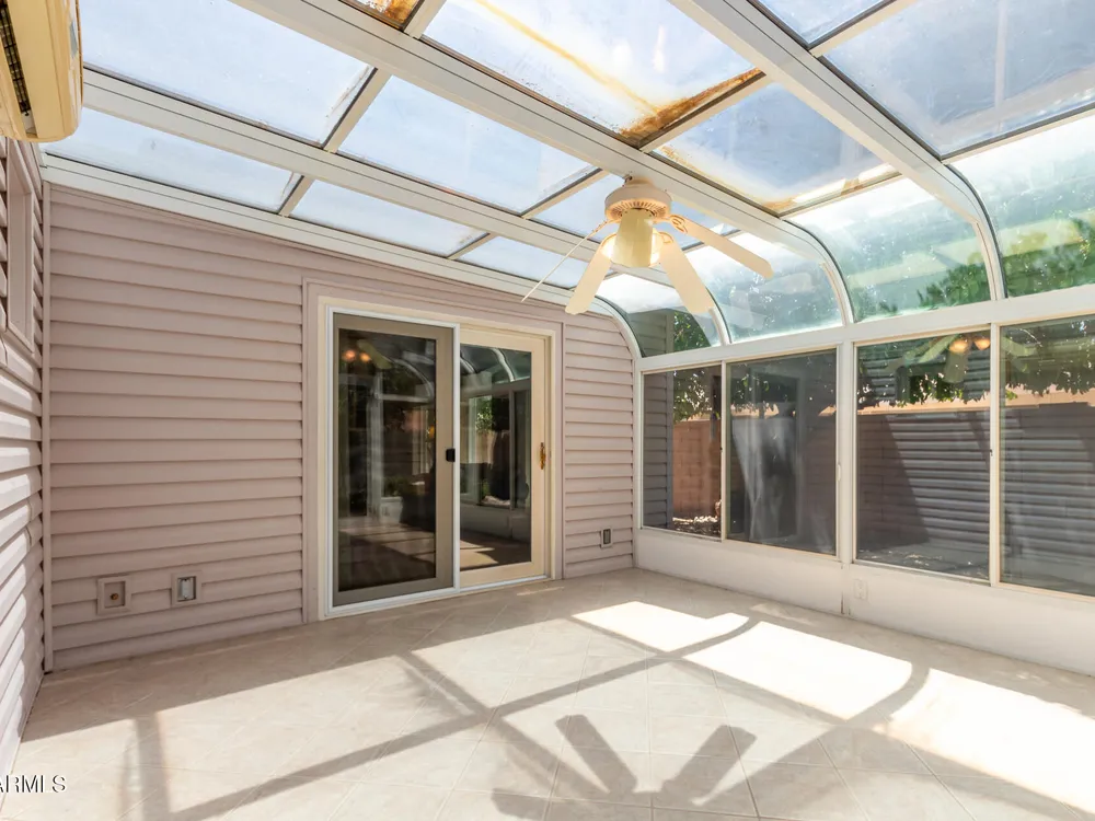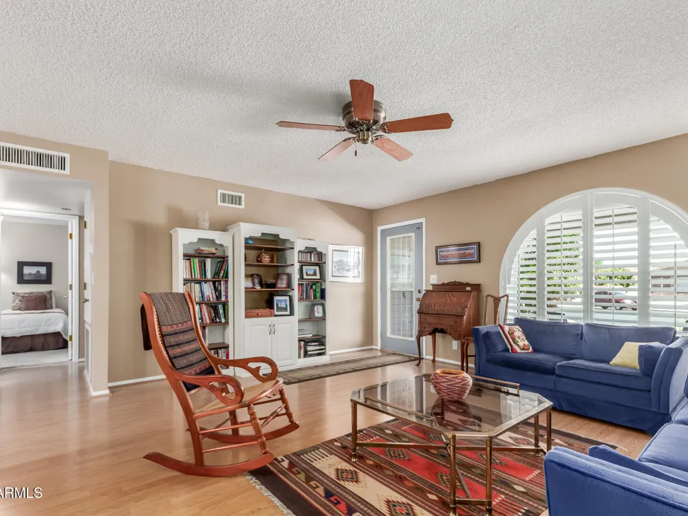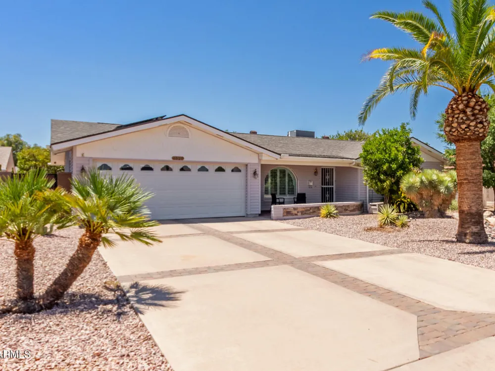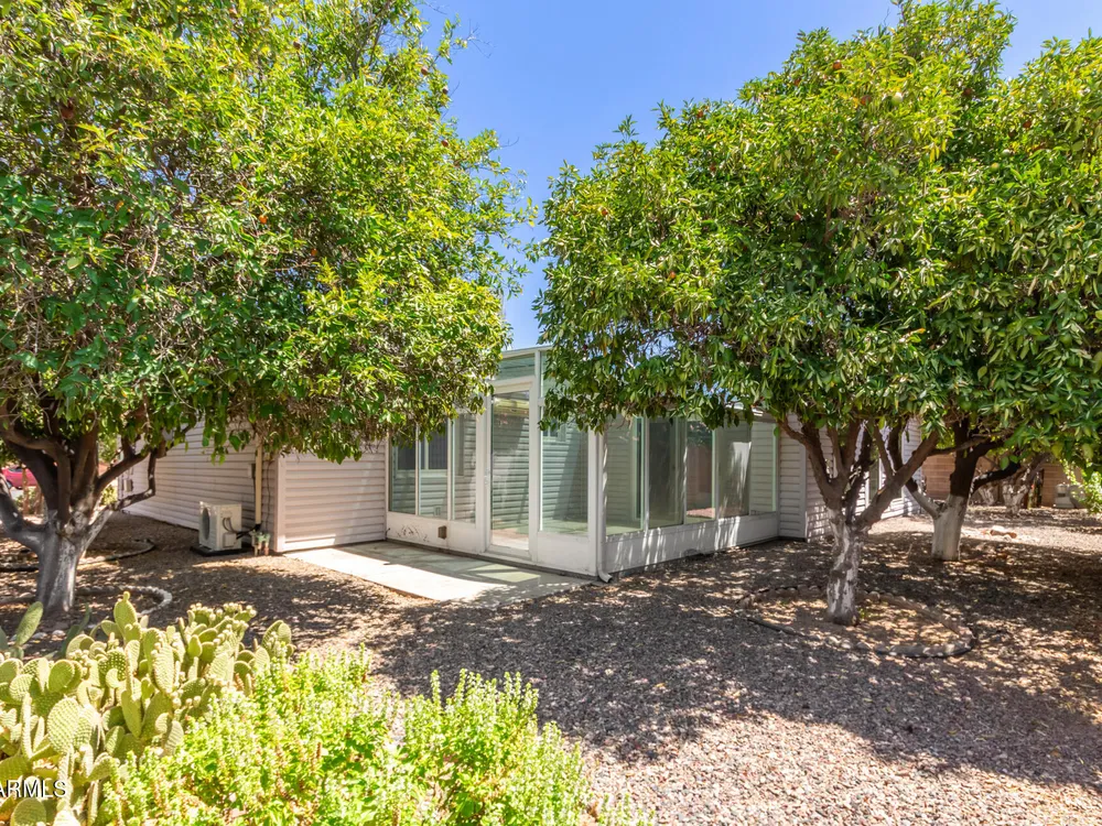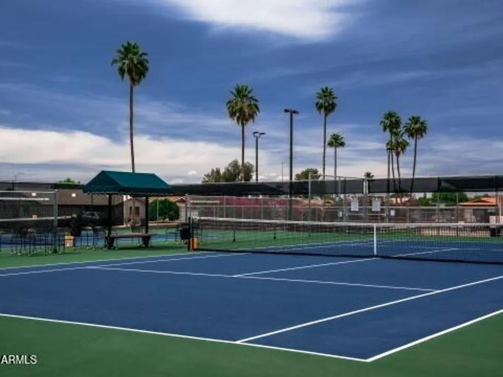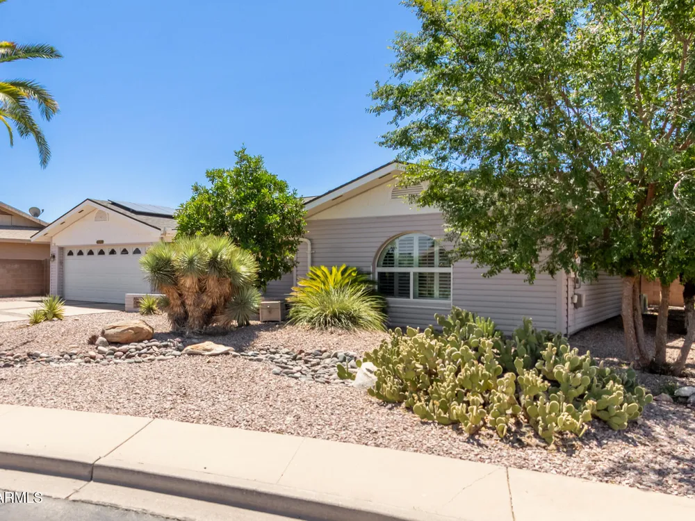 Perfectly located on a desirable cul-de-sac! Start enjoying the comfort and convenience of this energy-efficient residence in the adult Community of Sunland Village! Discover a blend of tile & wood-look flooring, owned solar, built-in book cases, a vaulted ceiling, and plantation shutters in some windows. Entertain with ease in the combined living & dining room or the large family room with a skylight that adds extra charm. The kitchen provides recessed lighting, quartz countertops, abundant cabinetry, and stainless steel appliances. The main bedroom serves as a serene retreat, featuring two mirrored door closets, and a private bathroom with a granite vanity. Spend relaxing afternoons in the Arizona room! This amazing abode won't last!