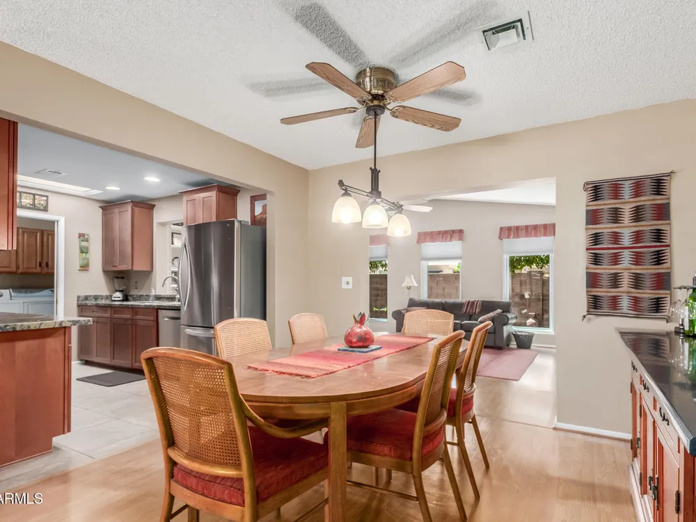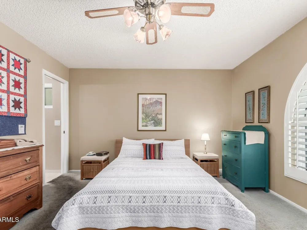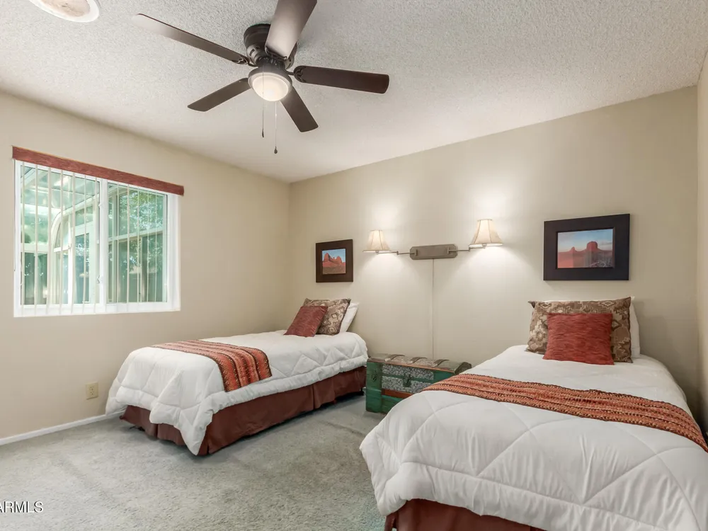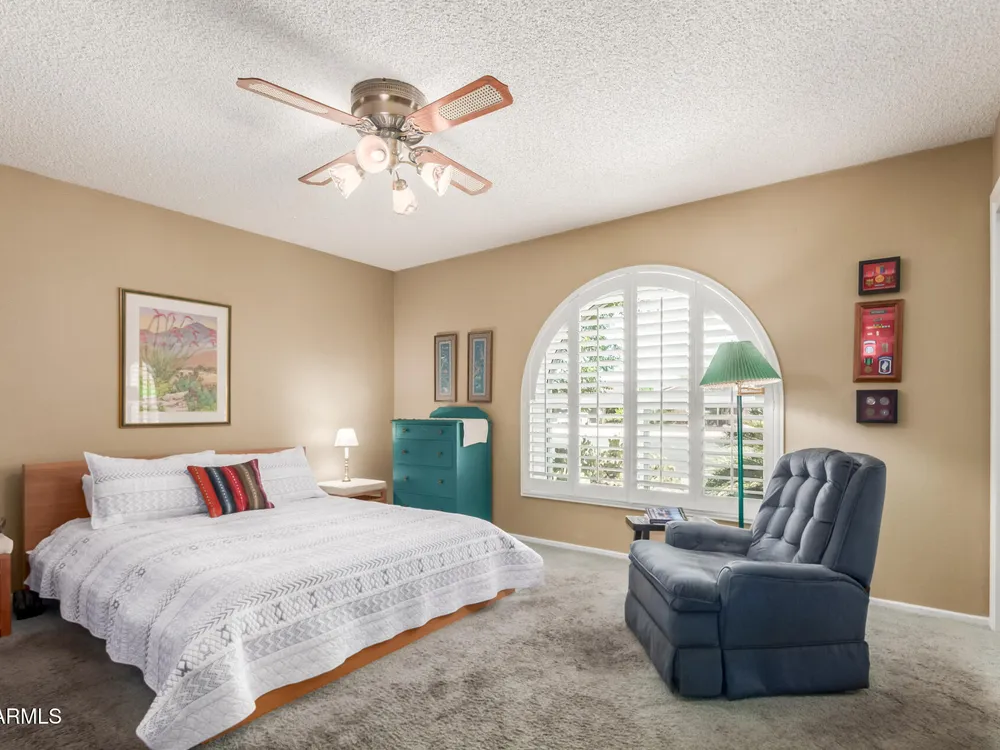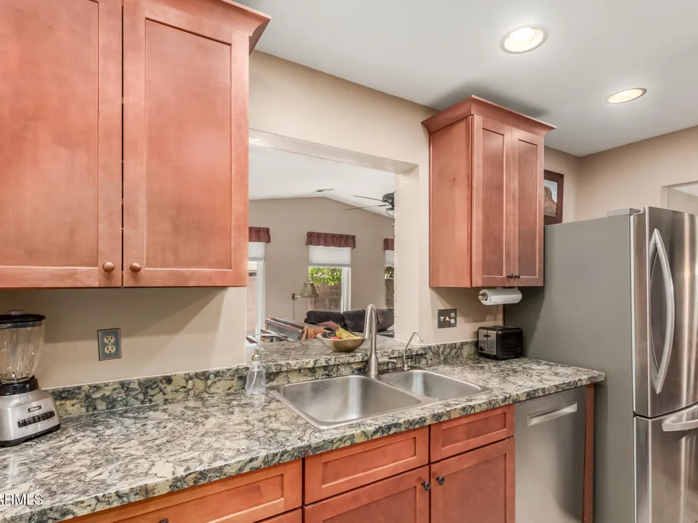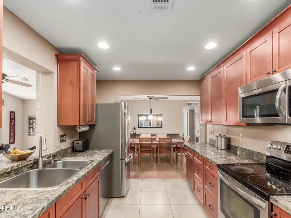 Perfectly located on a desirable cul-de-sac! Start enjoying the comfort and convenience of this energy-efficient residence in the adult Community of Sunland Village! Discover a blend of tile & wood-look flooring, owned solar, built-in book cases, a vaulted ceiling, and plantation shutters in some windows. Entertain with ease in the combined living & dining room or the large family room with a skylight that adds extra charm. The kitchen provides recessed lighting, quartz countertops, abundant cabinetry, and stainless steel appliances. The main bedroom serves as a serene retreat, featuring two mirrored door closets, and a private bathroom with a granite vanity. Spend relaxing afternoons in the Arizona room! This amazing abode won't last!