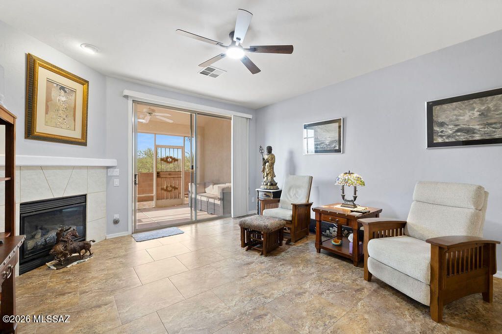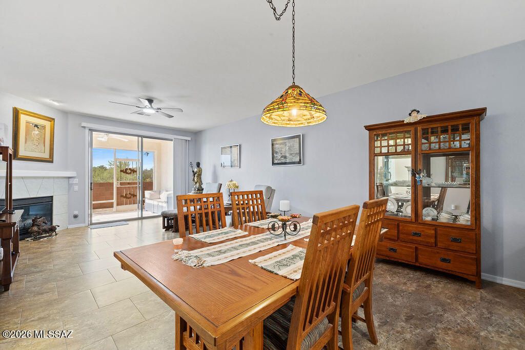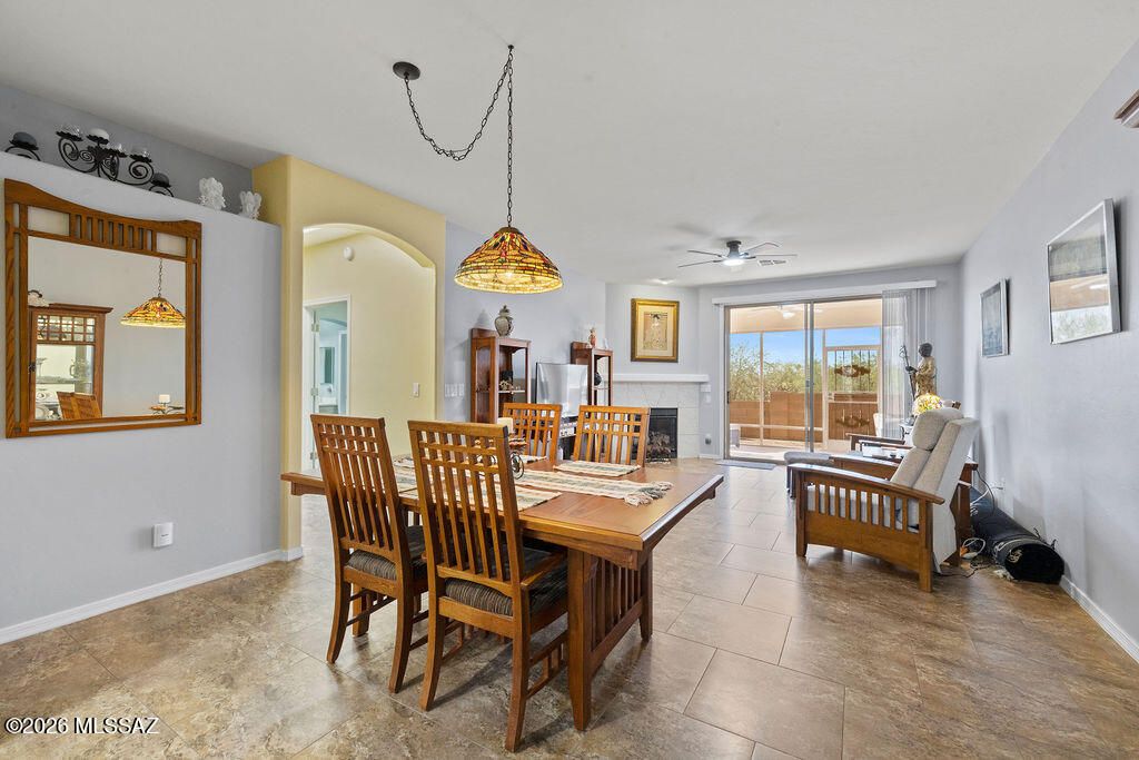 Charming and meticulously maintained 2-bedroom, 2-bath townhome in desirable Canyon View Estates, offering resort-style amenities and convenient access to shopping and dining. The open living and dining area features a cozy gas fireplace and flows seamlessly to a screened-in patio--perfect for enjoying indoor-outdoor living with mountain views. These views also are shared with master suite. Enjoy an enclosed wrought-iron front patio, upgraded windows, ceiling fans, and ceramic tile throughout. The backyard showcases a brick patio pavers with breathtaking mountain, sunrise, and sunset views. Community amenities include a pool and spa, expansive clubhouse with library, fitness room, large kitchen, and abundant indoor and outdoor gathering spaces for events. This home is not part of GVR.