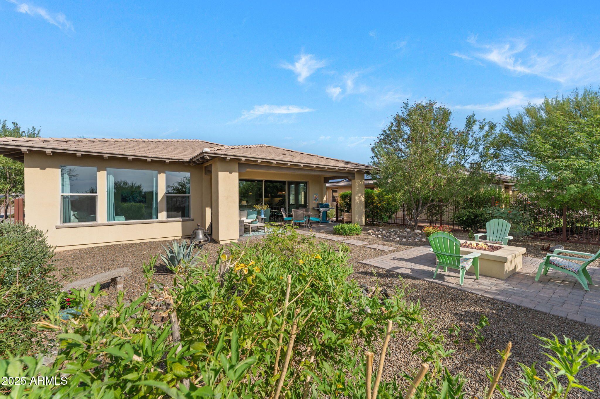 Welcome to a stunning home on a private corner lot, thoughtfully upgraded for style, comfort, and functionality. The inviting open concept is filled w/natural light from the 15' multi-slide glass doors. Kitchen is thoughtfully designed w/walk-in pantry, stunning granite slab counters, SS appliances, gas cooktop & custom blown pendant lights perfect for entertaining or everyday living. Primary suite offers a peaceful retreat w/granite counters, tiled shower, & large walk-in closet. This floor plan is rounded out w/Guest Suite, Full Hall Bathroom & Den that could be used as extra bedroom. Backyard w/built-in firepit and is fully fenced in for your furry friends. Extra features include 4' garage extension & upgraded Smart Space. This home is located w/easy access to walking trail & Lake Park
