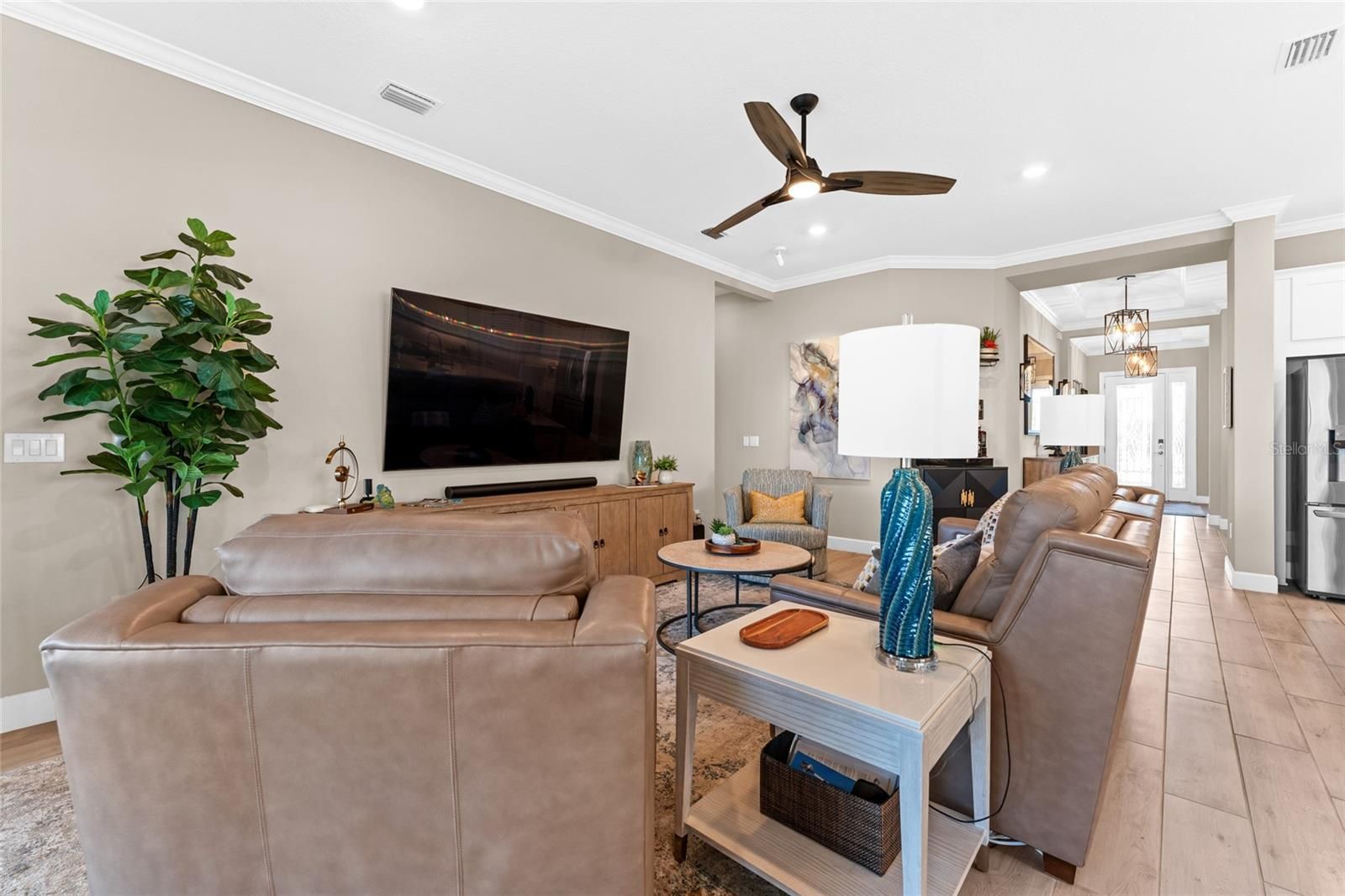Vacation-style living meets refined design in this extensively upgraded Farnese floor plan—far from builder-grade and thoughtfully enhanced throughout. The open-concept layout is both inviting and highly functional, centered around a beautifully appointed kitchen with an expansive island ideal for everyday meal prep, casual dining, and effortless entertaining. The kitchen flows seamlessly into the light-filled gathering room and adjacent dining space, creating a connected living experience. Pocket sliding glass doors extend the living area to a serene, covered lanai featuring durable polyaspartic flooring—perfect for sunset dinners, weekend gatherings, or quiet mornings with coffee. The primary suite is a tranquil retreat, highlighted by triple windows that flood the space with natural light and frame peaceful water views. The spa-inspired en-suite bath offers dual vanities, a spacious walk-in shower, and a custom walk-in closet designed for both comfort and organization. Guest bedrooms are thoughtfully positioned, each with access to its own full bath—ideal for hosting family and visitors with privacy in mind. The well-appointed laundry room adds exceptional functionality with extensive cabinetry, quartz countertops, and a dedicated utility sink. An impressive list of structural and cosmetic upgrades enhances the home’s comfort, style, and efficiency. Features include 10-foot ceilings, 8-foot interior doors, pocket sliding glass doors, and a 2+ tandem garage with polyaspartic flooring. Outdoor living is prepped for customization with outdoor kitchen and fireplace rough-ins, while a widened driveway adds an additional three feet for convenience. Additional upgrades include high-end Minka smart fans throughout, a brand-new never-used smart washer and gas dryer, re-cemented and sealed roof tiles (May 2025), enhanced landscape and lanai lighting (see twilight photos), and added insulation in both the garage door and attic. Located within Esplanade at Artisan Lakes, residents enjoy a true resort-style lifestyle centered around an expansive Amenity Center. Offerings include a 6,000-square-foot facility with a state-of-the-art fitness center, aerobics studio, spa and wellness services, café, gathering spaces, scenic walking trails, firepit lounges, tennis, pickleball, and bocce courts, along with a resort-style pool and hot tub. Residents also enjoy access to The Venue, featuring an additional pool, a larger hot tub, cornhole courts, and dedicated spaces for outdoor socializing and events. A full-time lifestyle manager curates an active social calendar filled with wellness programs, community events, and culinary experiences—making it easy to stay engaged while still enjoying a relaxed pace of life. Perfectly positioned just off I-75, the community offers convenient access to shopping, dining, medical facilities, golf, parks, and entertainment throughout Palmetto and the greater Tampa Bay area. Travel is effortless with access to three international airports—St. Pete–Clearwater, Tampa, and Sarasota—all within easy reach. Sarasota, St. Petersburg and Tampa offer pristine beaches, professional sporting events, and cultural attractions. Whether you’re seeking a full-time residence or a seasonal retreat, this exceptional home—and its vibrant community—offer the very best of Florida living.