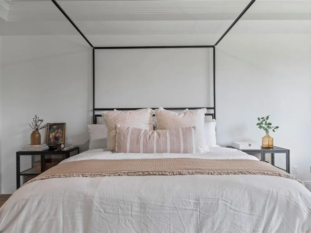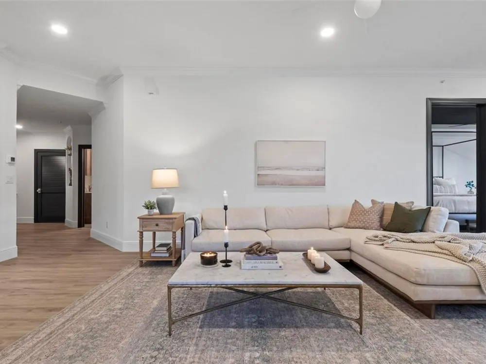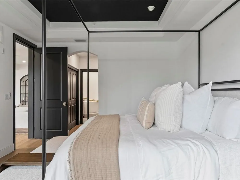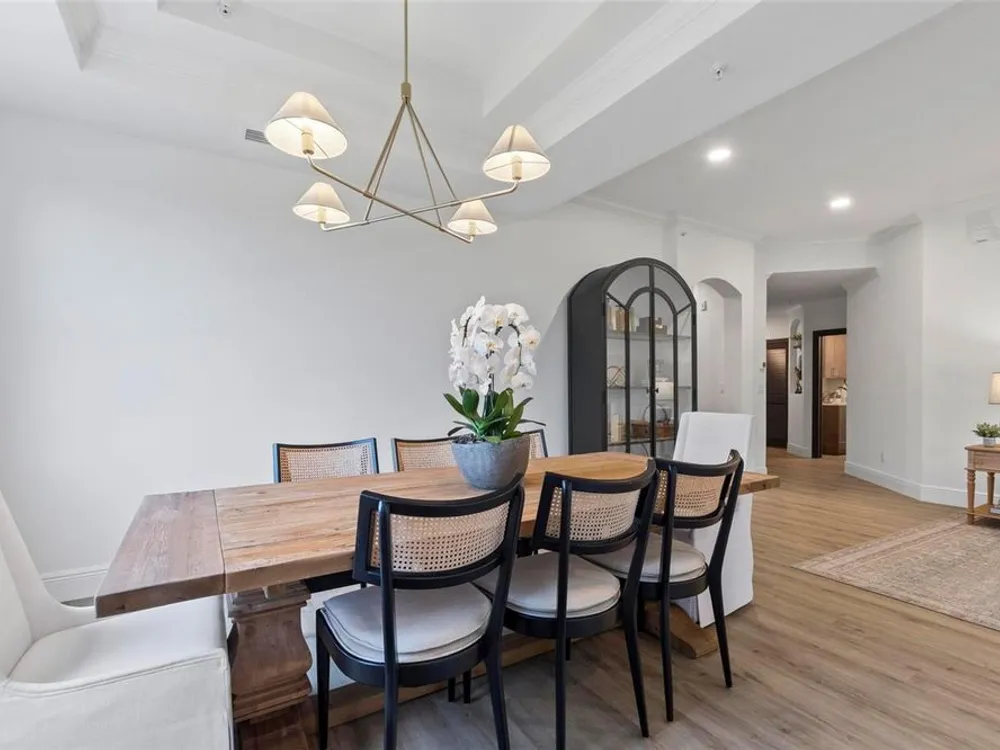 - Built-in Features, Ceiling Fan(s), Crown Molding, Eat-in Kitchen, High Ceilings, Open Floorplan, Main Level Primary, Solid Surface Counters, Solid-Wood Cabinets, Split Bedrooms, Thermostat, Walk-In Closet(s)