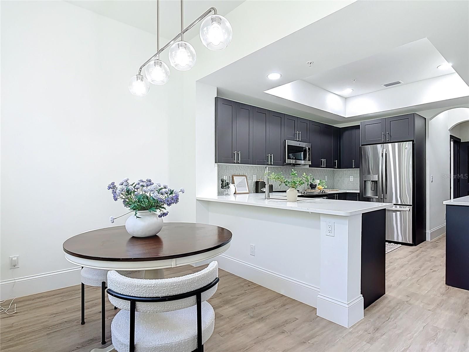 - Ceiling Fan(s), Crown Molding, Eat-in Kitchen, High Ceilings, Living/Dining Room, Open Floorplan, Main Level Primary, Solid Surface Counters, Solid-Wood Cabinets, Split Bedrooms, Thermostat, Tray Ceiling(s)