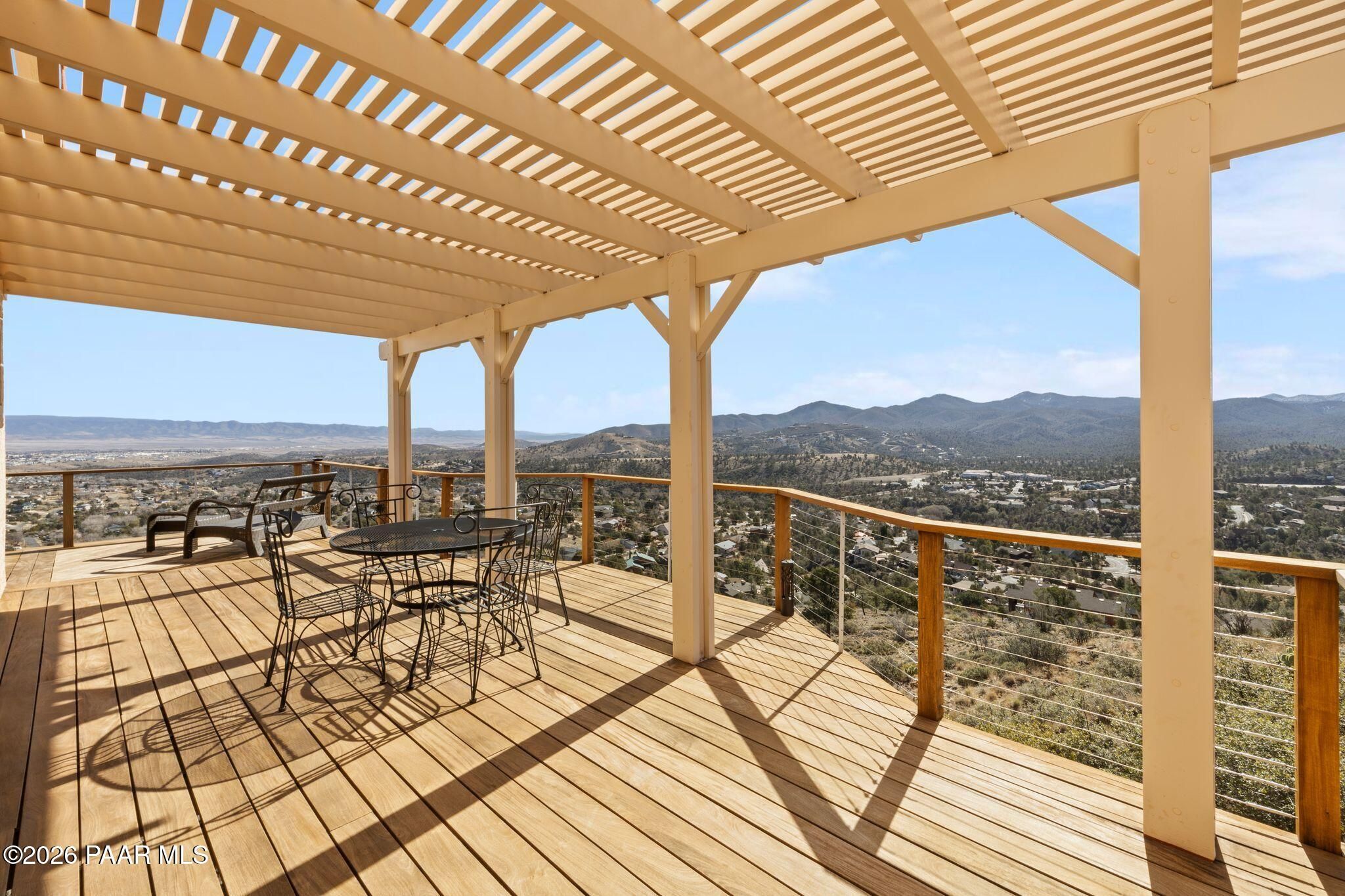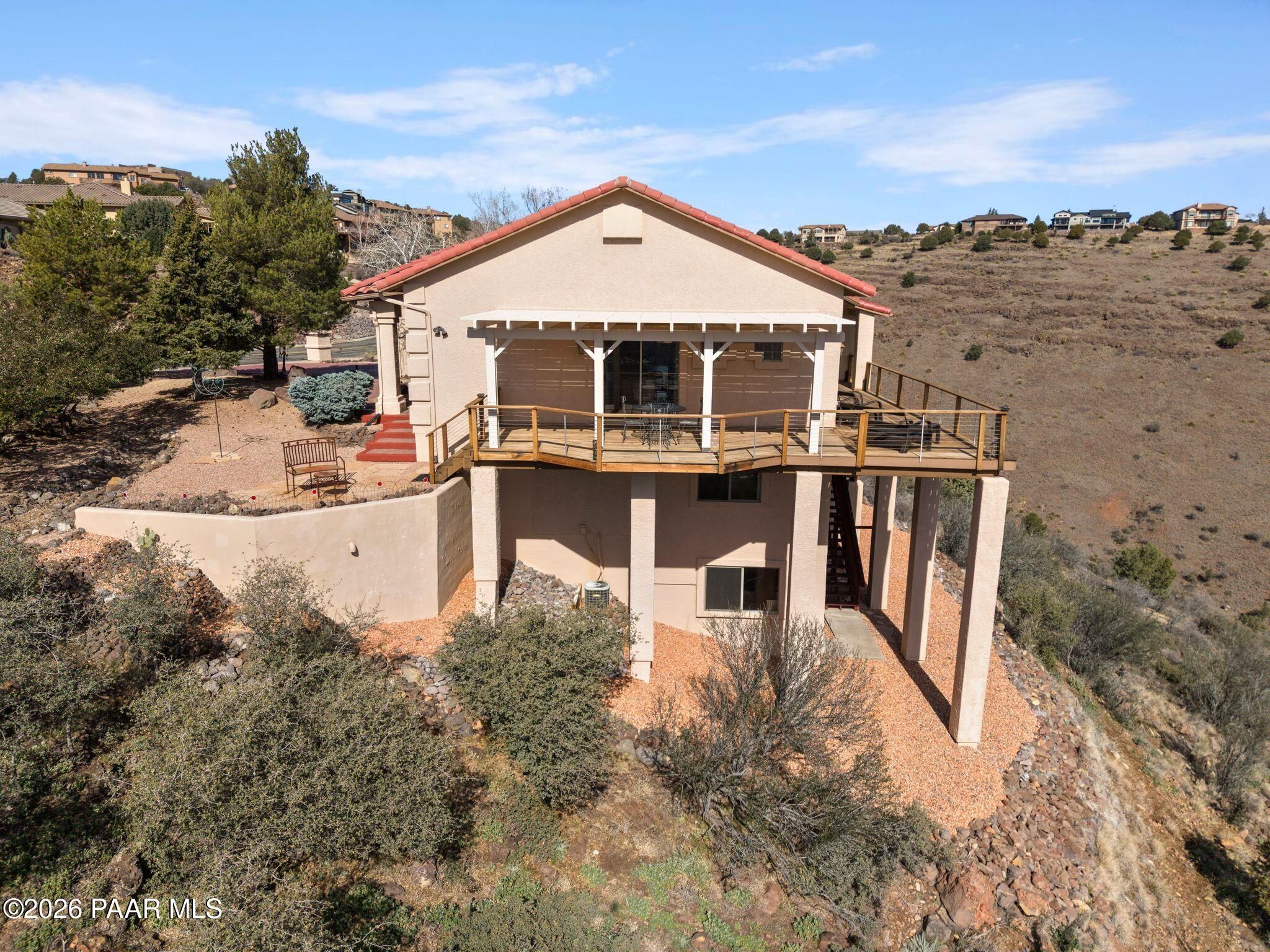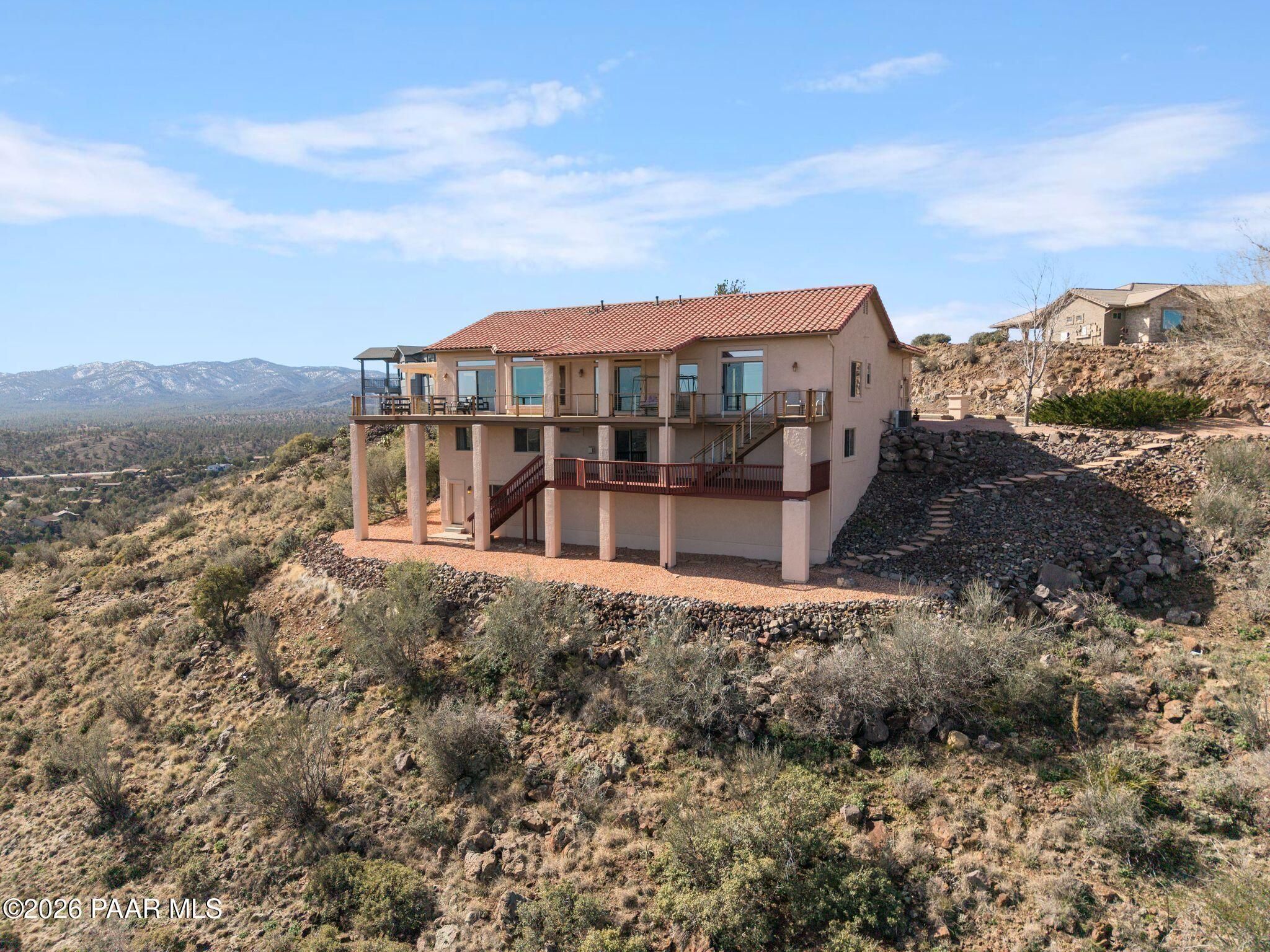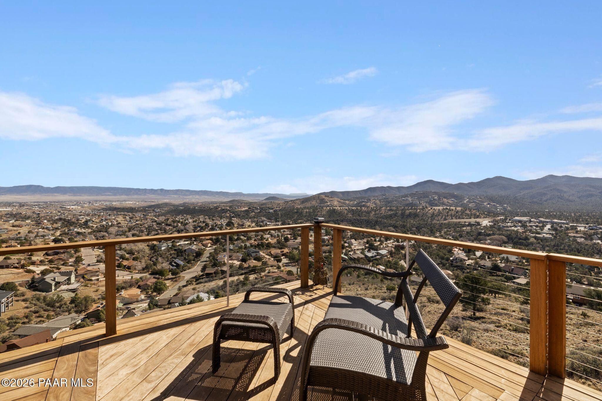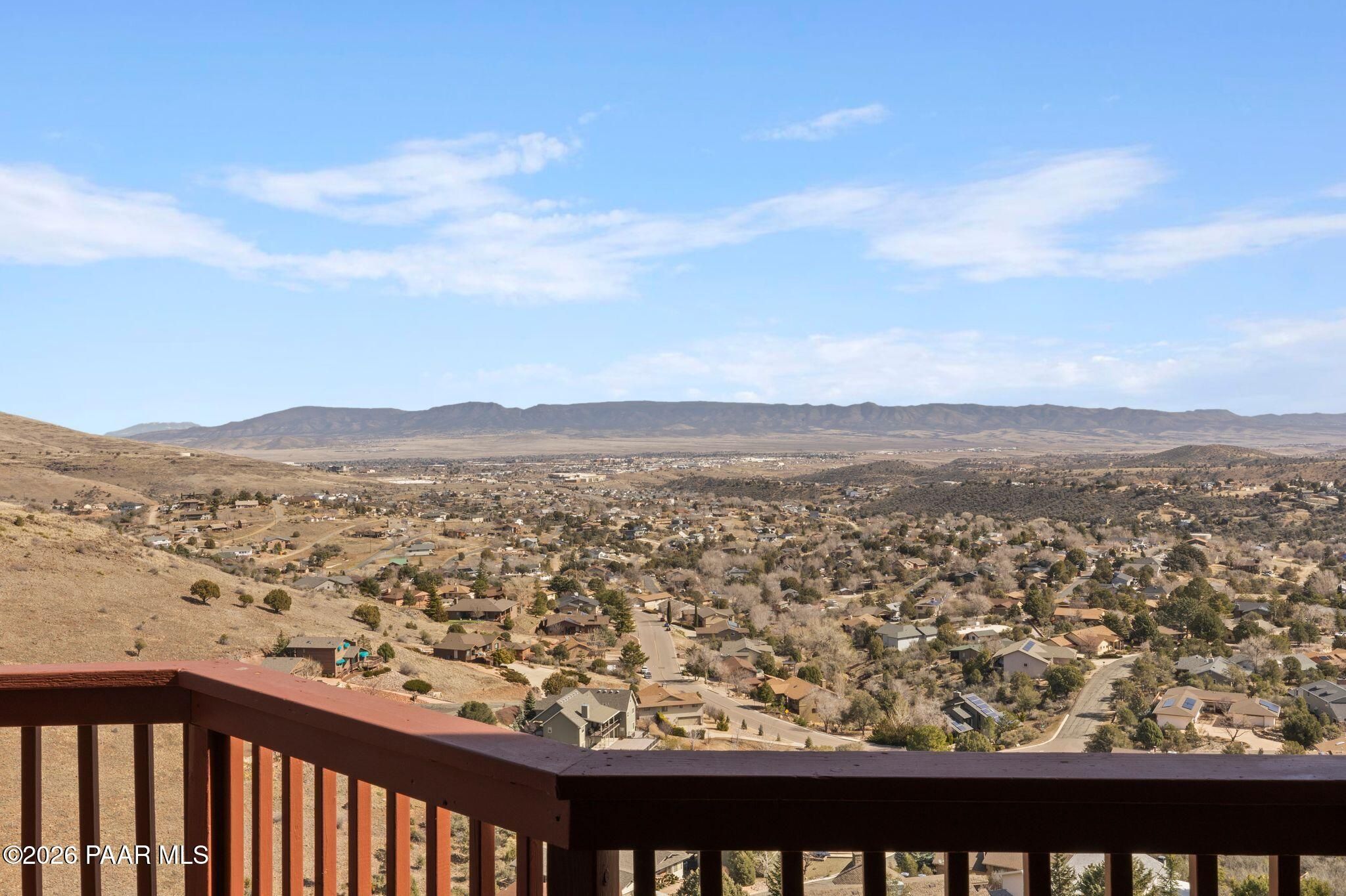 VIEWS, VIEWS, VIEWS! Perched on a private hillside in highly desirable Yavapai Hills, this exceptional Prescott home captures breathtaking panoramic views you'll never tire of. From glowing sunrises to dramatic monsoon storm watching, the ever-changing skies become your daily masterpiece. Enjoy abundant wildlife, deer wandering through the common area and hawks and song birds soaring at eye level. A rare flat driveway provides easy access to the garage, a true bonus for hillside living. The oversized lot offers privacy with a common area on two sides, plus a nearby trailhead for morning walks and sunset hikes. Outdoor living shines with an expansive 1,000 sq. ft. wraparound IPE deck (75+yrs), designed with multiple seating areas to take in the views from every angle. A lower private deck is already reinforced for a future spa, perfect for relaxing under the stars. Inside, the light-filled open floor plan offers a comfortable single-level living option. Updated flooring, a skylight, and a bright, functional kitchen with Corian countertops create a warm, airy feel. The lower level features add'l bedrooms, a spacious family room with fireplace, bonus flex space, and abundant storage -- ideal for guests, hobbies, or multigenerational living. Located in a Firewise community with many recent updates throughout, this home blends peace, privacy, and convenience -- just minutes from shopping, dining, and downtown Prescott. If you're looking for views, lifestyle, and that perfect Prescott setting, this is it.