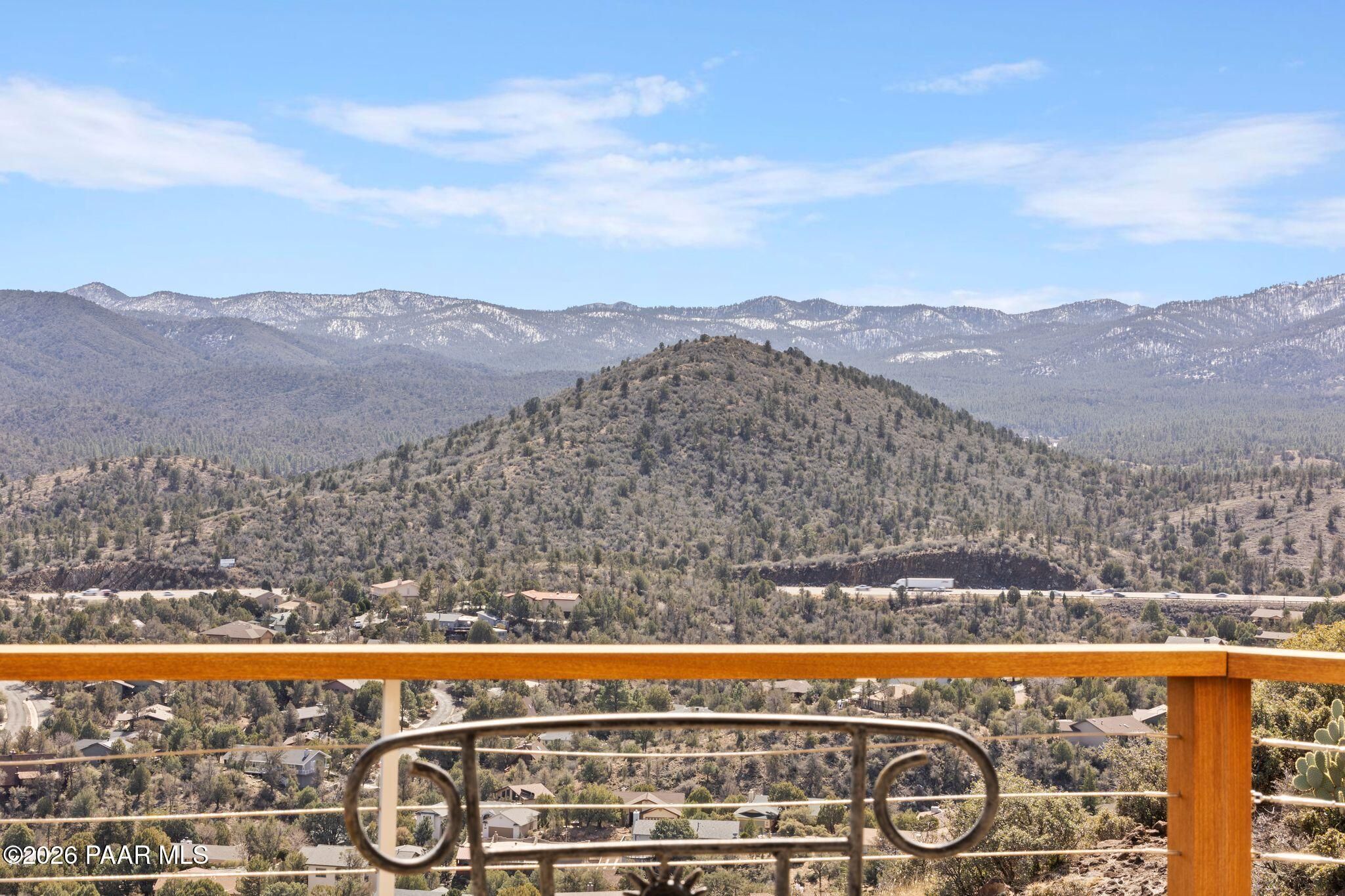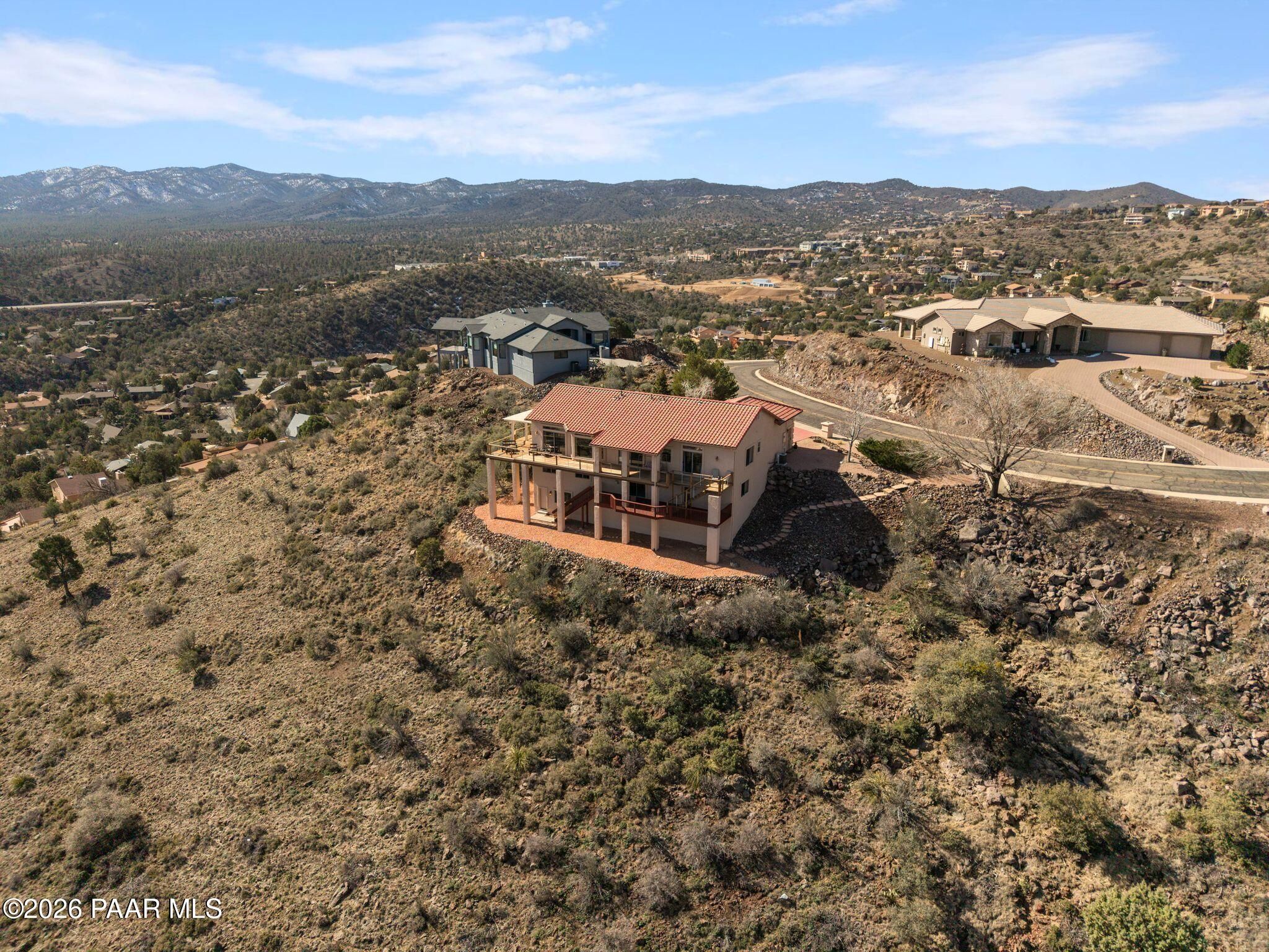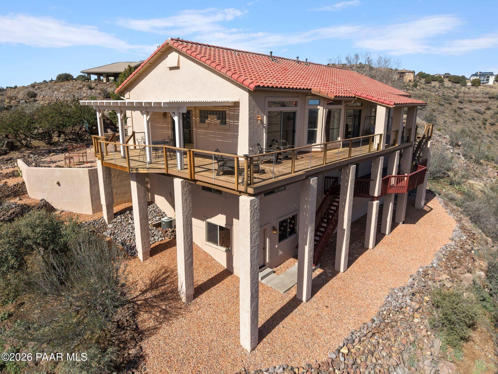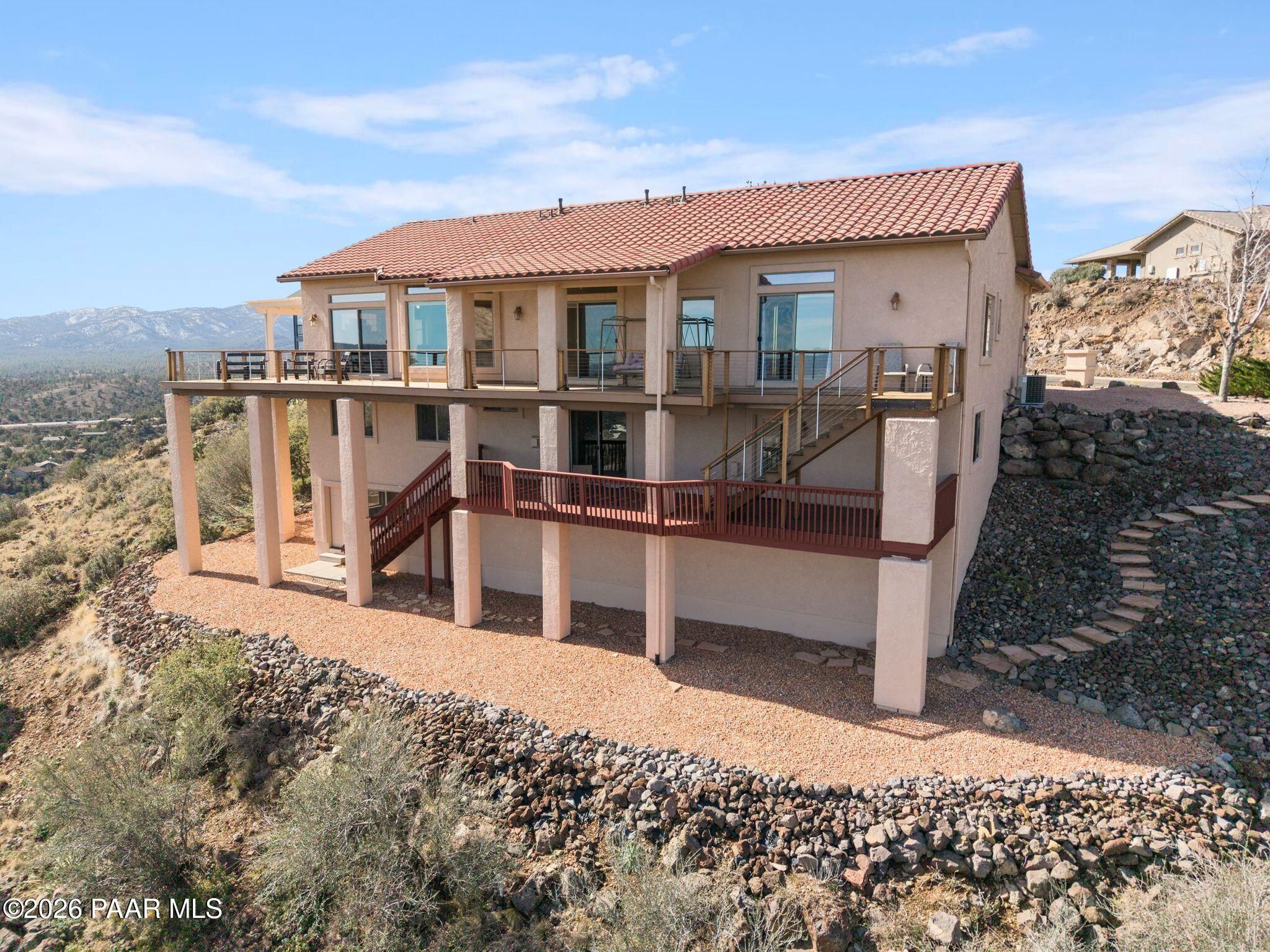VIEWS, VIEWS, VIEWS! Perched on a private hillside in highly desirable Yavapai Hills, this exceptional Prescott home captures breathtaking panoramic views you'll never tire of. From glowing sunrises to dramatic monsoon storm watching, the ever-changing skies become your daily masterpiece. Enjoy abundant wildlife, deer wandering through the common area and hawks and song birds soaring at eye level. A rare flat driveway provides easy access to the garage, a true bonus for hillside living. The oversized lot offers privacy with a common area on two sides, plus a nearby trailhead for morning walks and sunset hikes. Outdoor living shines with an expansive 1,000 sq. ft. wraparound IPE deck (75+yrs), designed with multiple seating areas to take in the views from every angle. A lower private deck is already reinforced for a future spa, perfect for relaxing under the stars. Inside, the light-filled open floor plan offers a comfortable single-level living option. Updated flooring, a skylight, and a bright, functional kitchen with Corian countertops create a warm, airy feel. The lower level features add'l bedrooms, a spacious family room with fireplace, bonus flex space, and abundant storage -- ideal for guests, hobbies, or multigenerational living. Located in a Firewise community with many recent updates throughout, this home blends peace, privacy, and convenience -- just minutes from shopping, dining, and downtown Prescott. If you're looking for views, lifestyle, and that perfect Prescott setting, this is it.