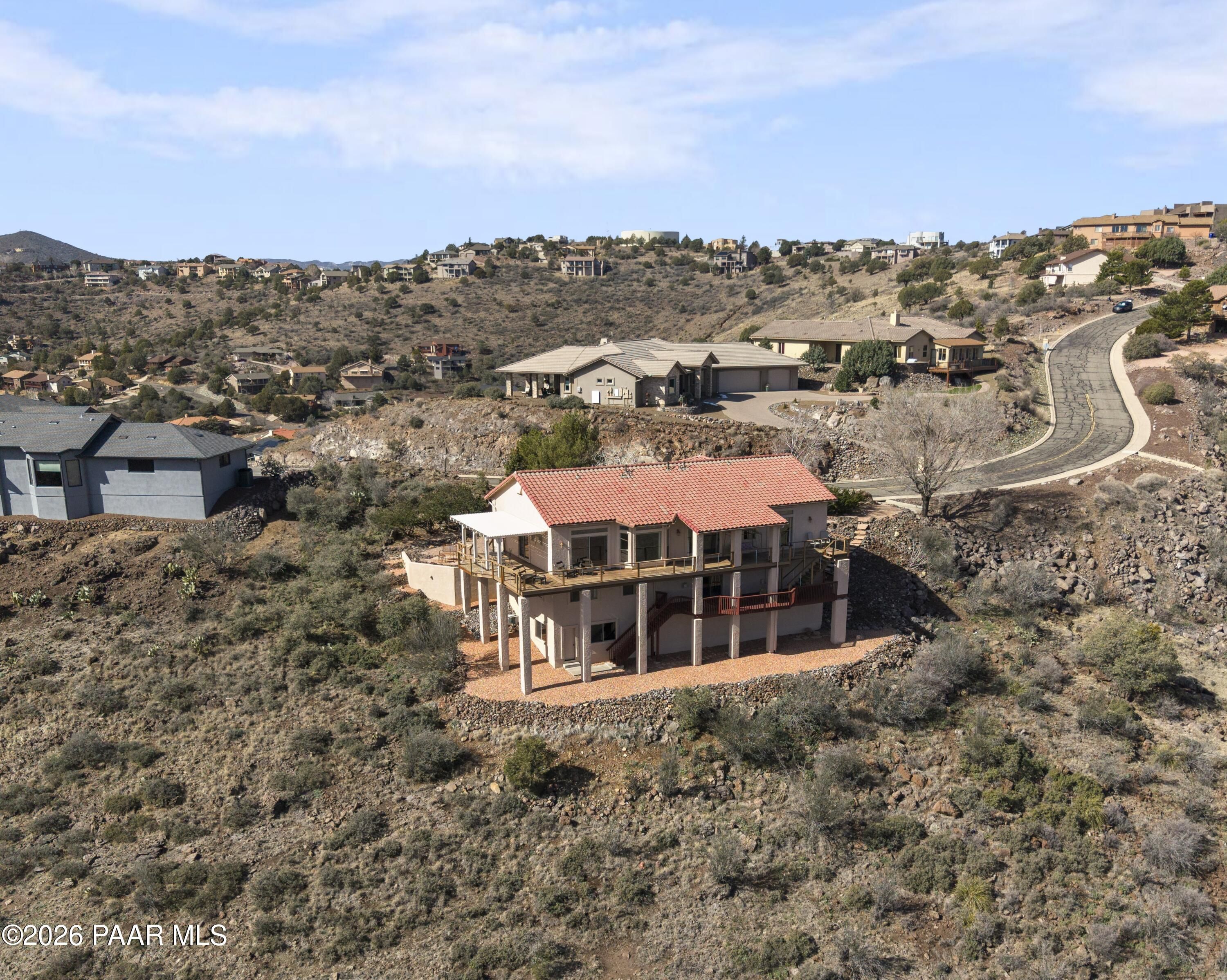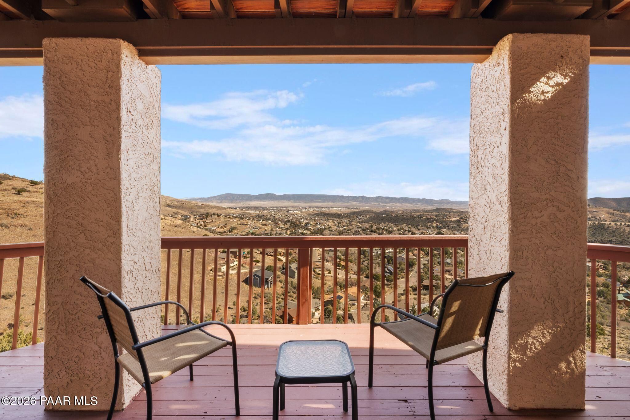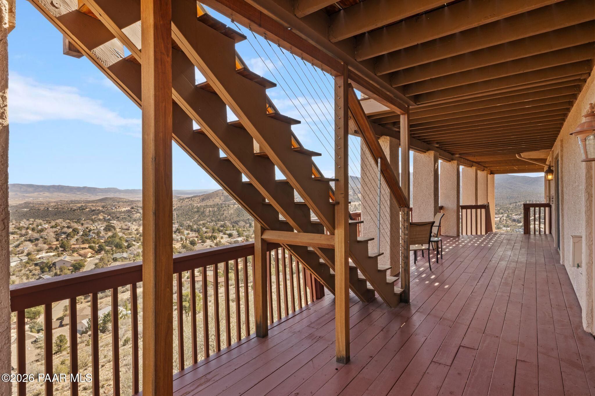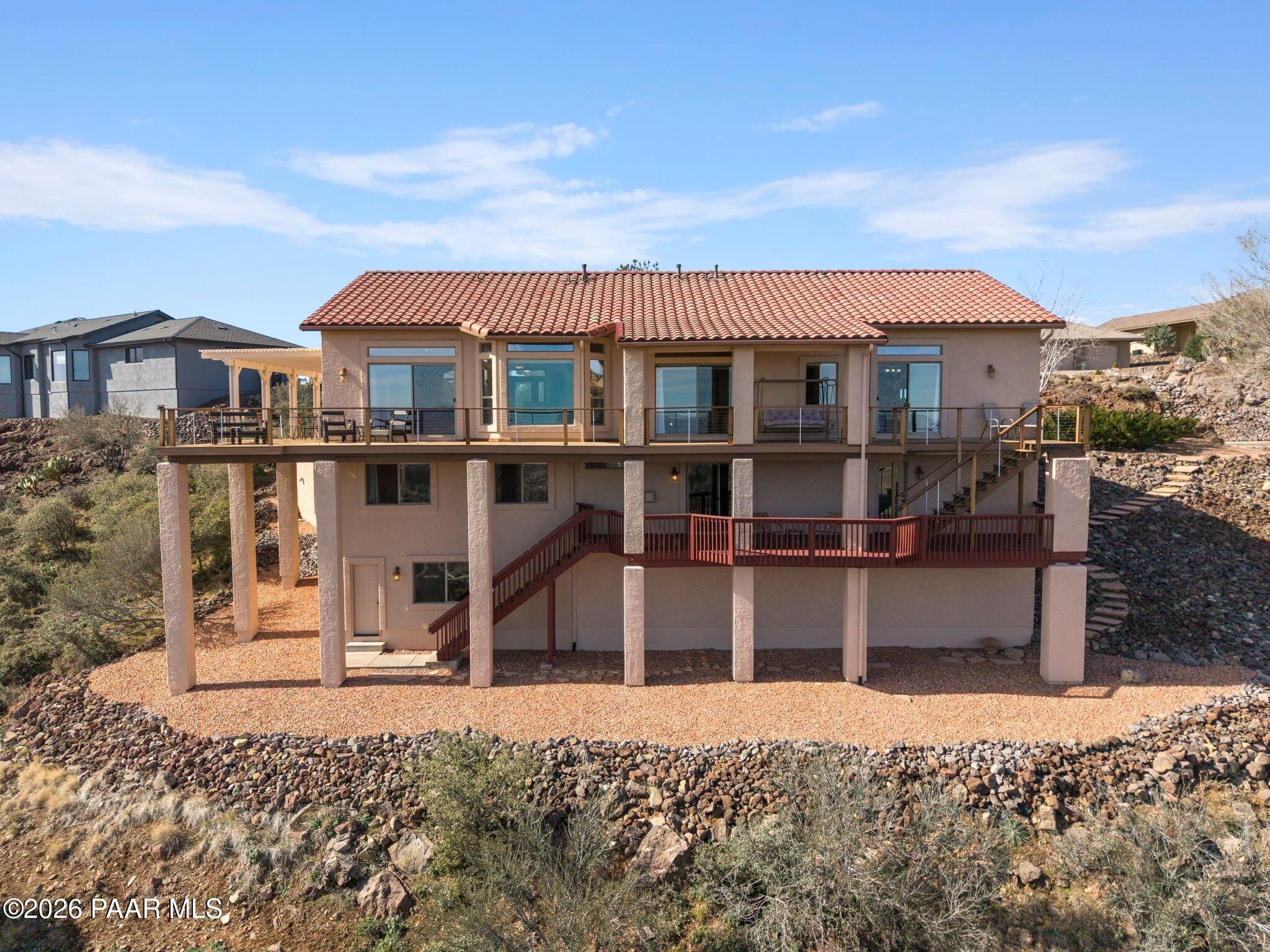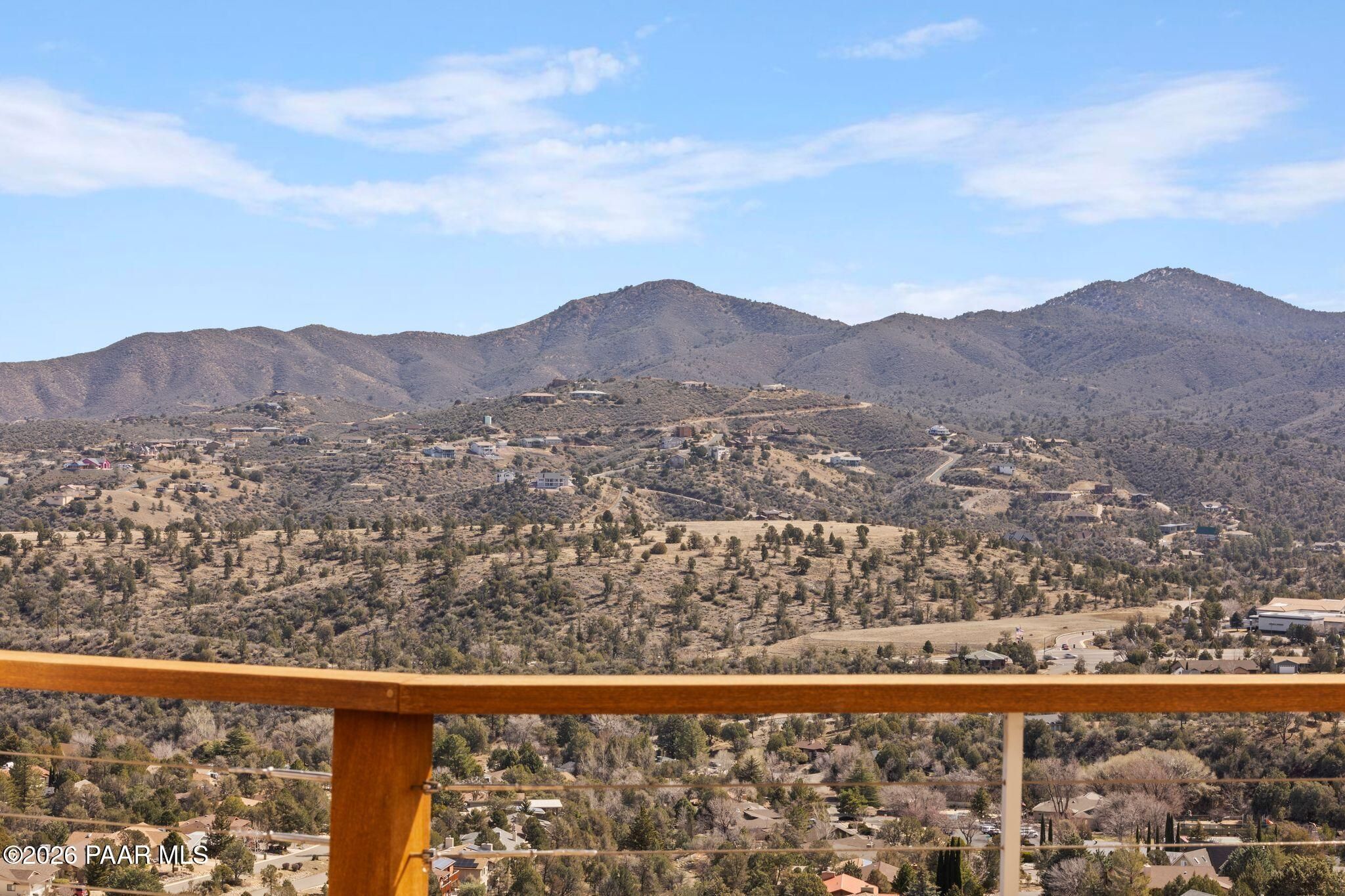 VIEWS, VIEWS, VIEWS! Perched on a private hillside in highly desirable Yavapai Hills, this exceptional Prescott home captures breathtaking panoramic views you'll never tire of. From glowing sunrises to dramatic monsoon storm watching, the ever-changing skies become your daily masterpiece. Enjoy abundant wildlife, deer wandering through the common area and hawks and song birds soaring at eye level. A rare flat driveway provides easy access to the garage, a true bonus for hillside living. The oversized lot offers privacy with a common area on two sides, plus a nearby trailhead for morning walks and sunset hikes. Outdoor living shines with an expansive 1,000 sq. ft. wraparound IPE deck (75+yrs), designed with multiple seating areas to take in the views from every angle. A lower private deck is already reinforced for a future spa, perfect for relaxing under the stars. Inside, the light-filled open floor plan offers a comfortable single-level living option. Updated flooring, a skylight, and a bright, functional kitchen with Corian countertops create a warm, airy feel. The lower level features add'l bedrooms, a spacious family room with fireplace, bonus flex space, and abundant storage -- ideal for guests, hobbies, or multigenerational living. Located in a Firewise community with many recent updates throughout, this home blends peace, privacy, and convenience -- just minutes from shopping, dining, and downtown Prescott. If you're looking for views, lifestyle, and that perfect Prescott setting, this is it.
