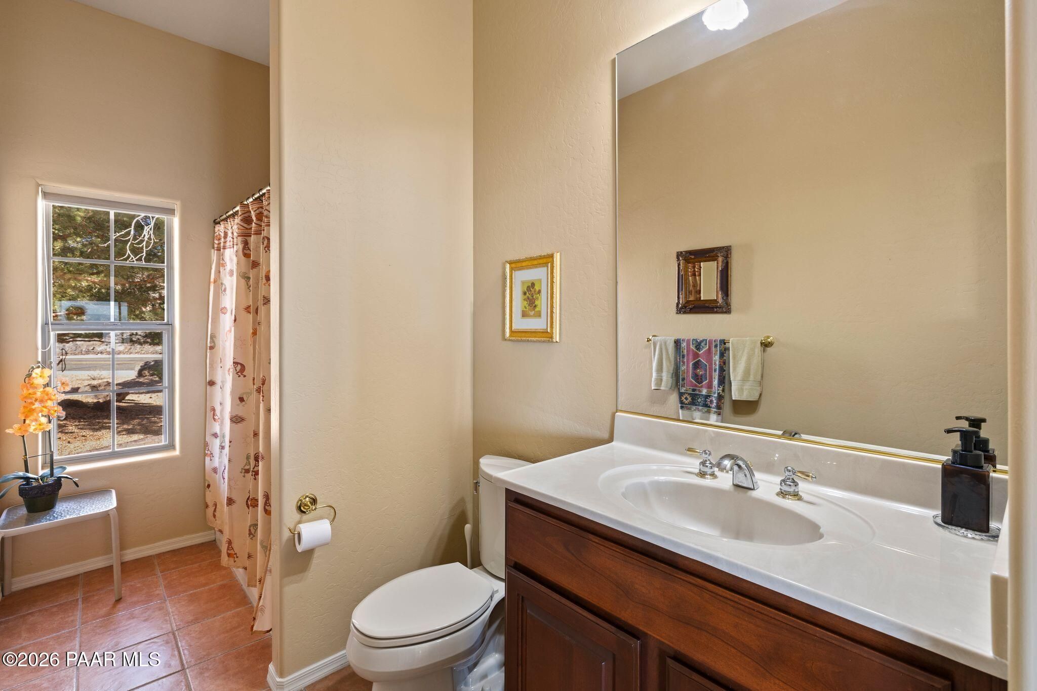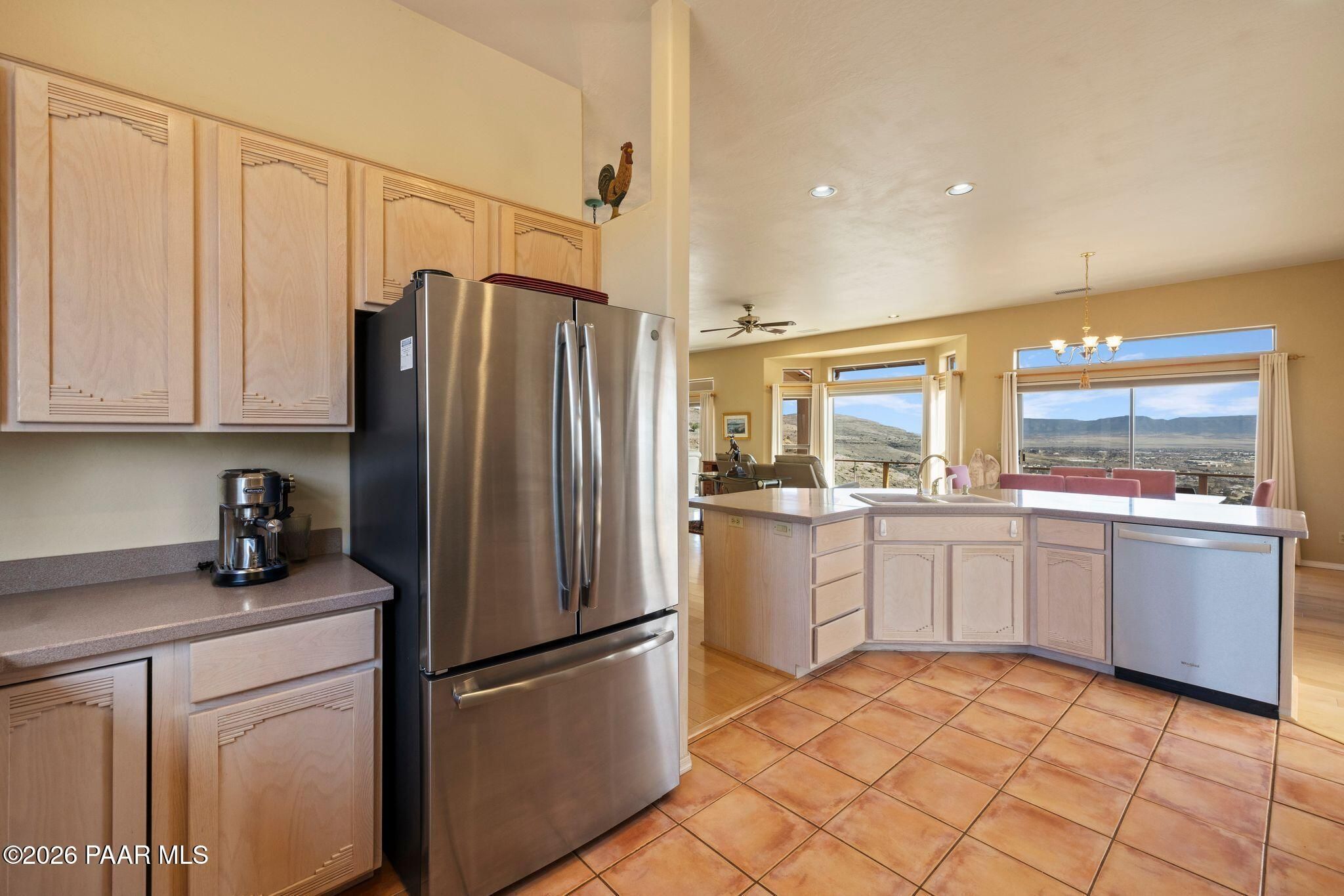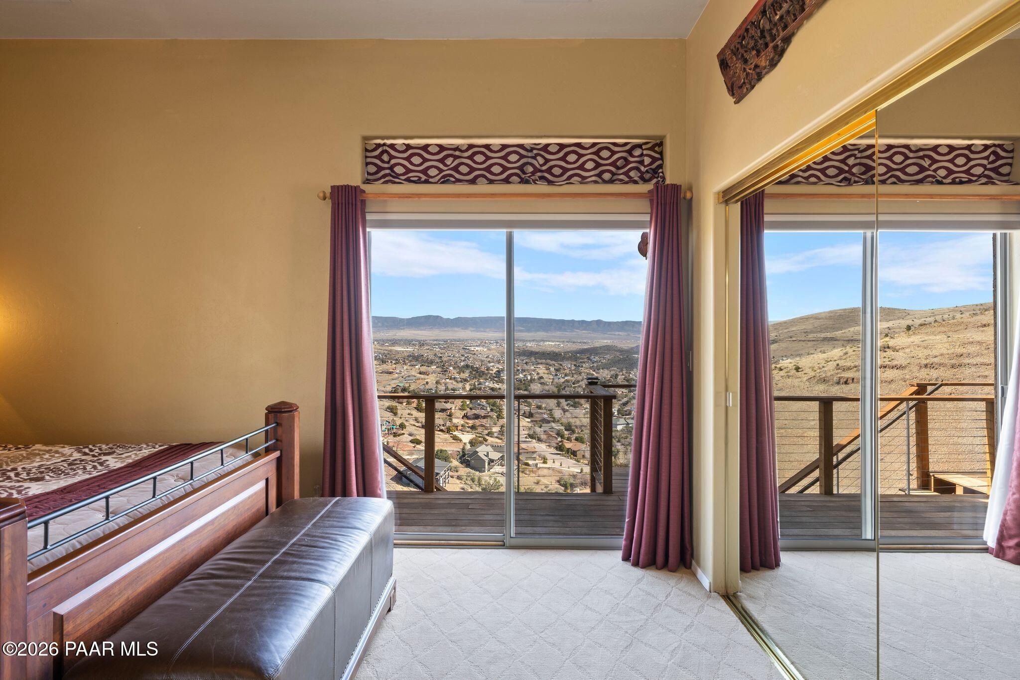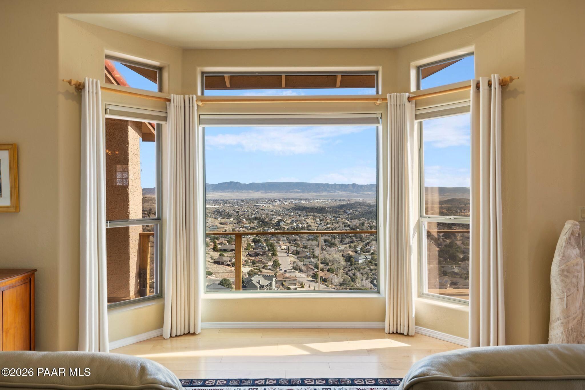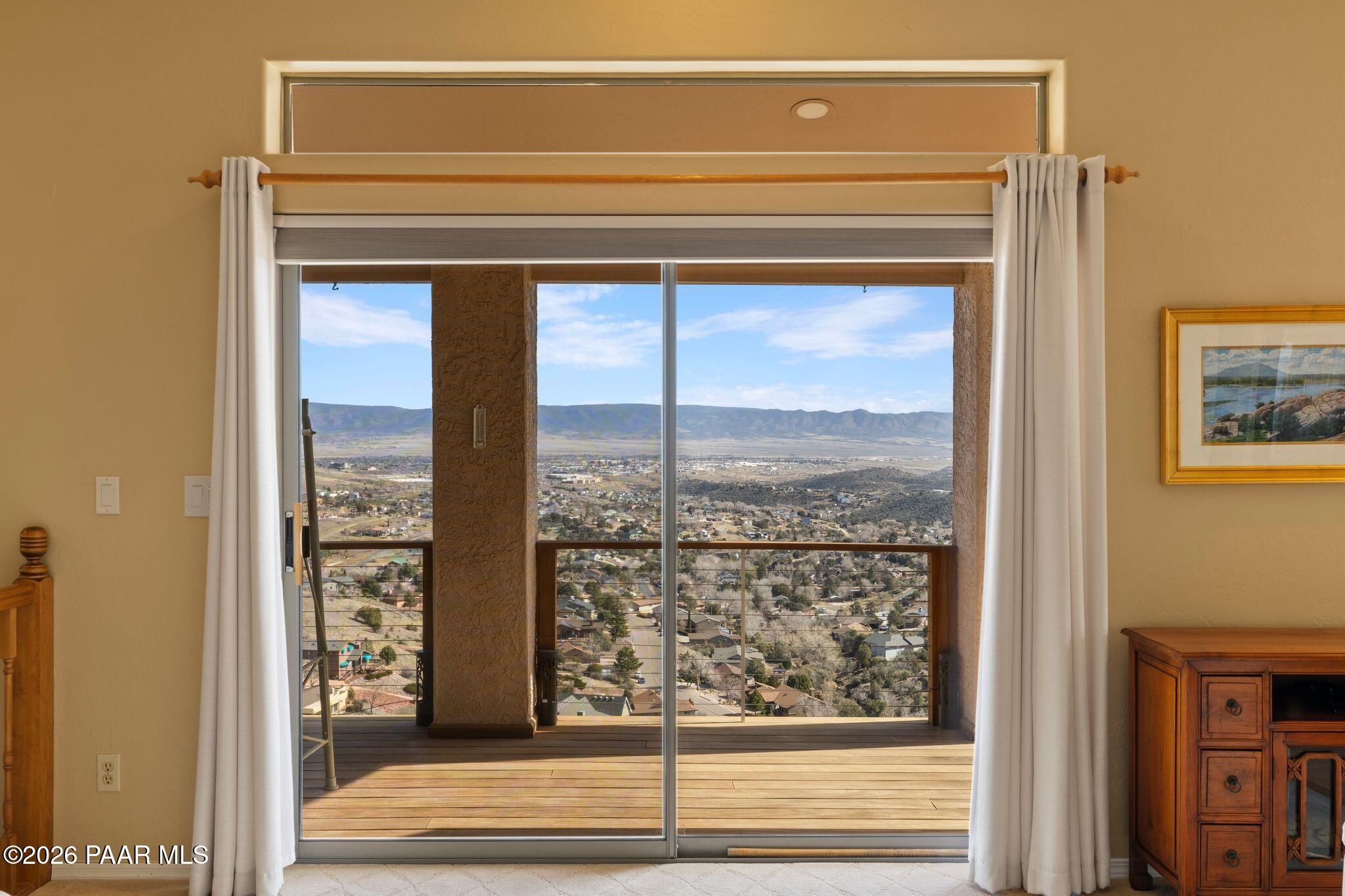 VIEWS, VIEWS, VIEWS! Perched on a private hillside in highly desirable Yavapai Hills, this exceptional Prescott home captures breathtaking panoramic views you'll never tire of. From glowing sunrises to dramatic monsoon storm watching, the ever-changing skies become your daily masterpiece. Enjoy abundant wildlife, deer wandering through the common area and hawks and song birds soaring at eye level. A rare flat driveway provides easy access to the garage, a true bonus for hillside living. The oversized lot offers privacy with a common area on two sides, plus a nearby trailhead for morning walks and sunset hikes. Outdoor living shines with an expansive 1,000 sq. ft. wraparound IPE deck (75+yrs), designed with multiple seating areas to take in the views from every angle. A lower private deck is already reinforced for a future spa, perfect for relaxing under the stars. Inside, the light-filled open floor plan offers a comfortable single-level living option. Updated flooring, a skylight, and a bright, functional kitchen with Corian countertops create a warm, airy feel. The lower level features add'l bedrooms, a spacious family room with fireplace, bonus flex space, and abundant storage -- ideal for guests, hobbies, or multigenerational living. Located in a Firewise community with many recent updates throughout, this home blends peace, privacy, and convenience -- just minutes from shopping, dining, and downtown Prescott. If you're looking for views, lifestyle, and that perfect Prescott setting, this is it.