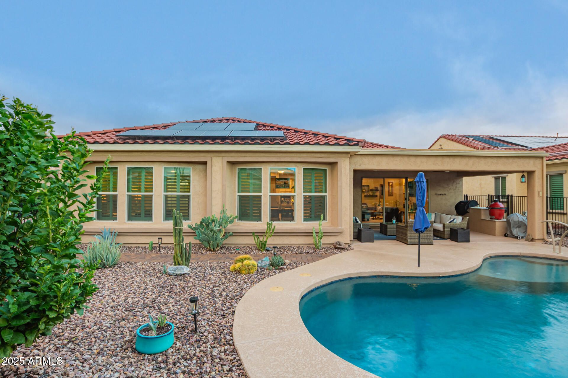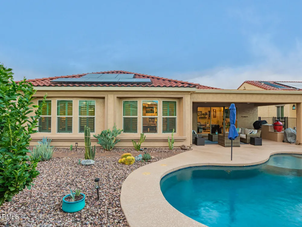 Discover your dream home in this energy-efficient 3-bedroom home situated on a PRIME cul-de-sac! Impressive open floor plan sets the stage for a delightful living experience, showcasing tile flooring, surround sound, media niches, a cozy fireplace, and multi-sliding glass doors, ensuring seamless indoor-outdoor entertaining. Gourmet kitchen offers recessed & pendant lighting, ample cabinetry, a walk-in pantry, tile backsplash, SS appliances, granite counters, and a prep island with a breakfast bar. Venture to the impeccable main retreat, complete with plush carpet, a sitting area, plantation shutters, an ensuite with two vanities, and a walk-in closet. Make the open den an office or reading nook. Serene backyard boasts a covered patio, a refreshing pool, and a spa. Don't miss it!