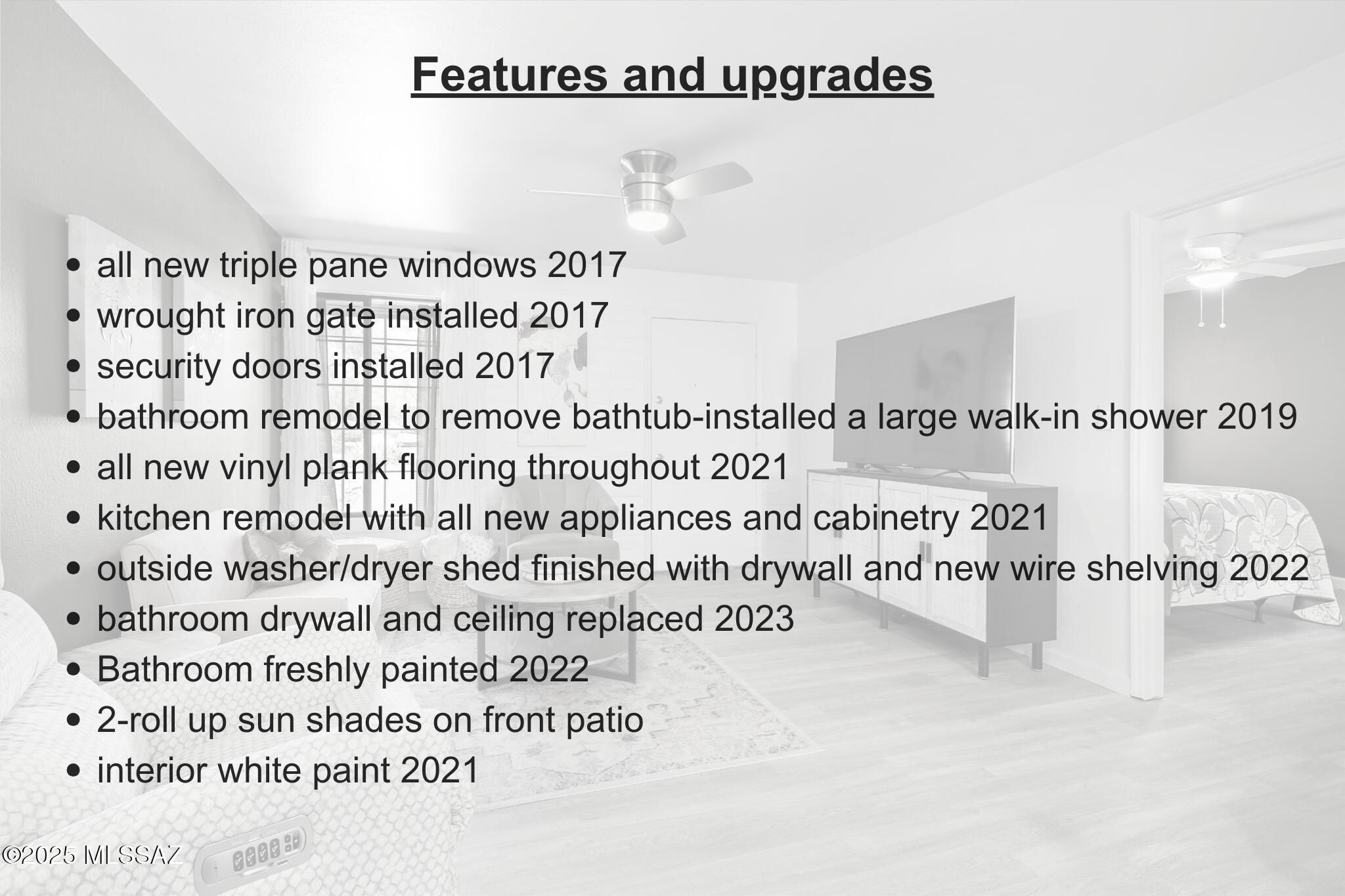 Welcome to this beautifully updated 1 bed, 1 bath condo in the highly sought-after Haven Green Valley Villas West community. This move-in-ready home perfectly combines comfort, convenience, and modern style. Inside, enjoy a fully remodeled kitchen with white appliances, quartz countertops, soft-close drawers, and brand new cabinetry offering generous storage. The bathroom has been tastefully redesigned, replacing the tub with a spacious walk-in shower. Durable vinyl plank flooring flows throughout, adding warmth and elegance. All windows have been upgraded to energy-efficient triple pane glass, and new wrought iron security doors and front gate enhance both safety and curb appeal. Outside, the laundry shed has been finished with drywall and wire shelving for extra storage. A MUST SEE!