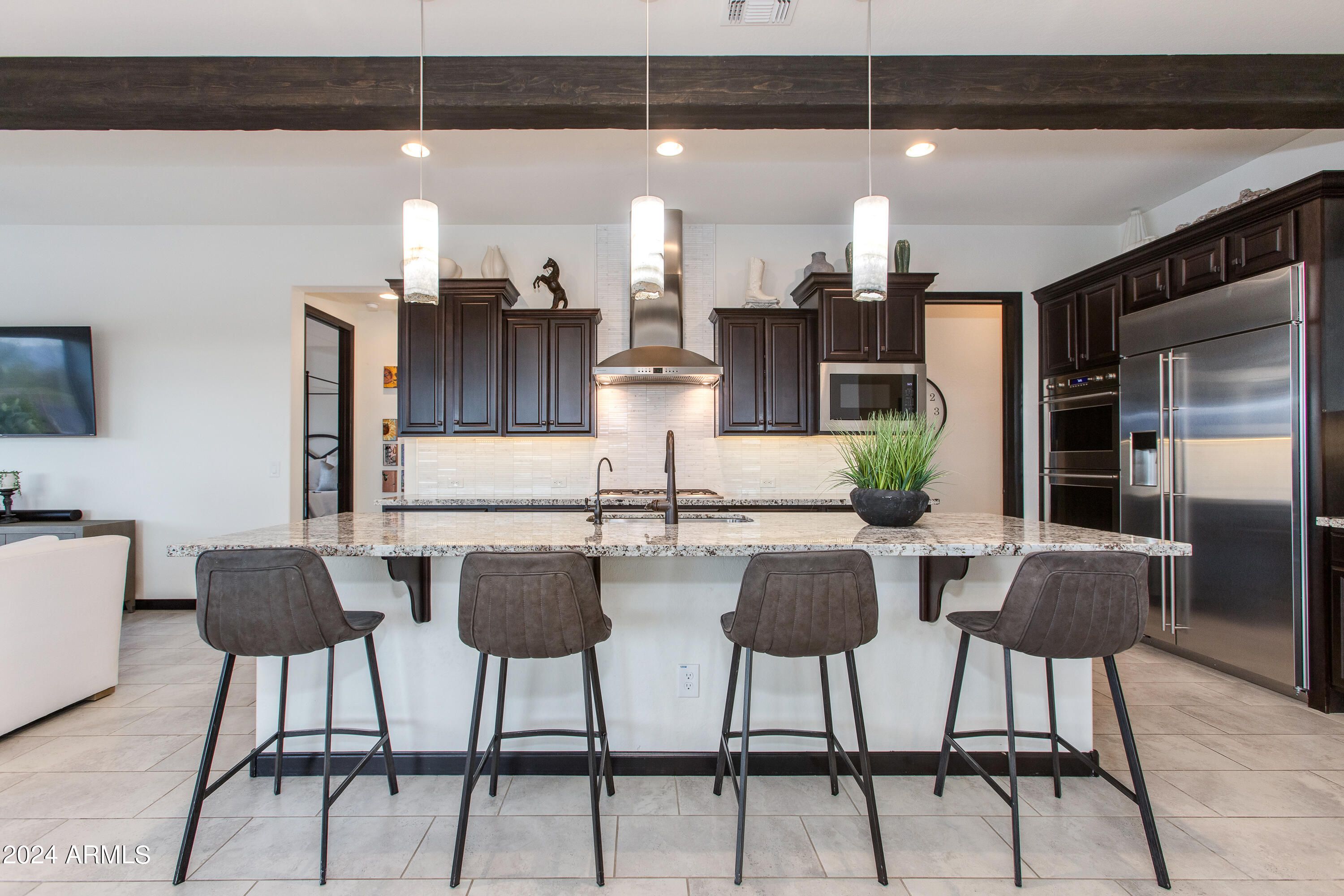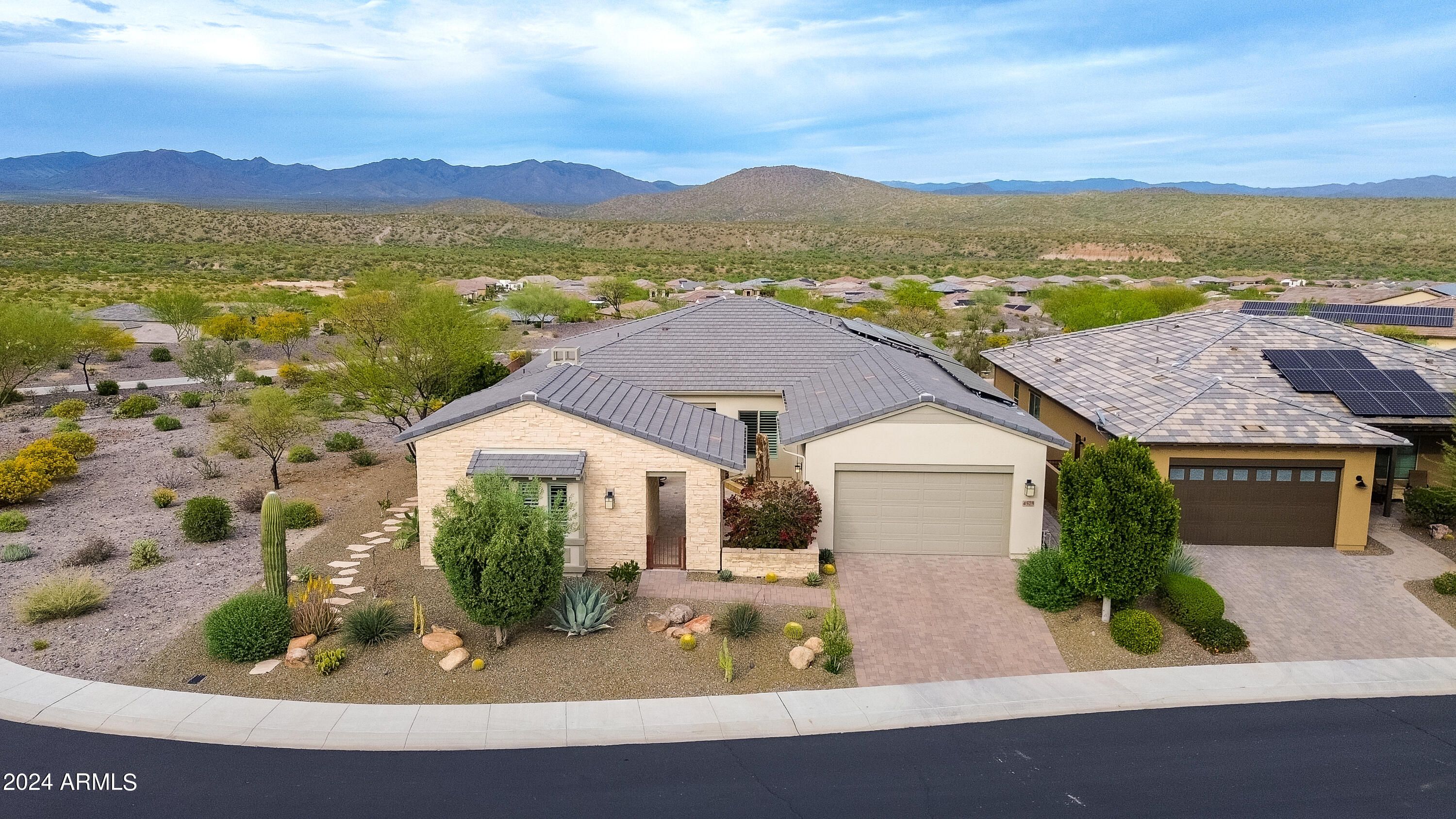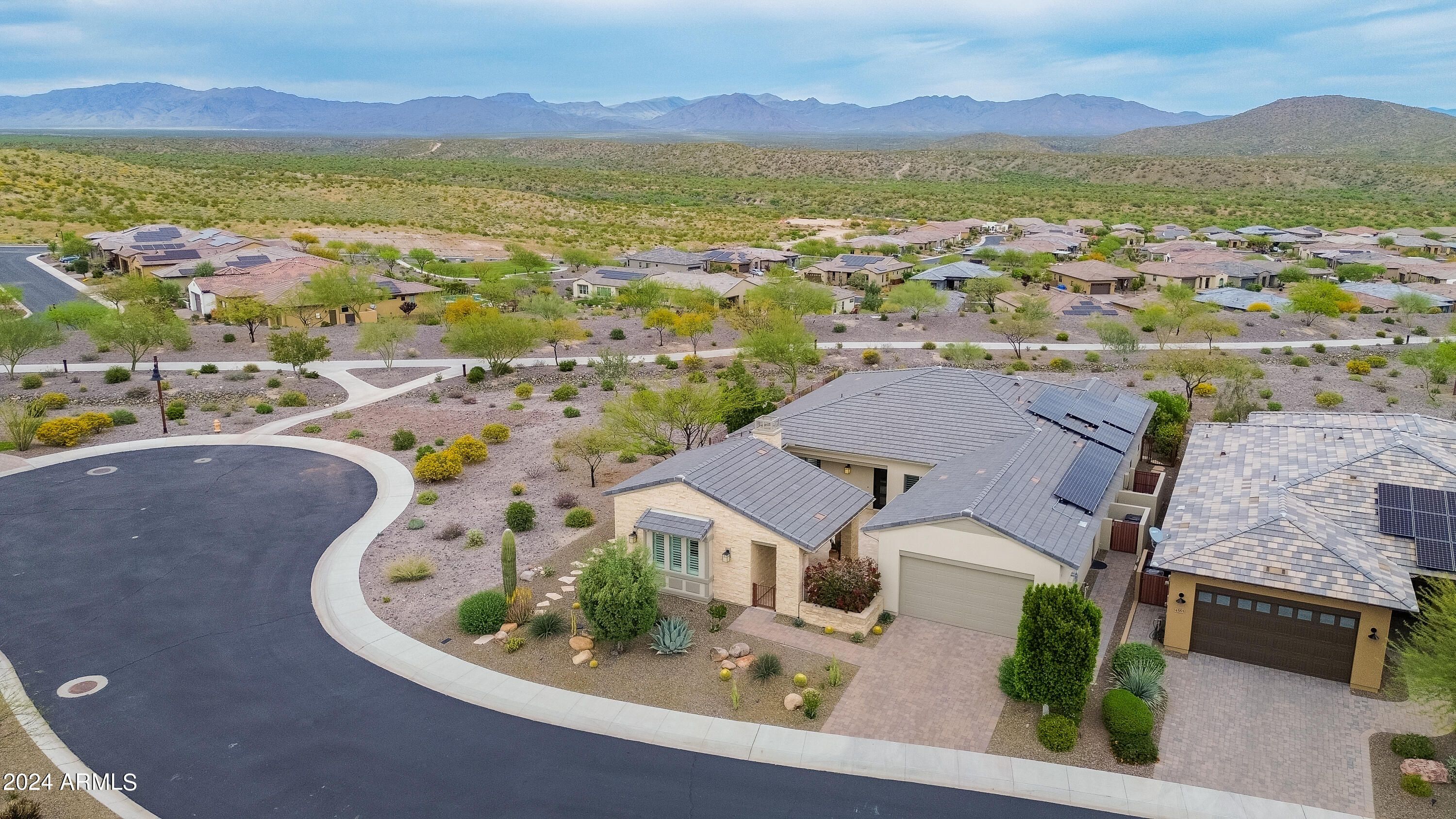 Exceptional Latigo model at Wickenburg Ranch on one of the highest elevation homesites. Private front courtyard w/ pergola, wood-burning fireplace & custom water feature creates a stunning entry to guest casita w/ independent HVAC, mini-fridge, walk-in closet & private bath. Panoramic mountain views & lush desert landscape through corner sliding glass extend living to covered patio w/ travertine, pool & spa--surrounded by HOA-maintained open space for privacy. Guest suite w/ ensuite & direct outdoor access. Primary w/ dual walk-in closets, freestanding tub, glass shower & split vanities. Den w/ built-in bar adds flexible entertaining space. Gourmet kitchen w/ GE Monogram appliances, custom cabinetry & large island. 3-car tandem garage w/ EV, R/O, central vac & mini spilt.