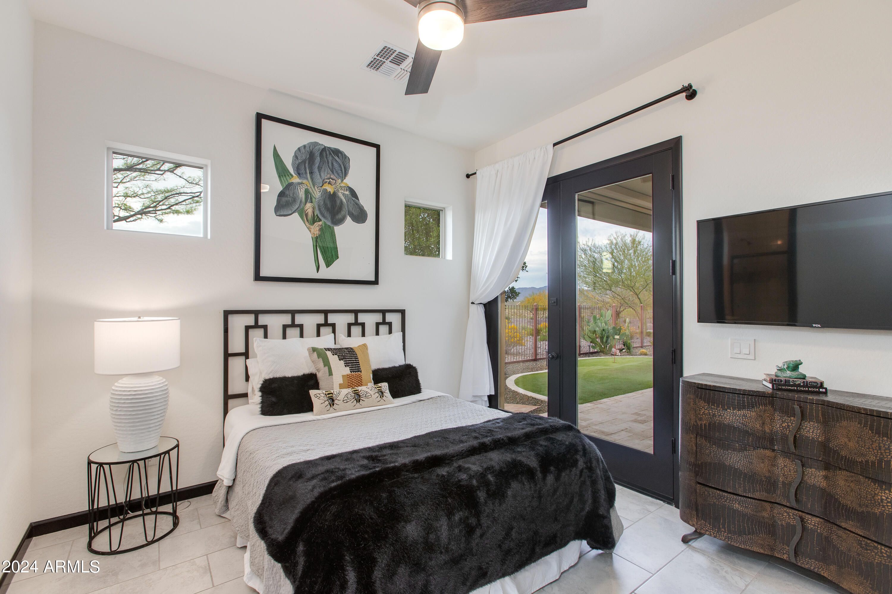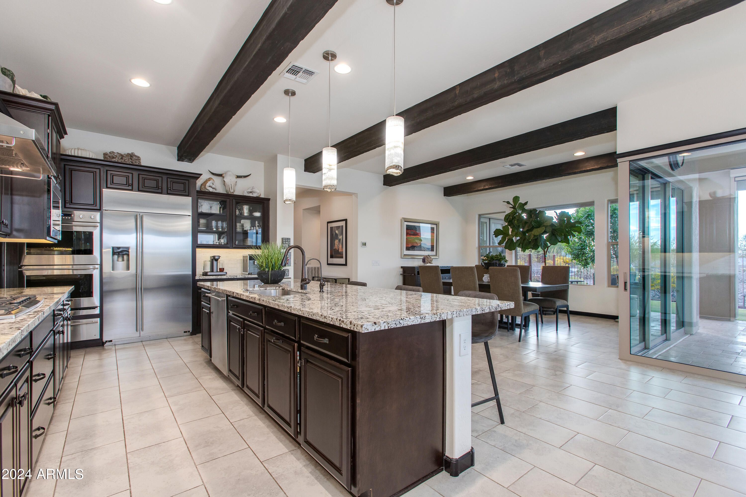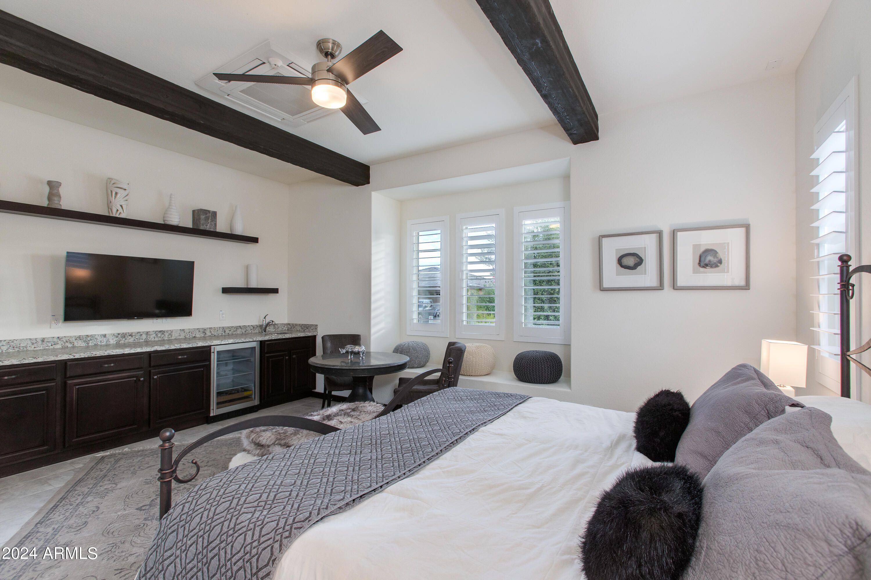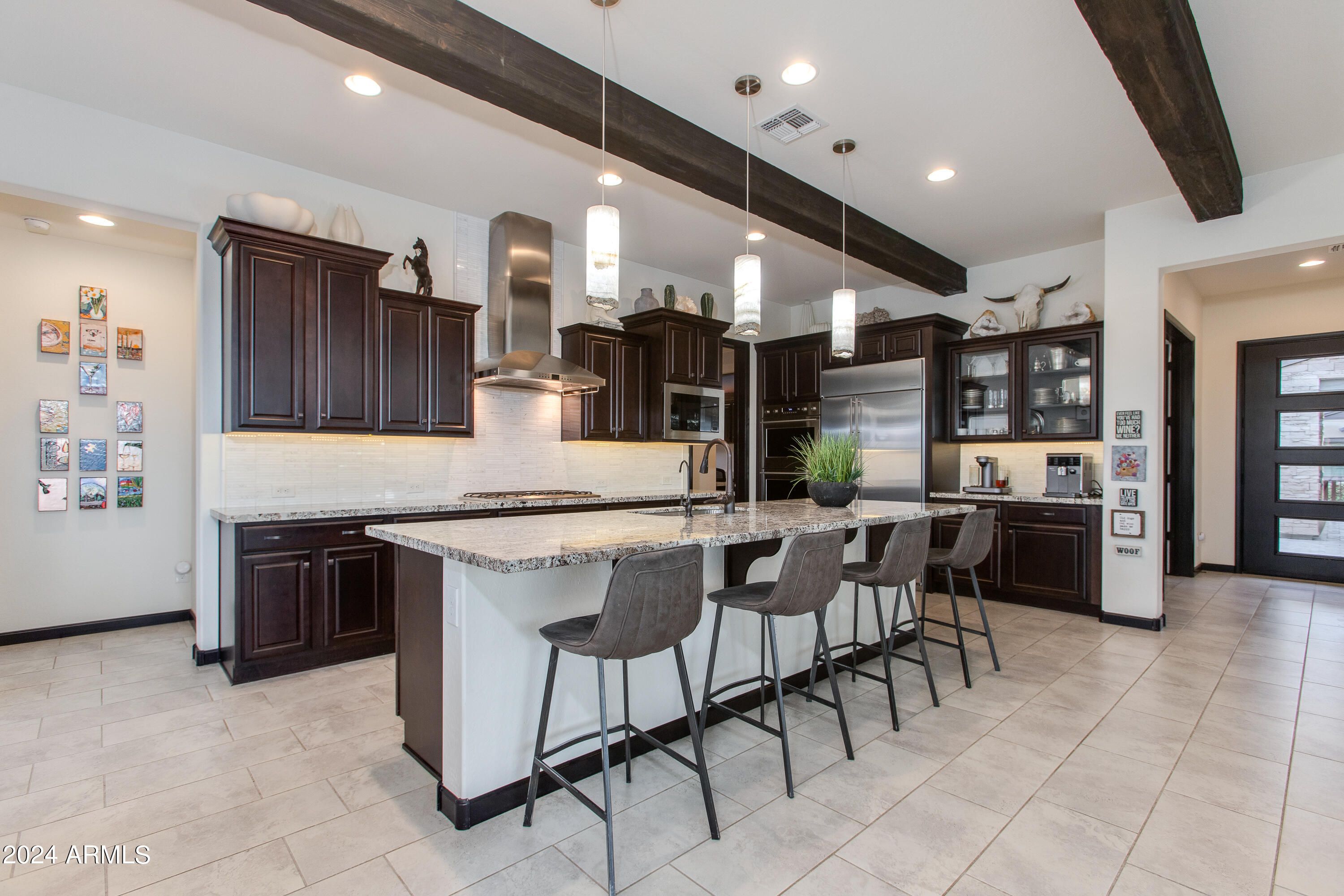 Exceptional Latigo model at Wickenburg Ranch on one of the highest elevation homesites. Private front courtyard w/ pergola, wood-burning fireplace & custom water feature creates a stunning entry to guest casita w/ independent HVAC, mini-fridge, walk-in closet & private bath. Panoramic mountain views & lush desert landscape through corner sliding glass extend living to covered patio w/ travertine, pool & spa--surrounded by HOA-maintained open space for privacy. Guest suite w/ ensuite & direct outdoor access. Primary w/ dual walk-in closets, freestanding tub, glass shower & split vanities. Den w/ built-in bar adds flexible entertaining space. Gourmet kitchen w/ GE Monogram appliances, custom cabinetry & large island. 3-car tandem garage w/ EV, R/O, central vac & mini spilt.