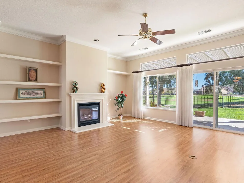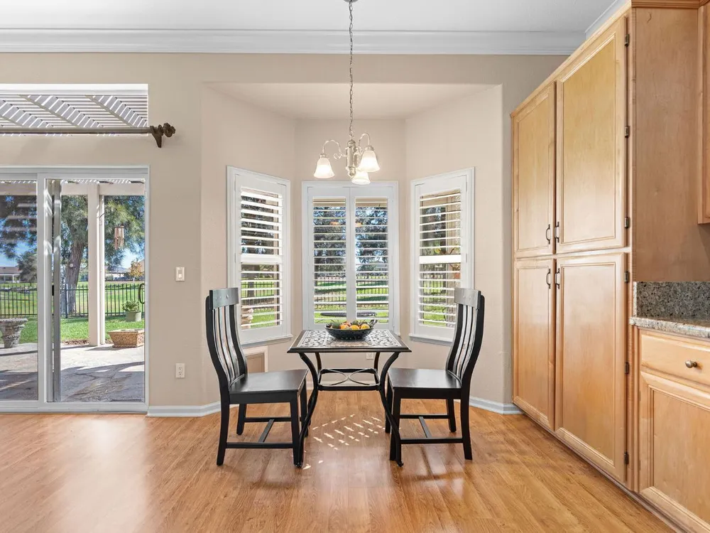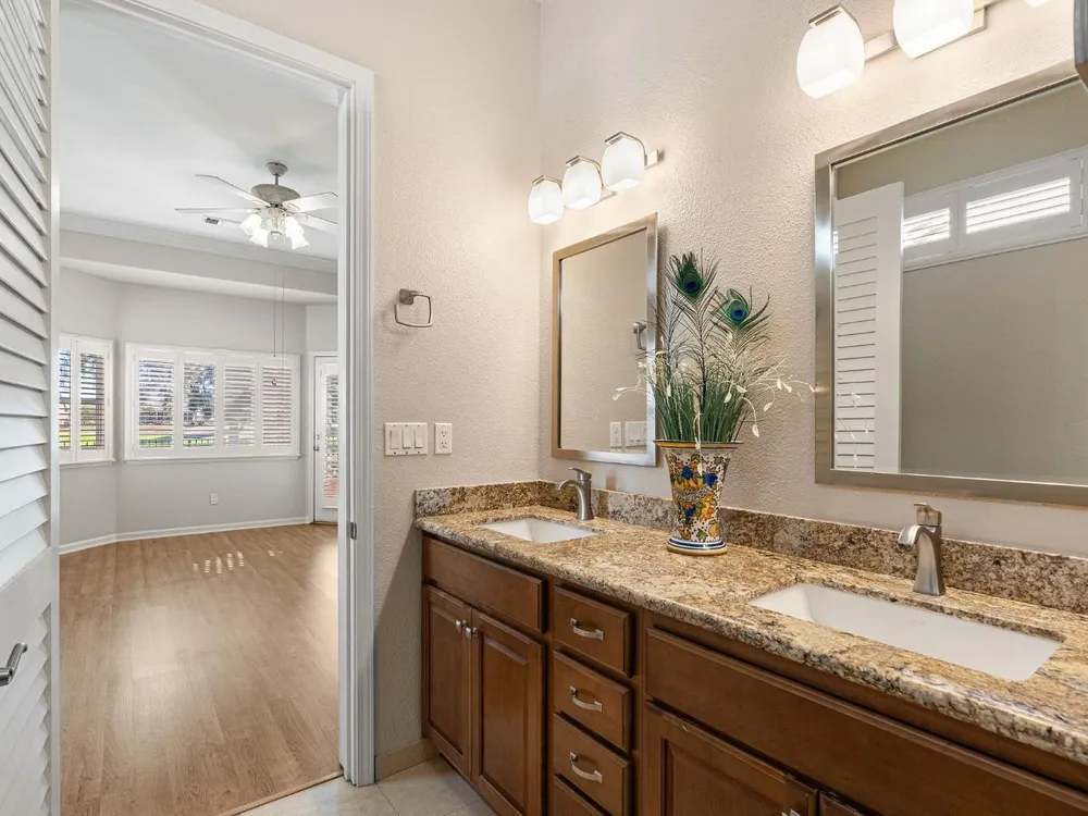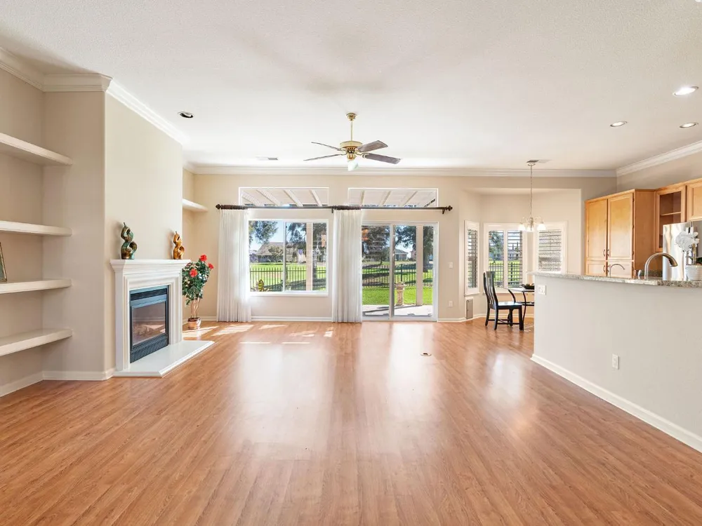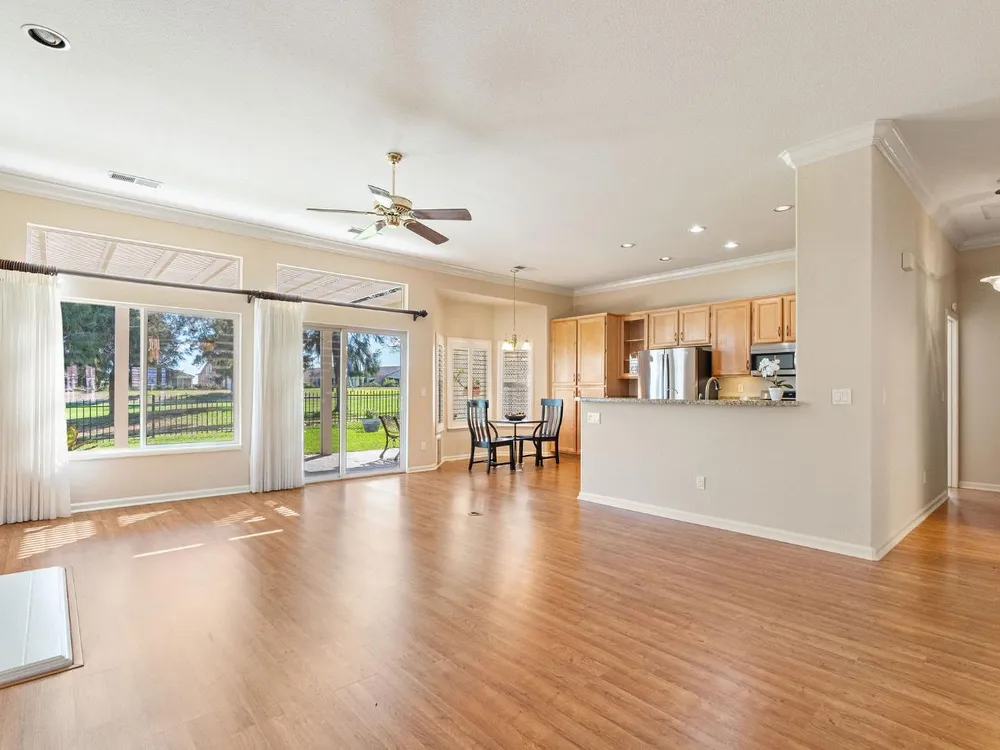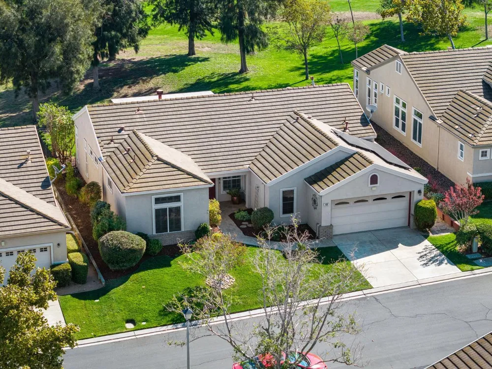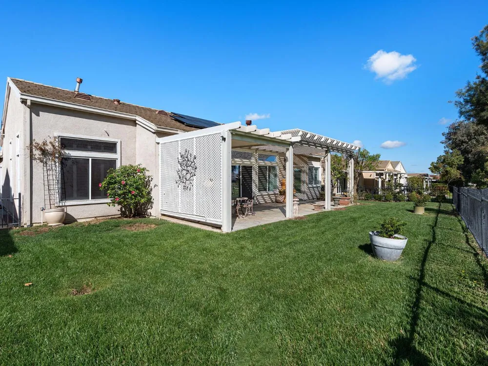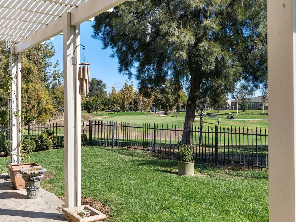 This stunning Catamaran gets your attention immediately as you walk up the flagstone entry to the front door. Enter and your eyes will be drawn to the fantastic views of the golf course. The covered patio is east facing - perfect for enjoying your morning coffee as the sun rises or relaxing in the evening with your favorite beverage in your fully fenced backyard on the 13th fairway. It's a par 3 so you can see from tee to green with a cart path 100 yards from the home...quiet! In the home you will notice many upgrades including granite counters in the kitchen, stainless steel appliances, beautiful, upgraded laminate flooring, crown molding, shutters, and more! The guest bedroom suite is on the far end of the home with its own en-suite bathroom. The primary bedroom suite has a bay window and door to the patio. The primary bathroom has granite countertops, tiled shower and tiled tub with a walk-in closet. The interior has been painted. The oversized garage gives you plenty of room for your golf cart. Solar is owned - not a lease! Heat and air system was replaced June 2017. Washer and dryer included as well as a new refrigerator and dishwasher and two year old gas range.