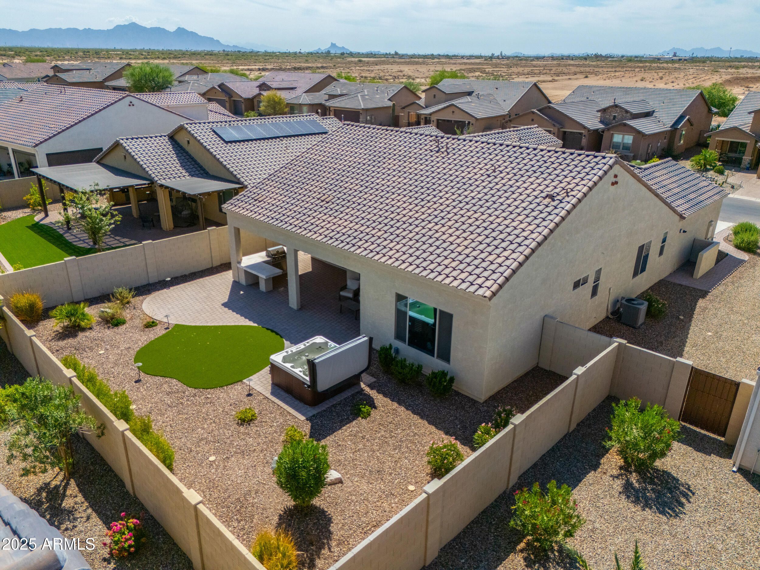 Highly upgraded FURNISHED MANDARA model w/flex room built in 2023. Gorgeous 2 bedrooms, 2 baths, Den + 2.5 car garage & extended driveway. Kitchen features upgraded arctic white cabinets w/knobs, quartz counters, gas range, farm sink, spacious walk-in pantry, under cabinet & pendant lights and stainless-steel appliances. Master has walk-in tiled shower & quartz vanity. Guest bedroom has tiled shower and quartz vanity. Upgrades include 8-foot doors throughout, 12''x24'' tile flooring, remote controlled interior blinds, whole house water system, laundry cabinets. Garage has epoxy and water softener. Step out back to the fully fenced backyard extended covered paver patio w/fans, can lights built in BBQ w/bar, artificial grass & hot tub. This home makes you feel like you're coming home.