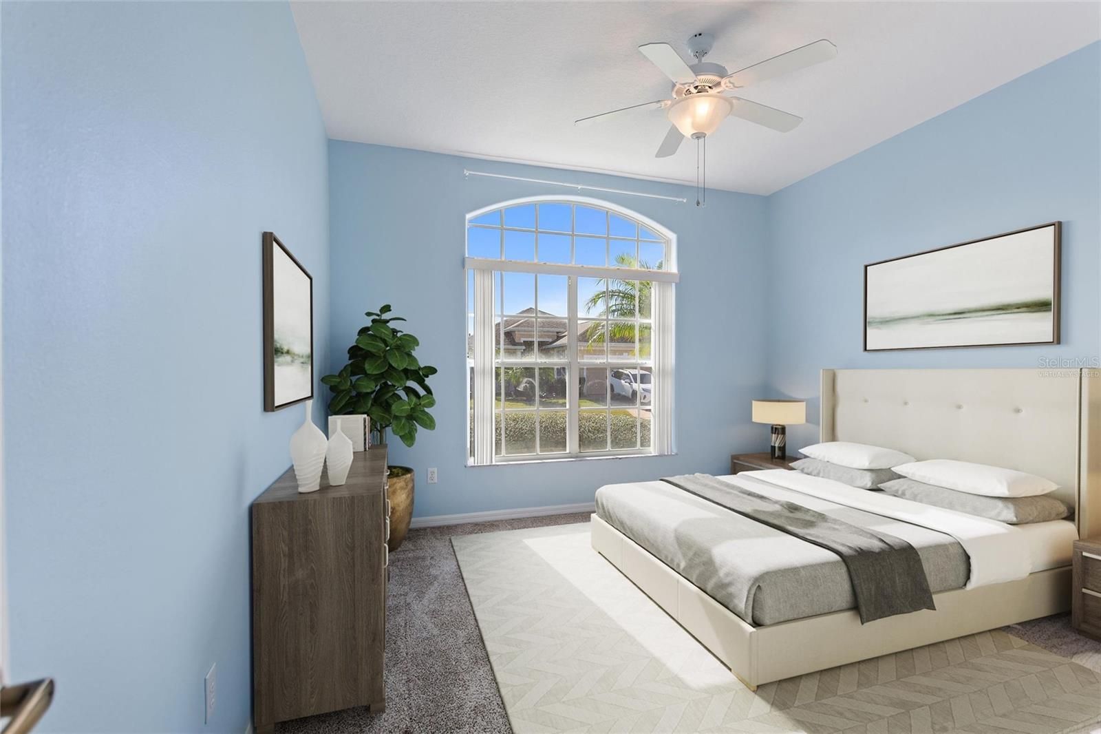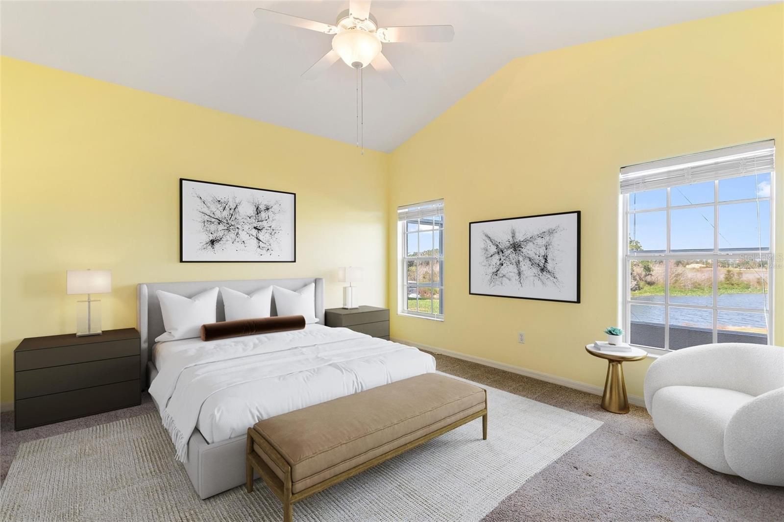 - Cathedral Ceiling(s), Ceiling Fan(s), Eat-in Kitchen, High Ceilings, Main Level Primary, Split Bedrooms, Stone Counters, Thermostat, Walk-In Closet(s), Window Treatments