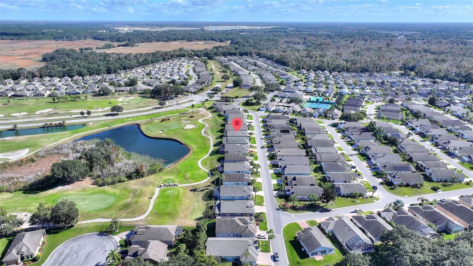One or more photo(s) has been virtually staged. GOLF COURSE and WATER VIEWS from the Ever-Popular RidgeDale 3/2 model with a 494 SF North-Facing Covered & Screened Lanai overlooking White Heron Golf Club Fairway #14 and located just 0.1 miles from the High Vista 55+ private clubhouse and amenity center. 12 FT ceiling in central Great Room with a wall of patio doors to screened lanai with decorative concrete floor. Eat-in kitchen has granite countertops, built-in desk and breakfast bar with pendant lighting, vaulted ceiling, closet pantry and broom closet. Cathedral ceiling in primary en suite bedroom with walk-in & linen closets and level-entry shower. Split bedroom design offers semi-private guest area with two bedrooms and full bathroom with a linen closet between them. Corridor laundry room to garage has utility sink and closet. Primary bathroom remodeled and water heater replaced in 2025; HVAC replaced 2020; Roof replaced 2015. Full-view leaded-glass front door with matching sidelight. Garage has electric screen, installed off-ceiling storage and pull-down ladder access to attic. Ridgewood Lakes is a golf cart friendly community. $230 monthly High Vista HOA fee includes Spectrum internet and basic cable TV with 2 cable boxes, lawn mowing and exclusive access to resident-owned 12,000 SF private High Vista clubhouse and amenities. $425 semi-annual Ridgewood Lakes HOA fee provides 24x7 staffed security gate and master association-owned private road maintenance. Adjacent to 18-hole White Heron Golf Club with The Nest restaurant, privately owned and open to the public. High Vista is a 55+ community with outdoor heated pool and spa, fitness center, library, pub & many organized activities. Pickle ball, tennis, bocce and shuffleboard courts. Miles of biking and walking trails within Ridgewood Lakes gated community. Shopping, Disney, Universal, Orlando & Central FL entertainment nearby, easy access to I-4, medical facilities, airports & Sunrail Station. Advent Health hospital is 3 miles away.