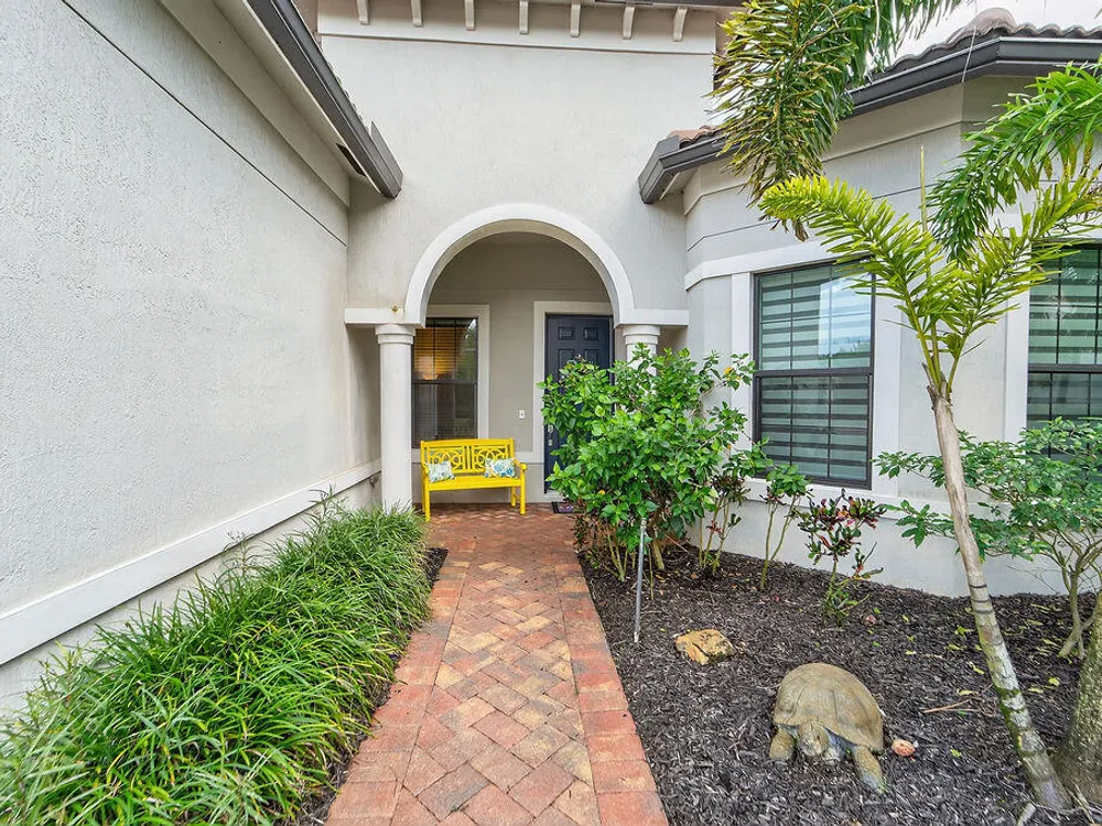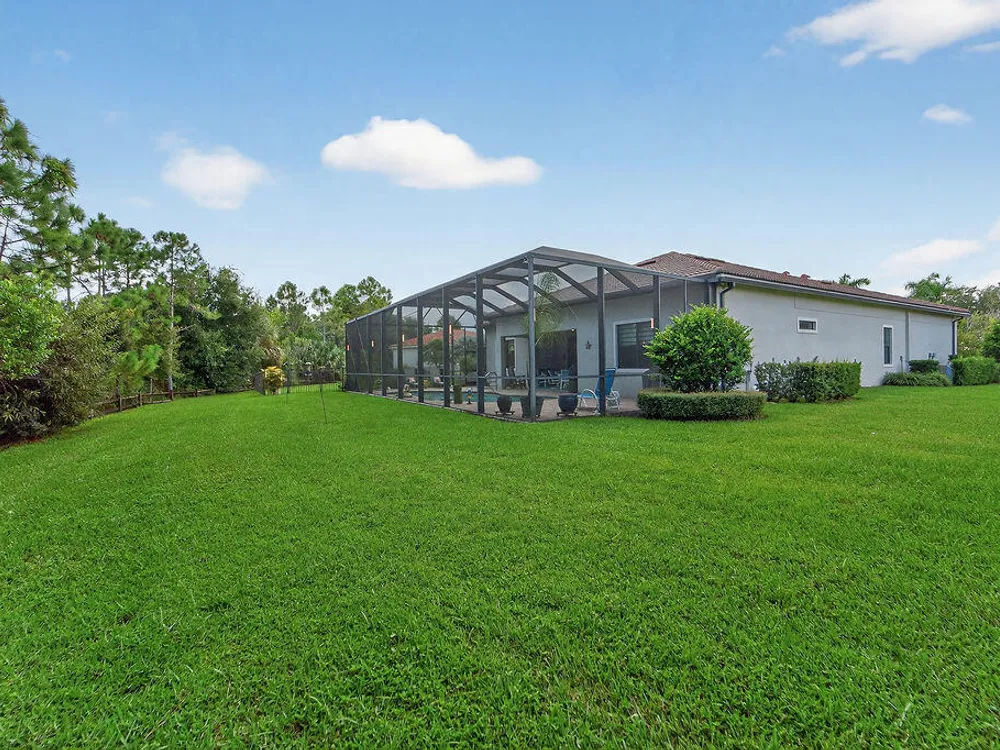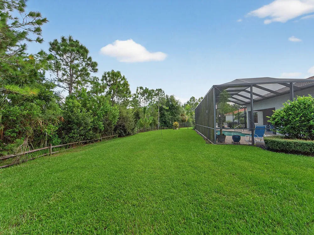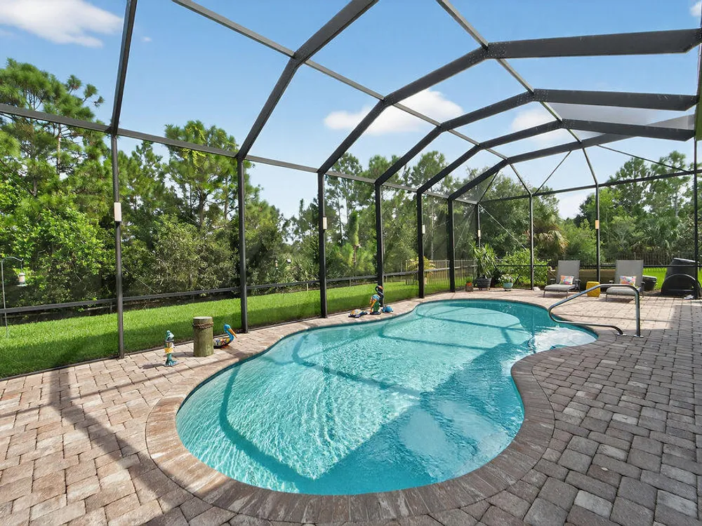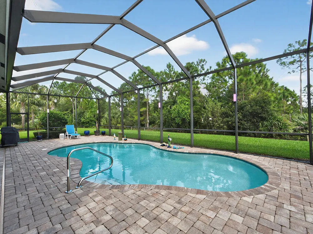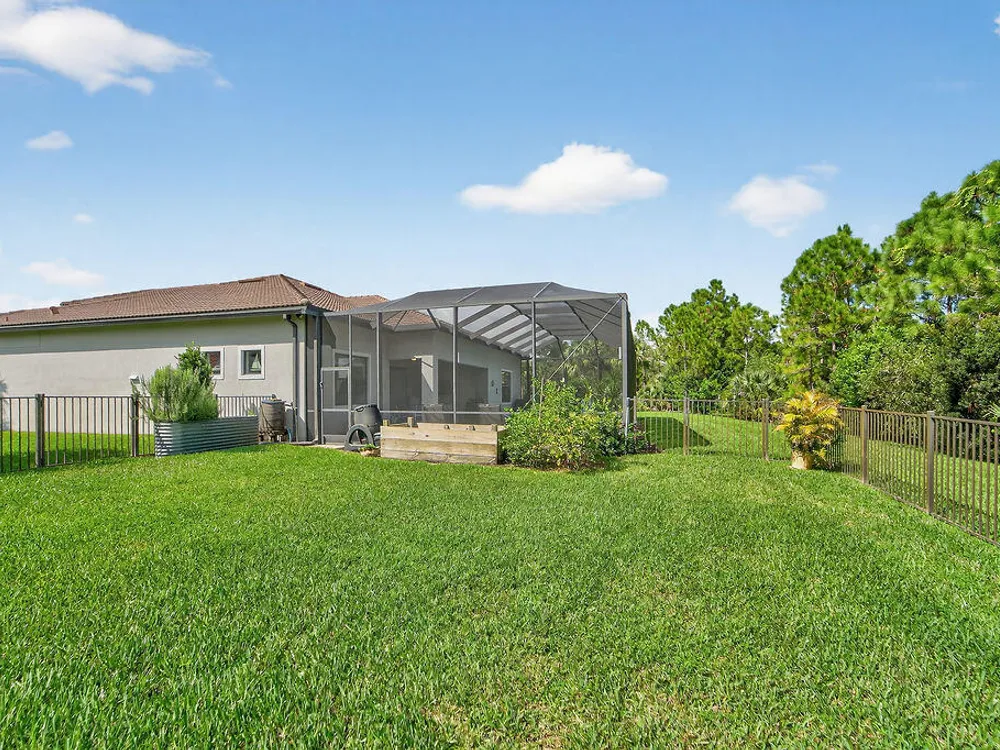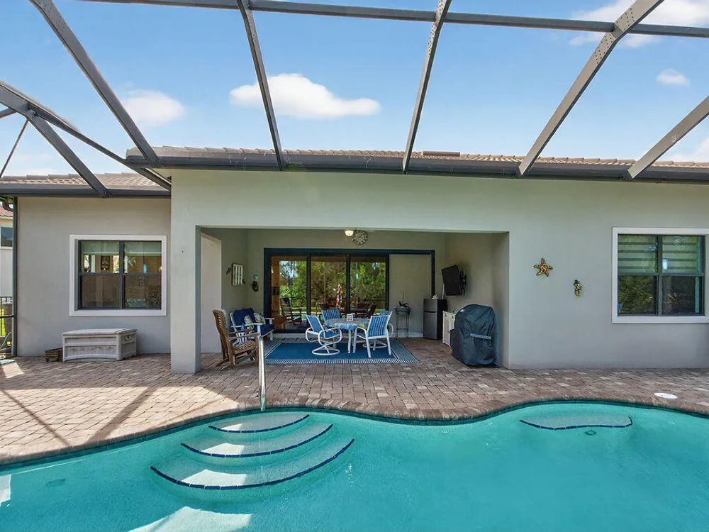 Welcome to Copperleaf - One of Palm City's Most Sought-After Communities!This beautifully maintained coastal themed Pulte Pinnacle model offers the perfect blend of luxury, comfort, and functionality--all on one spacious level. Nestled on a pie-shaped oversized lot, this 3-bedroom, 3-bath home (including 2 ensuite baths) features a split floorplan with a dedicated home office adorned with custom barn doors, ideal for work or quiet retreat.The heart of the home is the open-concept, upgraded kitchen, boasting taller cabinets, an expanded center island, and ample space for entertaining. Impact windows throughout offer peace of mind, while allowing natural light to pour in.Step outside to your private, screened pool area with crosswind heat pump. The serene