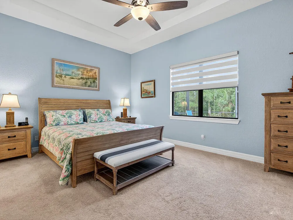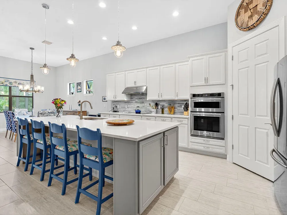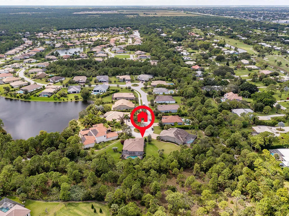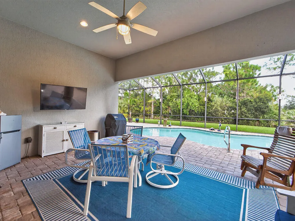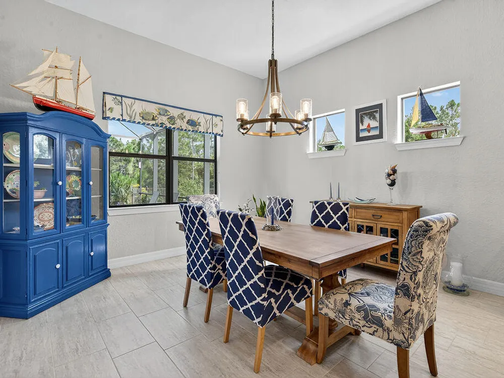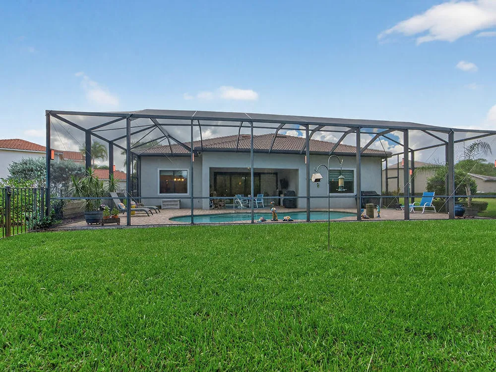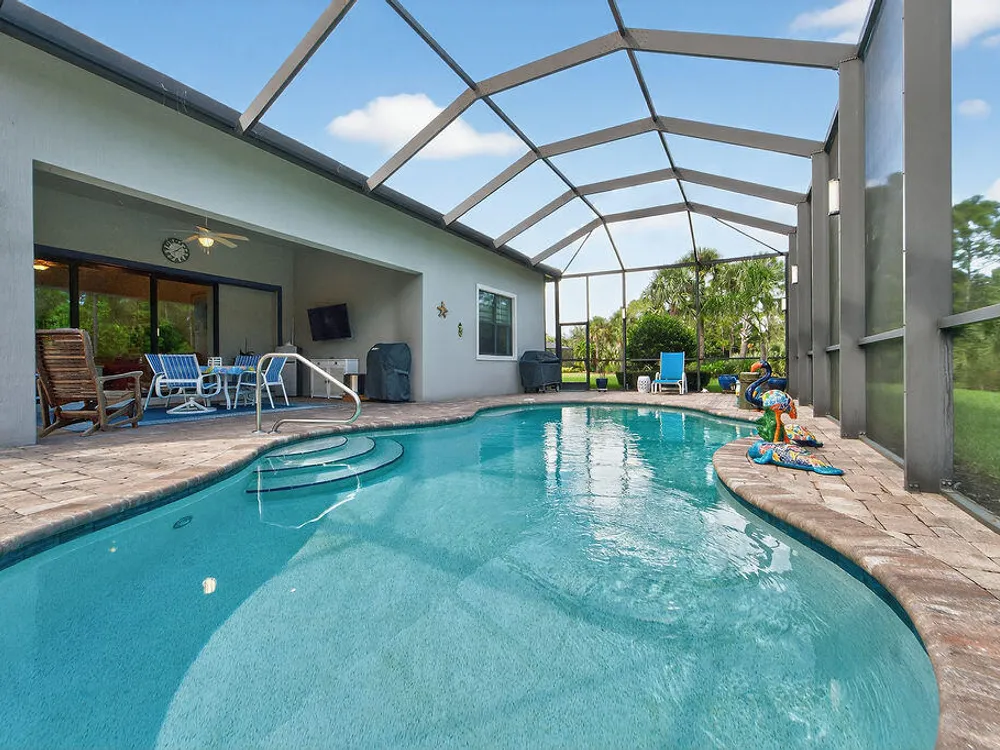 Welcome to Copperleaf - One of Palm City's Most Sought-After Communities!This beautifully maintained coastal themed Pulte Pinnacle model offers the perfect blend of luxury, comfort, and functionality--all on one spacious level. Nestled on a pie-shaped oversized lot, this 3-bedroom, 3-bath home (including 2 ensuite baths) features a split floorplan with a dedicated home office adorned with custom barn doors, ideal for work or quiet retreat.The heart of the home is the open-concept, upgraded kitchen, boasting taller cabinets, an expanded center island, and ample space for entertaining. Impact windows throughout offer peace of mind, while allowing natural light to pour in.Step outside to your private, screened pool area with crosswind heat pump. The serene