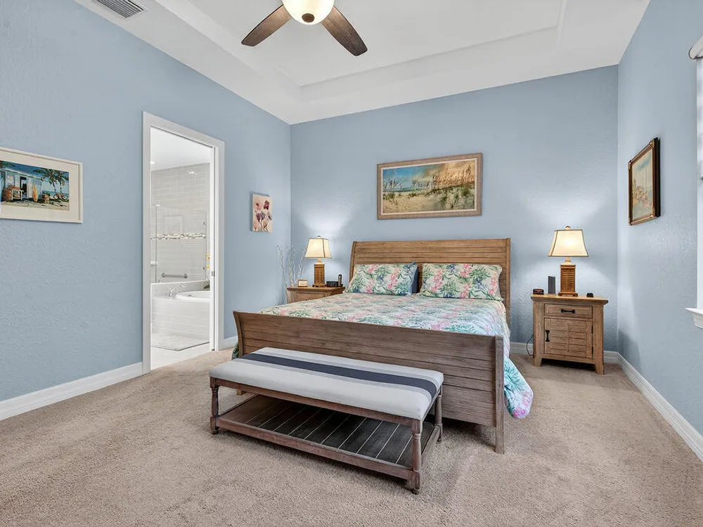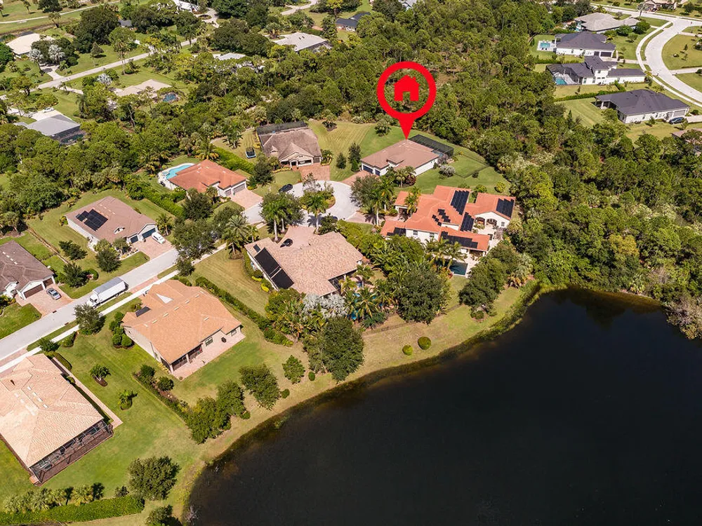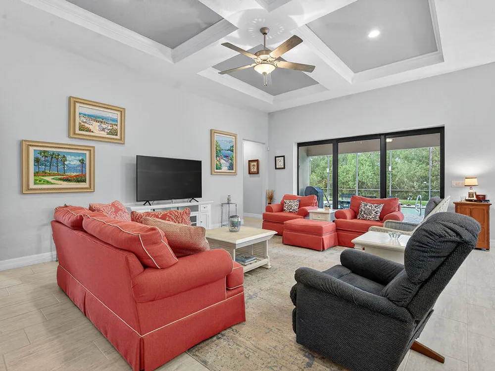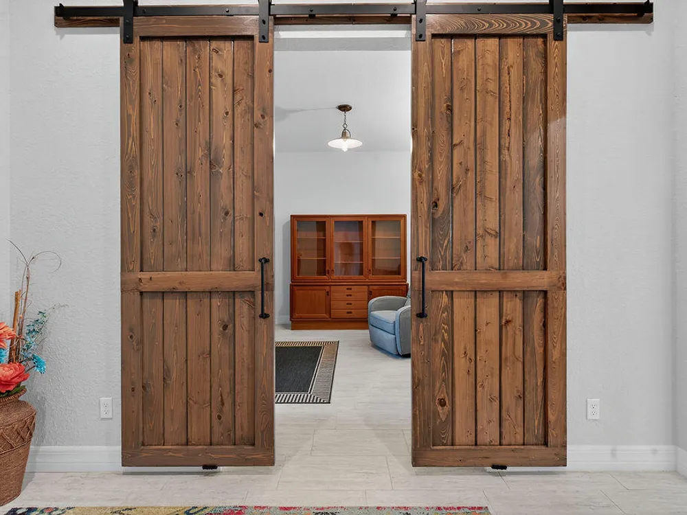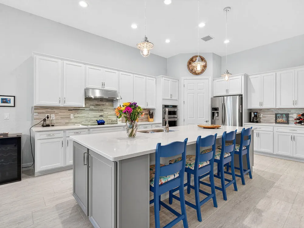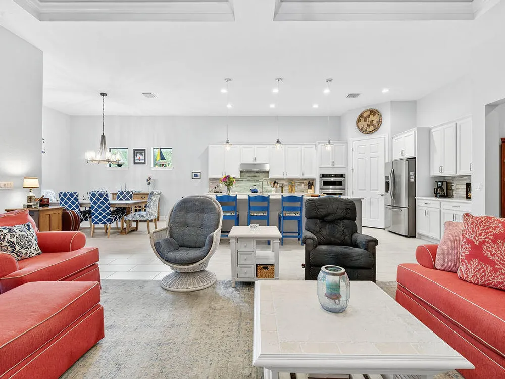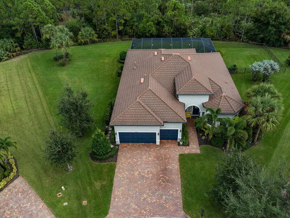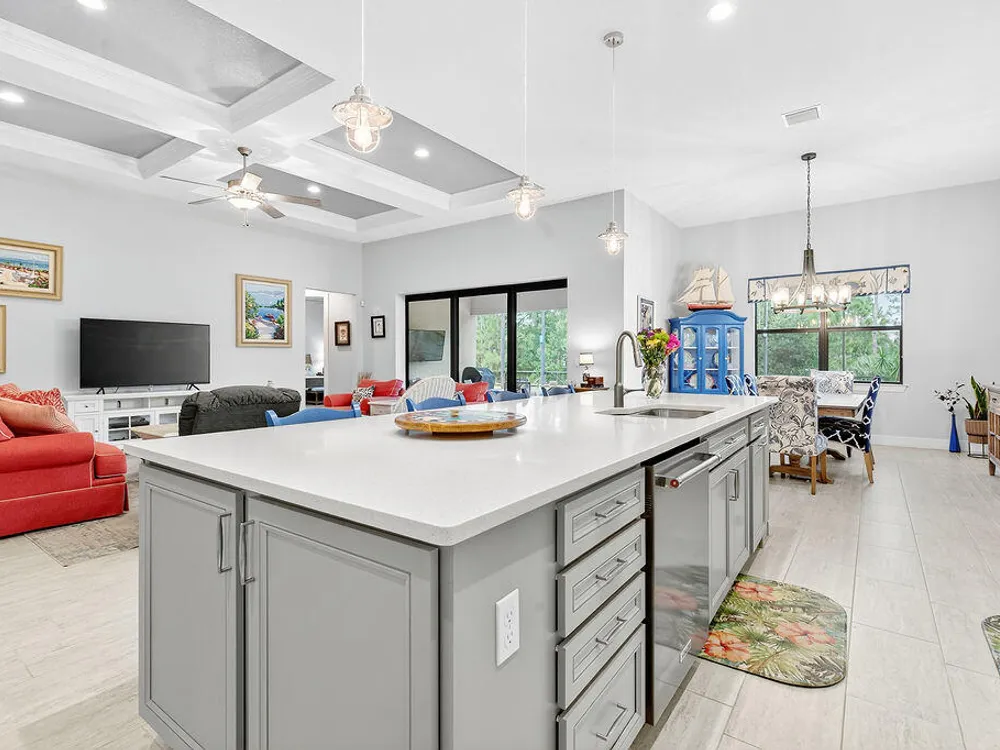 Welcome to Copperleaf - One of Palm City's Most Sought-After Communities!This beautifully maintained coastal themed Pulte Pinnacle model offers the perfect blend of luxury, comfort, and functionality--all on one spacious level. Nestled on a pie-shaped oversized lot, this 3-bedroom, 3-bath home (including 2 ensuite baths) features a split floorplan with a dedicated home office adorned with custom barn doors, ideal for work or quiet retreat.The heart of the home is the open-concept, upgraded kitchen, boasting taller cabinets, an expanded center island, and ample space for entertaining. Impact windows throughout offer peace of mind, while allowing natural light to pour in.Step outside to your private, screened pool area with crosswind heat pump. The serene
