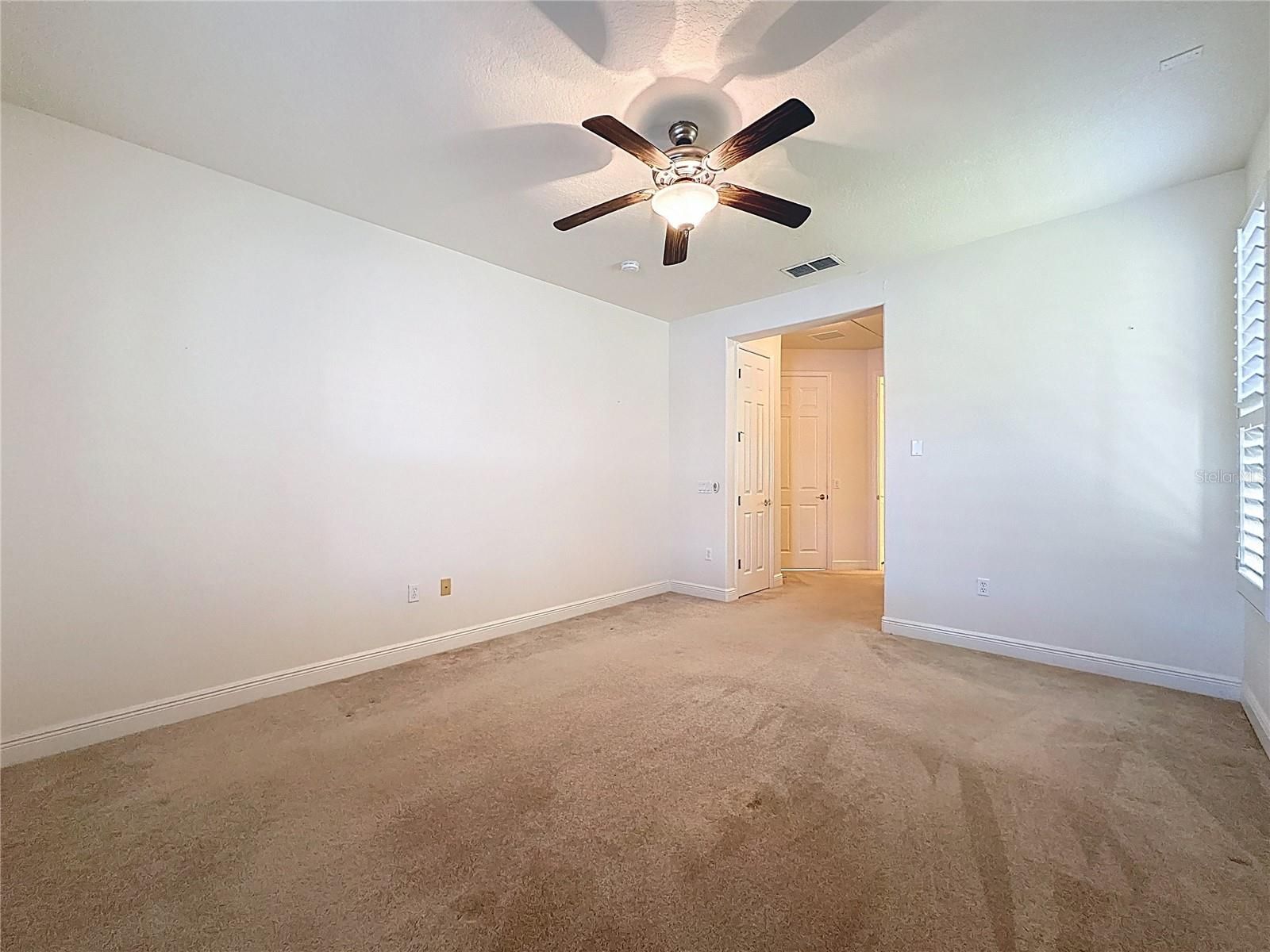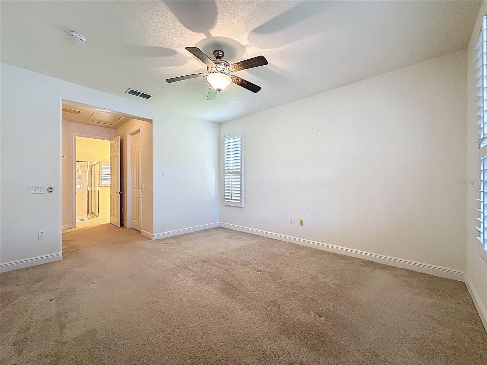 - Ceiling Fan(s), Eat-in Kitchen, Kitchen/Family Room Combo, Open Floorplan, Upper Level Primary, Solid Surface Counters, Split Bedrooms, Stone Counters, Thermostat