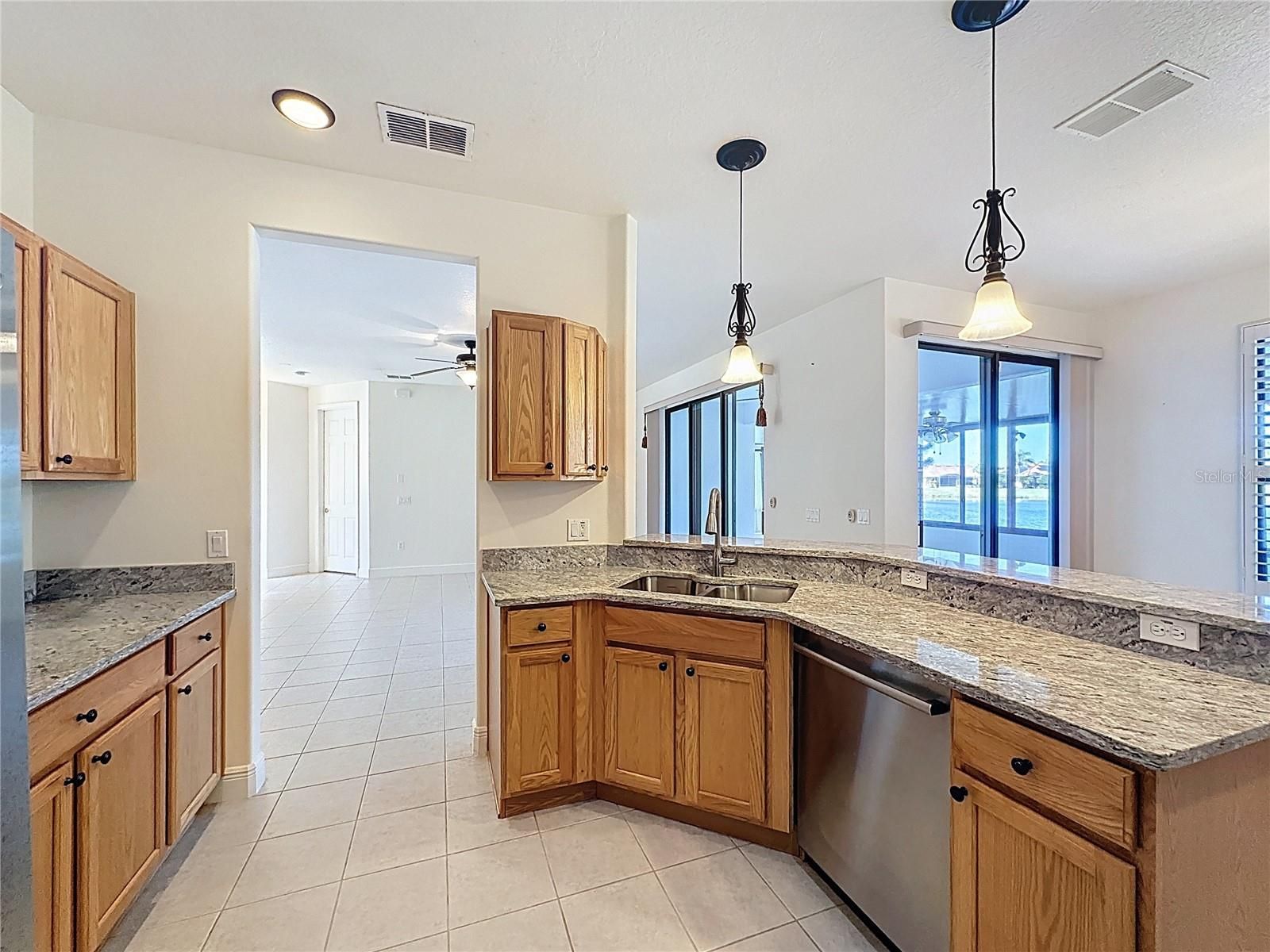 Rarely available Port Royal model situated on an extra-wide waterfront lot offering exceptional privacy and serene, panoramic water views. The expanded, glass-enclosed Florida Room is thoughtfully designed to maximize the picturesque setting, complemented by a spacious glass-enclosed patio ideal for relaxing or entertaining. Inside, ceramic tile flows throughout the main living areas, with plush carpet in the bedrooms and den. The den features elegant double doors, while designer lighting, ceiling fans, plantation shutters, and custom finishes enhance the home’s refined appeal. The well-appointed kitchen showcases upgraded cabinetry with pull-out drawers, a flat-top range, pendant lighting, and a side-by-side refrigerator with water and ice. Additional upgrades include surround-sound wiring, adult-height vanities, comfort-height toilets, a whole-house water softener, and energy-efficient solar panels. The garage is equally impressive with a glass-insert door and epoxy-coated floor. Located in award-winning Solivita, a premier 55+ golf community offering championship golf courses, heated pools, state-of-the-art fitness center, clubhouse, on-site restaurants, and the popular Palms Recreation Area.
