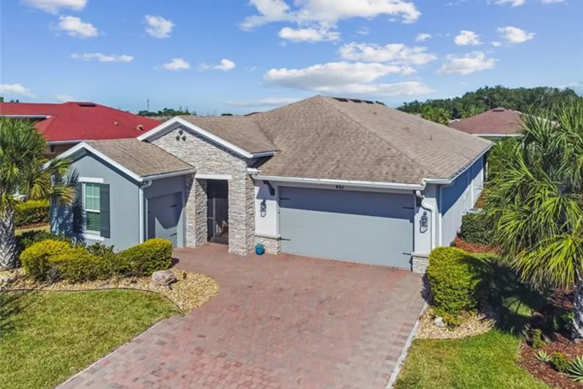Beautiful Cambria model featuring 3 bedrooms, 2.5 baths, and a GOLF CART GARAGE with a mini-split HVAC system, located in the highly desirable Treviso neighborhood of Solivita. The stone façade adds timeless curb appeal and complements the WIDENED DRIVEWAY. This stunning home welcomes you with TRAY CEILINGS, a leaded-glass front door, and an OPEN-CONCEPT floor plan leading into the gourmet kitchen. Wood-look PLANK TILE flooring flows throughout, complemented by neutral wall tones. The kitchen features 42" cabinets with LOWER PULL-OUT shelves, a travertine stone backsplash, QUARTZ countertops, a closet pantry, and a breakfast bar. The spacious PRIMARY SUITE offers incredible storage with TWO WALK-IN closets featuring custom built-ins and TWO additional linen closets. The ENSUITE BATH includes a TILED WALK-IN shower with BENCH seating, raised vanities, and DUAL SINKS. A conveniently located HALF BATH includes a LINEN closet for added storage. At the front of the home, a junior GUEST SUITE includes its own private bath, ideal for visiting guests. The third bedroom, with double FRENCH GLASS DOORS, can easily serve as a hobby room or media room. The garage features EPOXY FLOOORING, pull-down attic stairs, and an overhead storage rack. The DROP ZONE entry from the garage adds convenience with custom cabinetry and counter space. The laundry room includes a UTILITY SINK, upper and lower cabinetry, and the WASHER and DRYER are included in the sale. The EXTERIOR of the home was FRESHLY PAINTED in FALL of 2024. Enjoy peaceful mornings or relaxing evenings on the EAST-facing COVERED and SCREENED lanai overlooking the FENCED yard, where the addition of TREES enhances privacy and complements the natural setting. The yard also features a puppy picket addition for the safety of small pets. The HOA: - maintains the LANDSCAPING & IRRIGATION systems in the common areas as well as at individual homesites - maintains the roads throughout the community - PROVIDES SECURITY with gate guards and mobile patrols including the Polk County Sheriff - allows AUTOMATED GATE ACCESS for residents via license plate readers - provides residents with Fiber Optic Internet & TV service.***Poinciana Lakes Plaza is a MAJOR NEW SHOPPING CENTER that opened directly across from the Solivita Main Gate in Summer of 2024. It features Sprouts Grocery, TJ MAXX, Ross, Burlington, Rack Room Shoes, 5 Below, Ulta, Outback, First Watch, 5 Guys, Urgent Care, Dentist, TD Bank, Petco & Hair Cuttery PLUS MORE TO COME.***