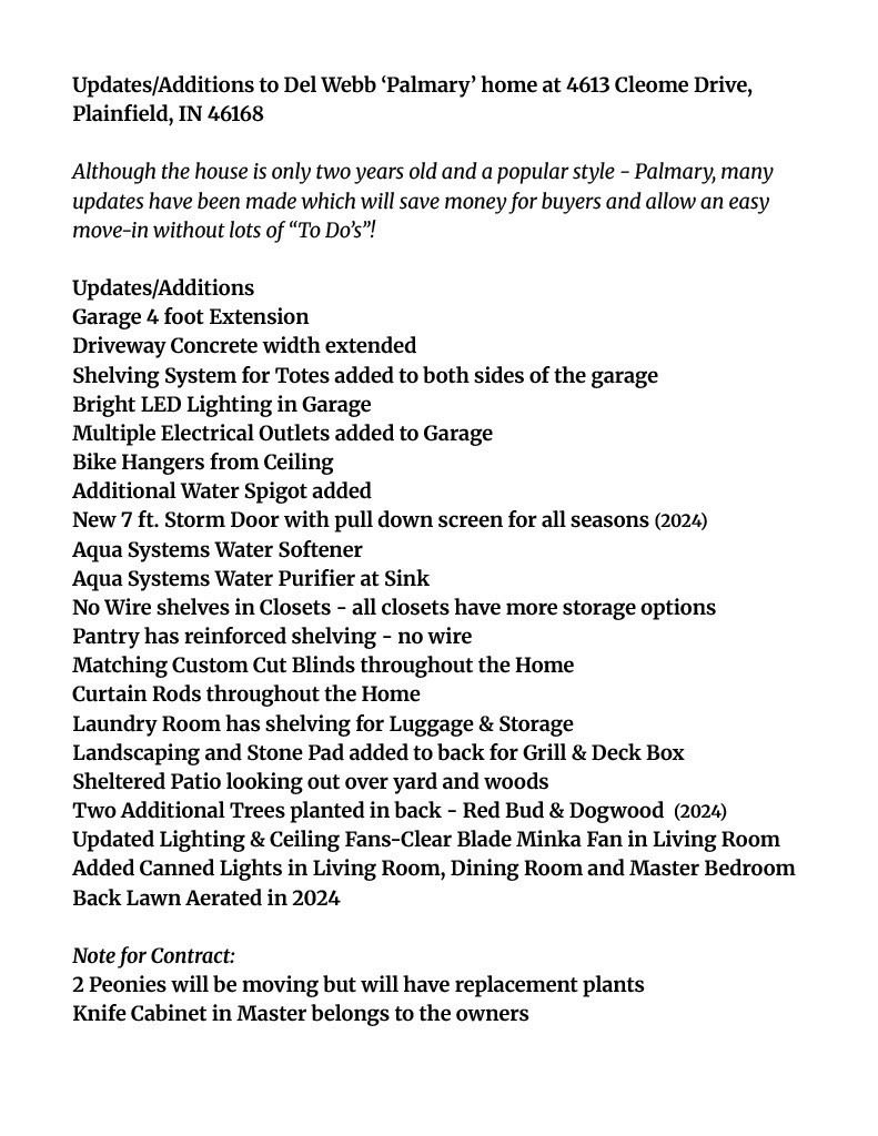 BOOM !!! a piece of heaven tucked away in the best suburb in Indy, Plainfield. This Del Webb home is waiting to be your next adventure, and it's looking Absolutely Fabulous! Imagine yourself whipping up culinary masterpieces in a kitchen that's practically begging for a party, featuring a large kitchen island that's perfect for spreading out a feast or just enjoying a casual breakfast, all surrounded by stylish shaker cabinets and a fantastic kitchen bar where guests can perch and admire your skills. Step into a bathroom that feels like a spa day every day, complete with a tiled walk-in shower that promises to wash away all your worries and a double vanity that makes morning routines a breeze! Although the house is only two years old, built 2023, and a popular style - Palmary, many updates have been made which will save money for buyers and allow an easy move-in without lots of "To Do's"! With 2051 square feet of living space, this home has 3 bedrooms and 2 full bathrooms, providing ample space to stretch out and relax. The open floor plan is perfect for entertaining. This home is a modern dream come true. Updates/Additions Garage 4 foot Extension, Driveway Concrete width extended, Shelving System for Totes added to both sides of the garage, Bright LED Lighting in Garage, Multiple Electrical Outlets added to Garage, Bike Hangers from Ceiling, Additional Water Spigot added, New 7 ft. Storm Door with pull down screen for all seasons (2024), Aqua Systems Water Softener, Aqua Systems Water Purifier at Sink, No Wire shelves in Closets - all closets have more storage options, Pantry has reinforced shelving - no wire, Matching Custom Cut Blinds throughout the Home, Curtain Rods throughout the Home, Laundry Room has shelving for for Luggage & Storage, Landscaping and Stone Pad added to back for Grill & Deck Box, Sheltered Patio looking out over yard and woods, Two Additional Trees planted in back - Red Bud & Dogwood, Updated Lighting, Ceiling Fans-Clear Blade, 2much2L